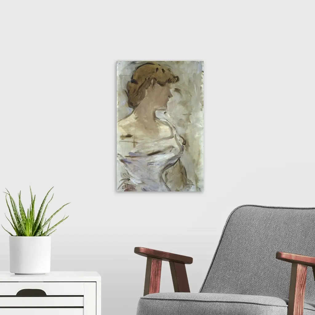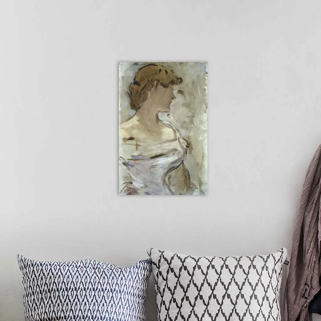 Originally oil on canvas. This rapidly executed and delicately coloured sketch was sold with the contents of Manet?s studio in 1884. Large areas of the canvas have been left unpainted, but Manet managed to suggest the slight turn of the woman?s body and the outline of her dress with a few quick brush strokes. Behind the woman the profile of a second ? male ? figure is just visible. The sitter has been identified as Marguerite de Conflans, whose family had close ties with the Manets.
