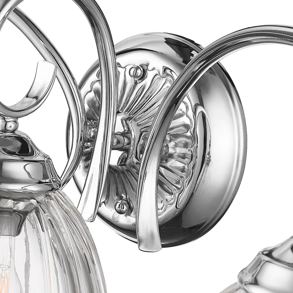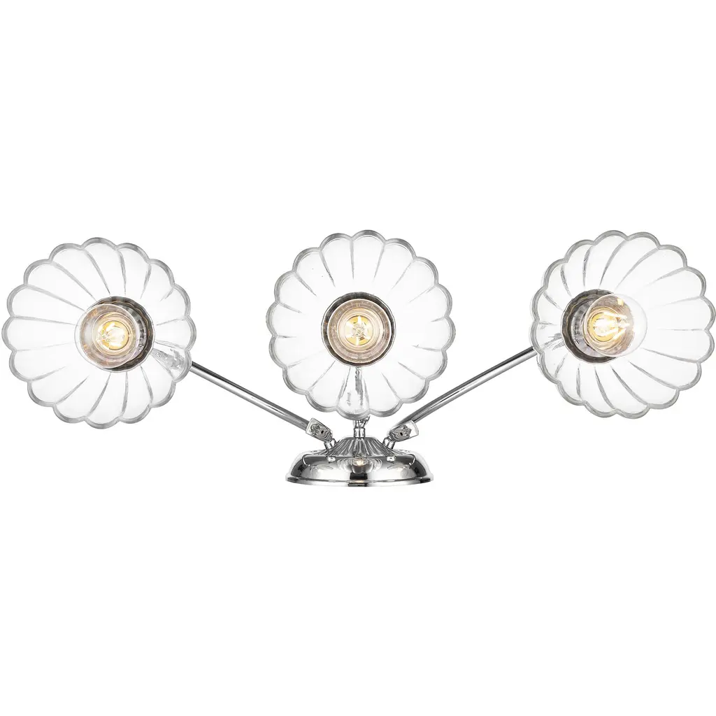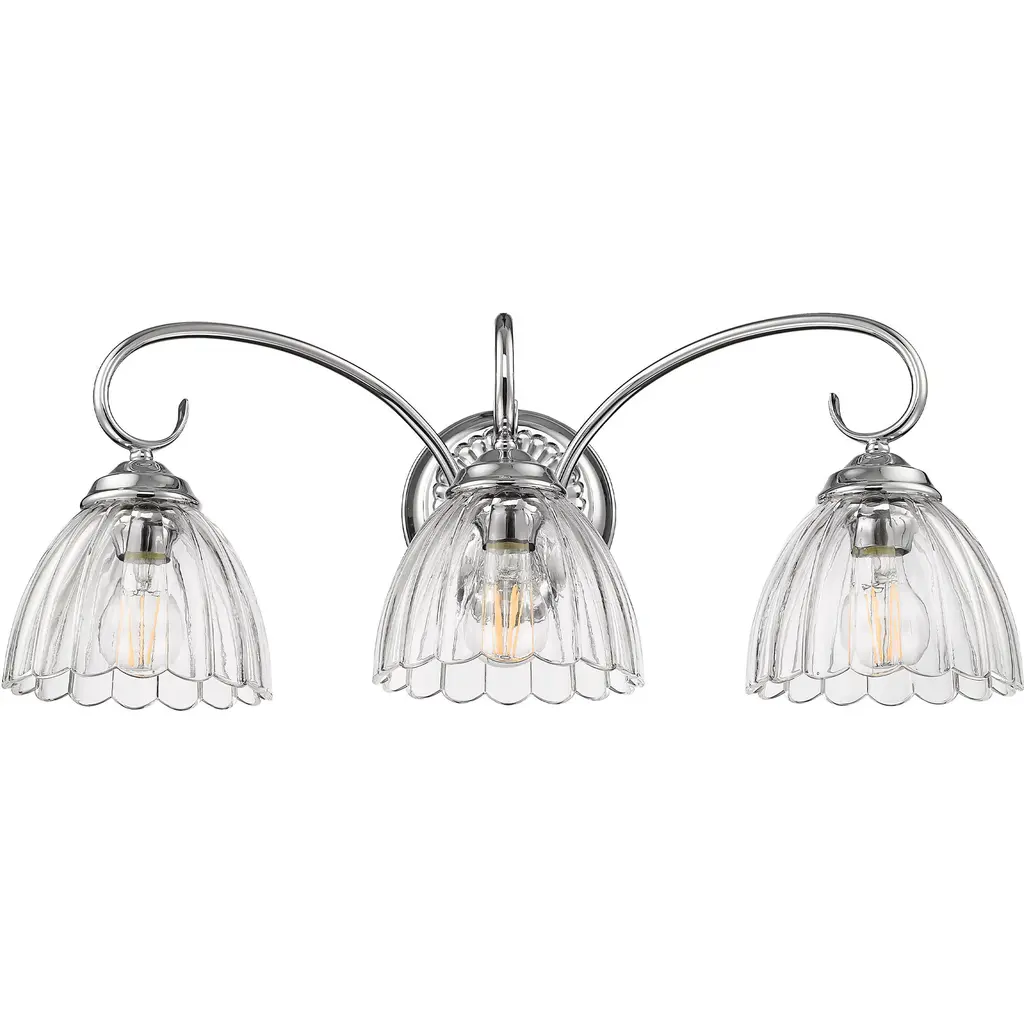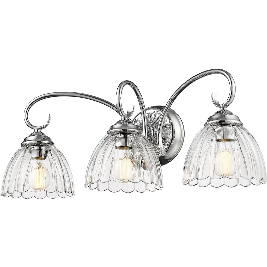 Bring glam elegance into your home with the Golden Lighting Audra 3-light Vanity. Featuring a glass shade and a polished Chrome frame, it creates a welcoming atmosphere. The clear glass shade showcases a brilliant, unobstructed light, perfectly complementing the fixture's design. Crafted with a brilliant and timeless Polished Chrome finish, its highly reflective surface adds a stunning shine and integrates seamlessly into various decor styles.Brighten up bathrooms with dedicated lighting that flatters while providing practical task illumination. Rated for damp locations, this fixture is suitable for covered and semi-enclosed spaces like bathrooms and laundry rooms. Requires 3 E26 Medium base bulbs (not included), with a maximum wattage of 60 per bulb. Overall dimensions are 25.5"W x 9.63"H x 9.5"D. Experience the perfect fusion of style and functionality, and upgrade your home's look with this luxurious vanity light.