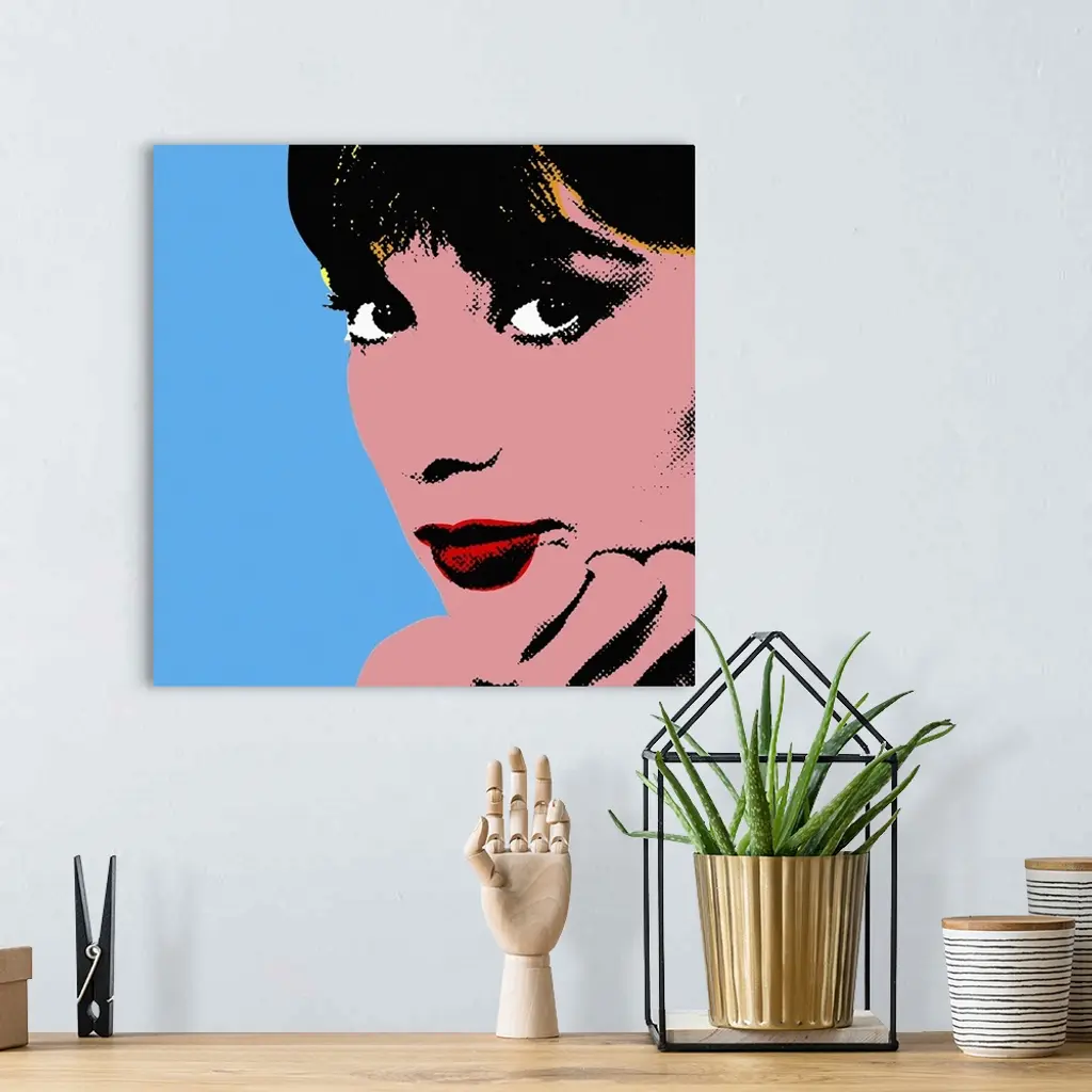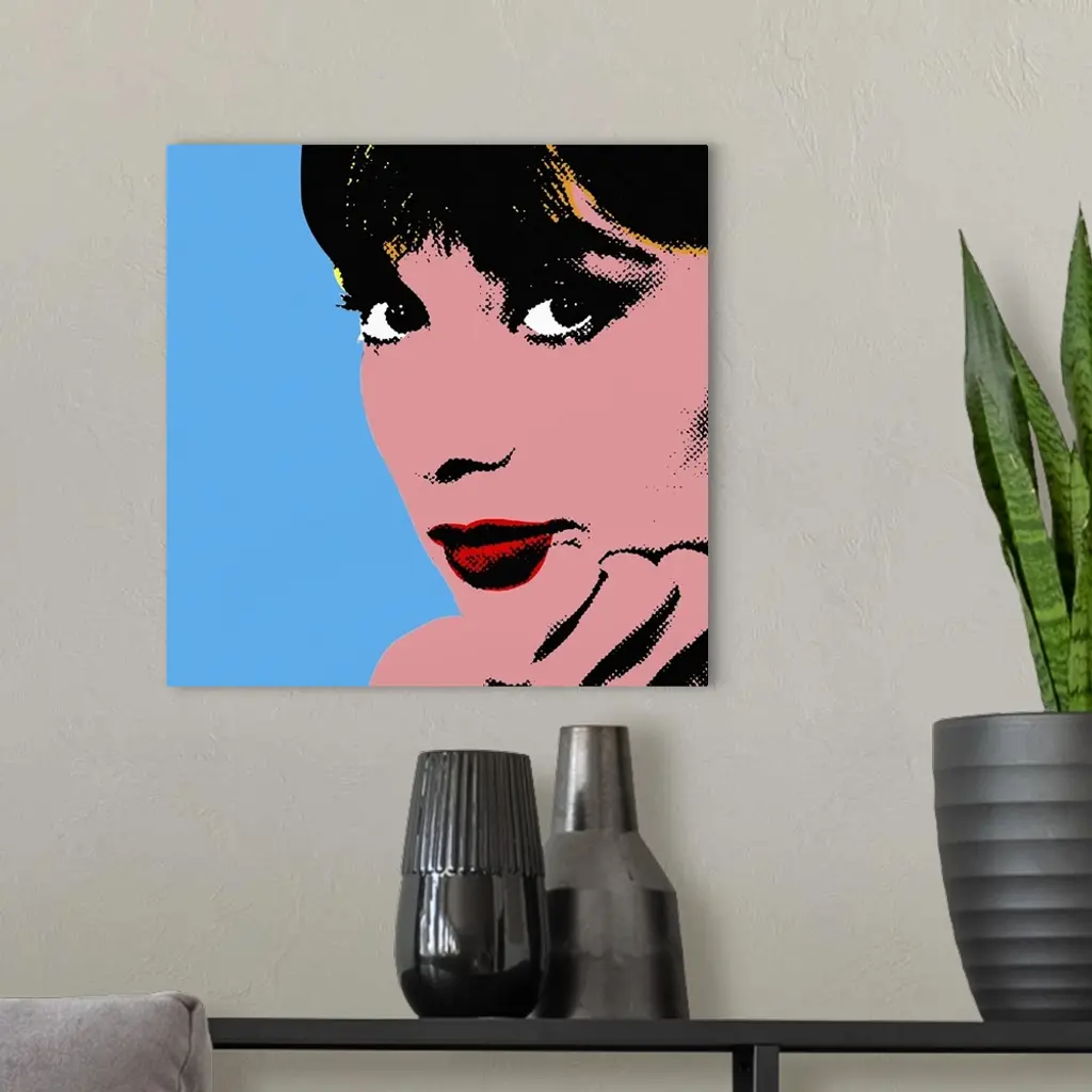 Retro artwork of Audrey Hepburn where only her face and hand holding it up are shown.