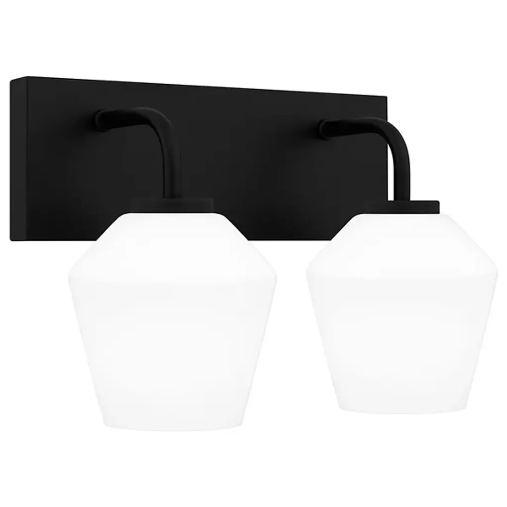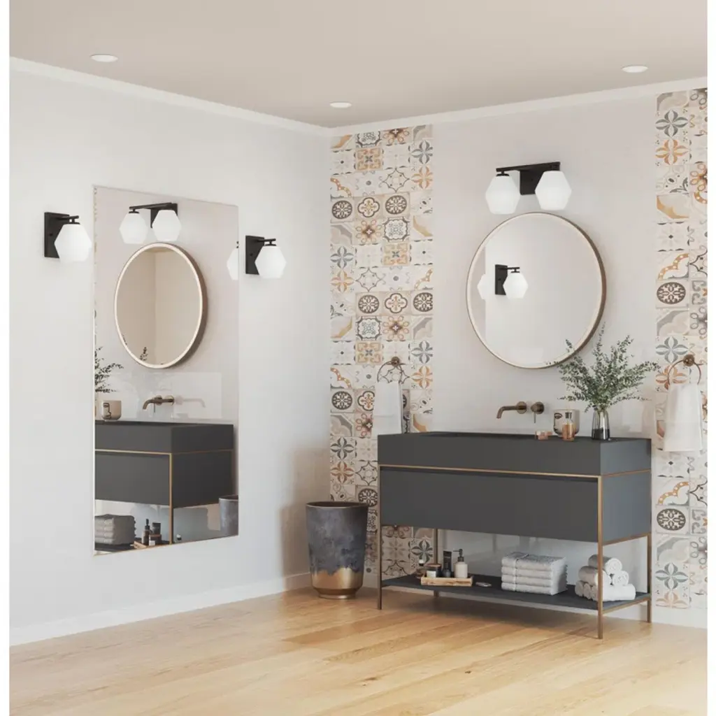 This 2-light vanity fixture outfits your bathroom or powder room with plenty of illumination and modern style. Made from steel with a solid finish, it includes a rectangular backplate and a horizontal bar that attaches to the two lights. Resting on a corresponding holder is a frosted opal glass shade that's shaped like a diamond, giving off a tempered ambient glow and a mid-century vibe. Two dimmable 75W max bulbs are sold separately, and you can install it up or down depending on your preference. Rated for damp locations, this vanity light is safe to use in high-moisture environments.