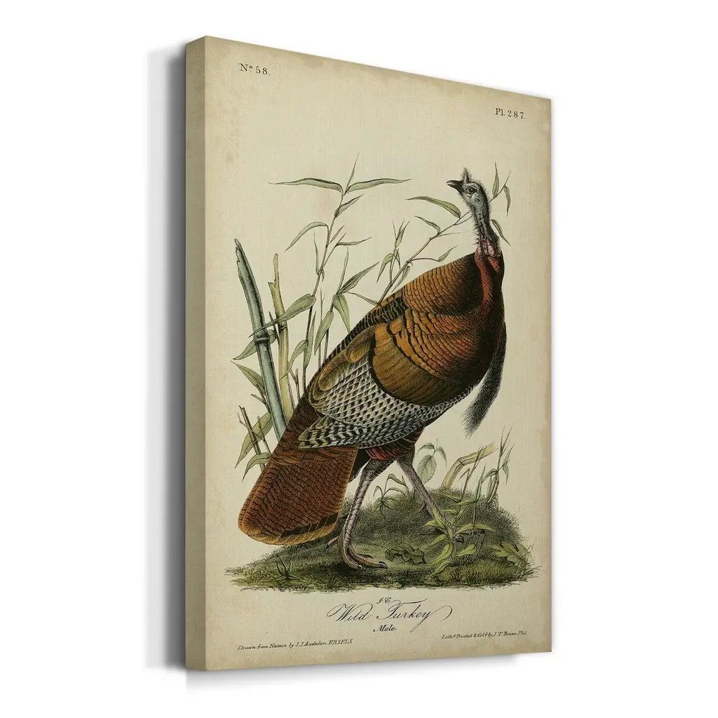 Audubon Wild Turkey Premium Gallery Wrapped Canvas - Ready to Hang A premium hand stretched gallery wrapped canvas print created to last. Featuring a beveled a solid wood stretcher bar, each piece comes ready to hand 5 SIZES AVAILABLE 8''X12'' - Overall Size 16'X20'' - Overall Size 24''x32'' - Overall Size 30''x40'' - Overall Size 36''x48'' - Overall Size Each piece is made to order. Built to Last Each piece comes ready to hang Solid wood stretcher Fade and Water resistant Made domestically