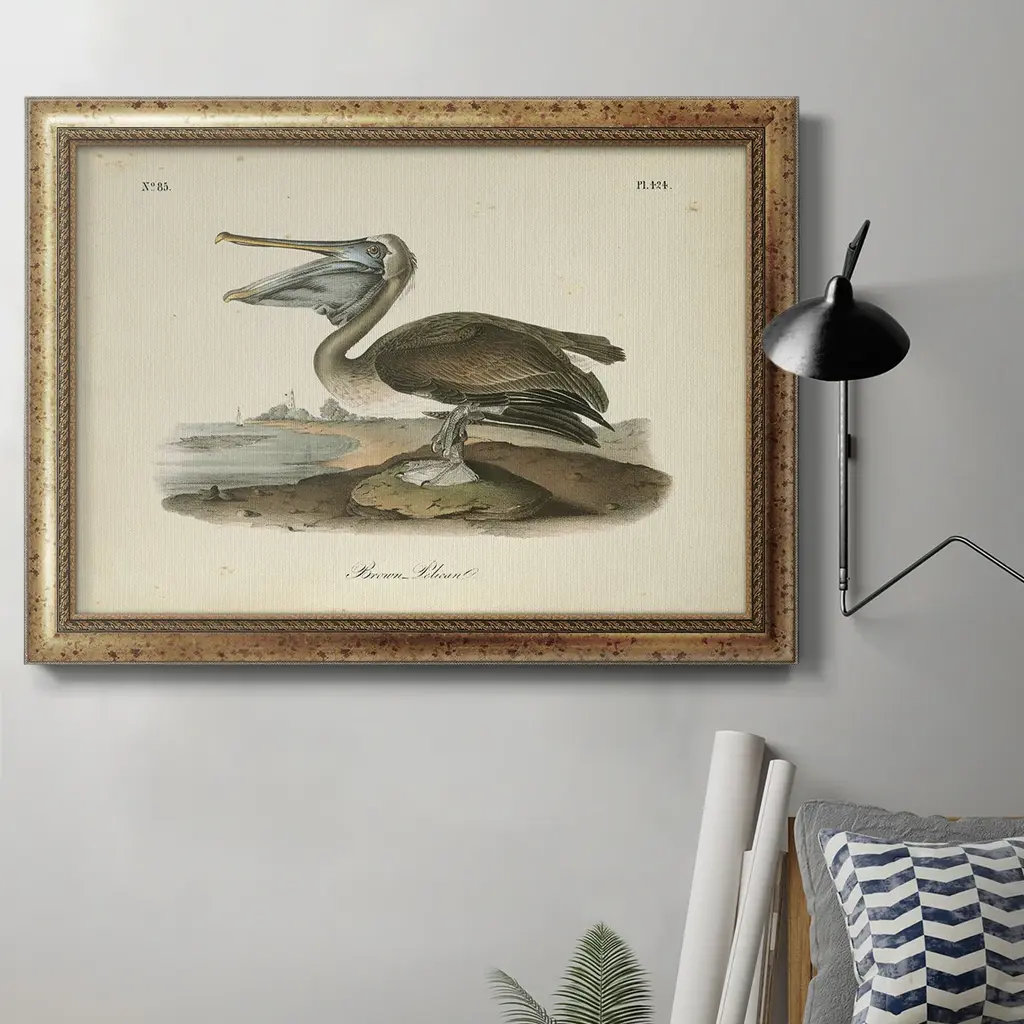Audubons Brown Pelican Premium Framed Canvas- Ready to Hang A Premium Framed Canvas created to last. Framed in distressed wood and available in an array of sizes and colors Featuring a beveled a solid wood stretcher bar, each piece comes ready to hand 3 SIZES AVAILABLE 16''X20'' - Overall Size 18'X27'' - Overall Size 24''x36'' - Overall Size Each piece is made to order. Each piece comes with hanging hardware. Made in the USA Ready to Hang Giclee Paper Print Acrylic Glass Beveled Matt Board