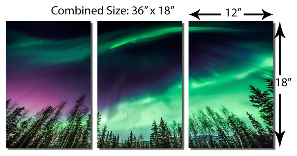 36" x 18" total size. Ready To Hang! (3 pieces - 12" x 18" each). 3 Panel Split, Triptych Metal Print Aurora Borealis. Green and purple Northern Lights over trees, near Fairbanks, Alaska. Modern metal wall art for home or office wall decor. Printed on Luxurious, HD aluminum glossy metal panels. Multi panel art.. HD aluminum panels. Metal print wall art. Includes Shadow Wall Mount on the back.• Aluminum Metal Wall Art• Made in USA• Ready to hang - No assembly required• Shadow mount hardware on the back• 0.045" thick HD Aluminum Panels• Scratch resistant, glossy finish• Superb color clarity, luxurious prints• Epson printing process• For indoor or moisture rich environment use• Easy to clean. Gently wipe with microfiber cloth.