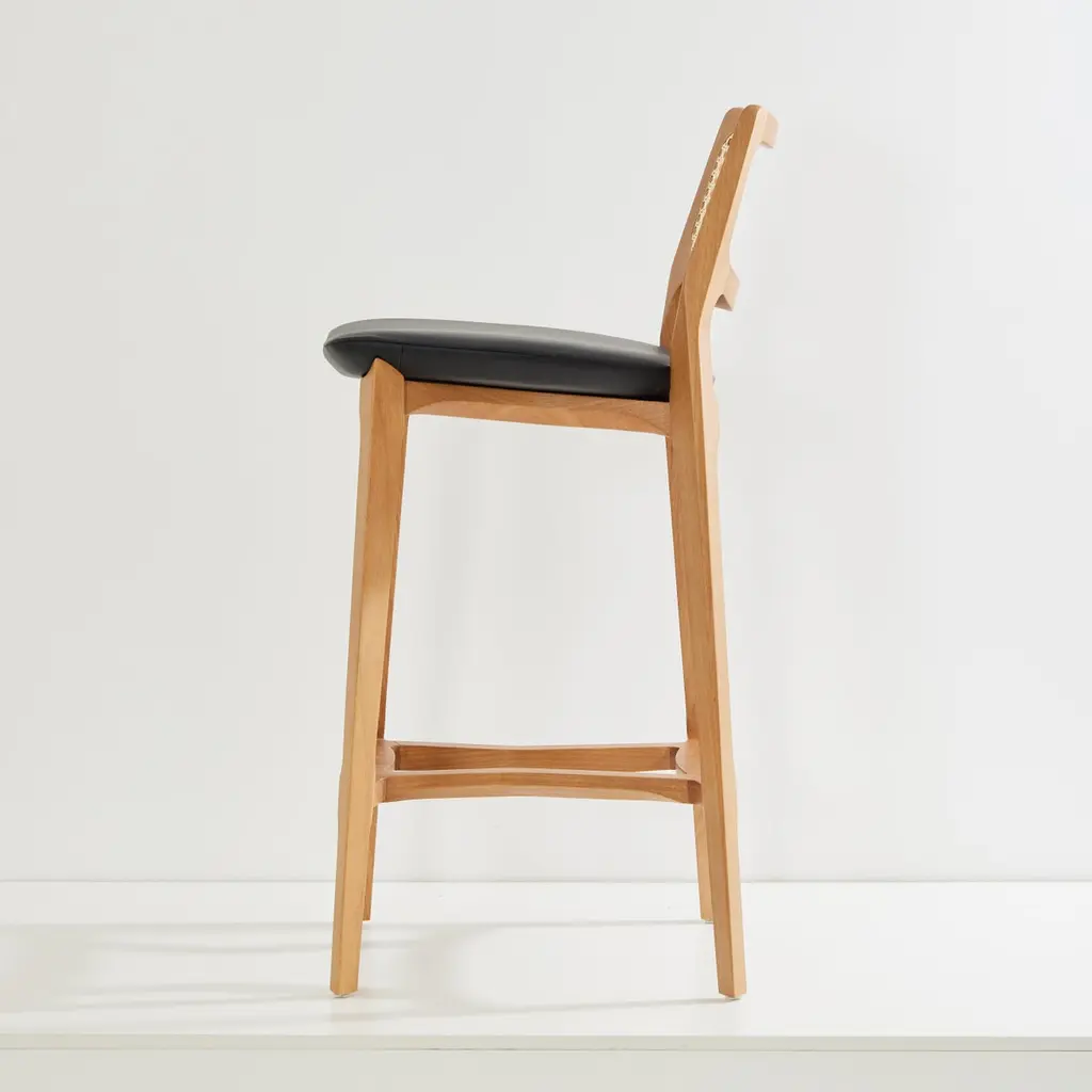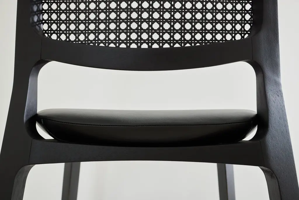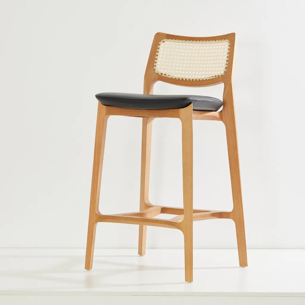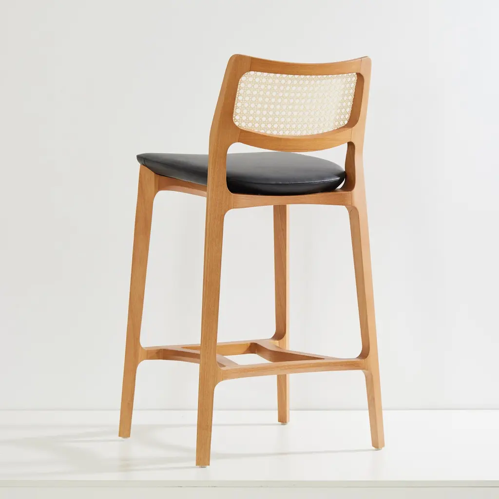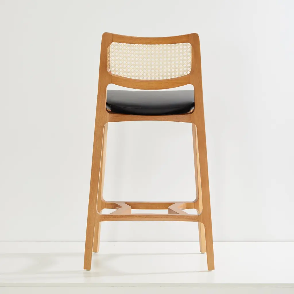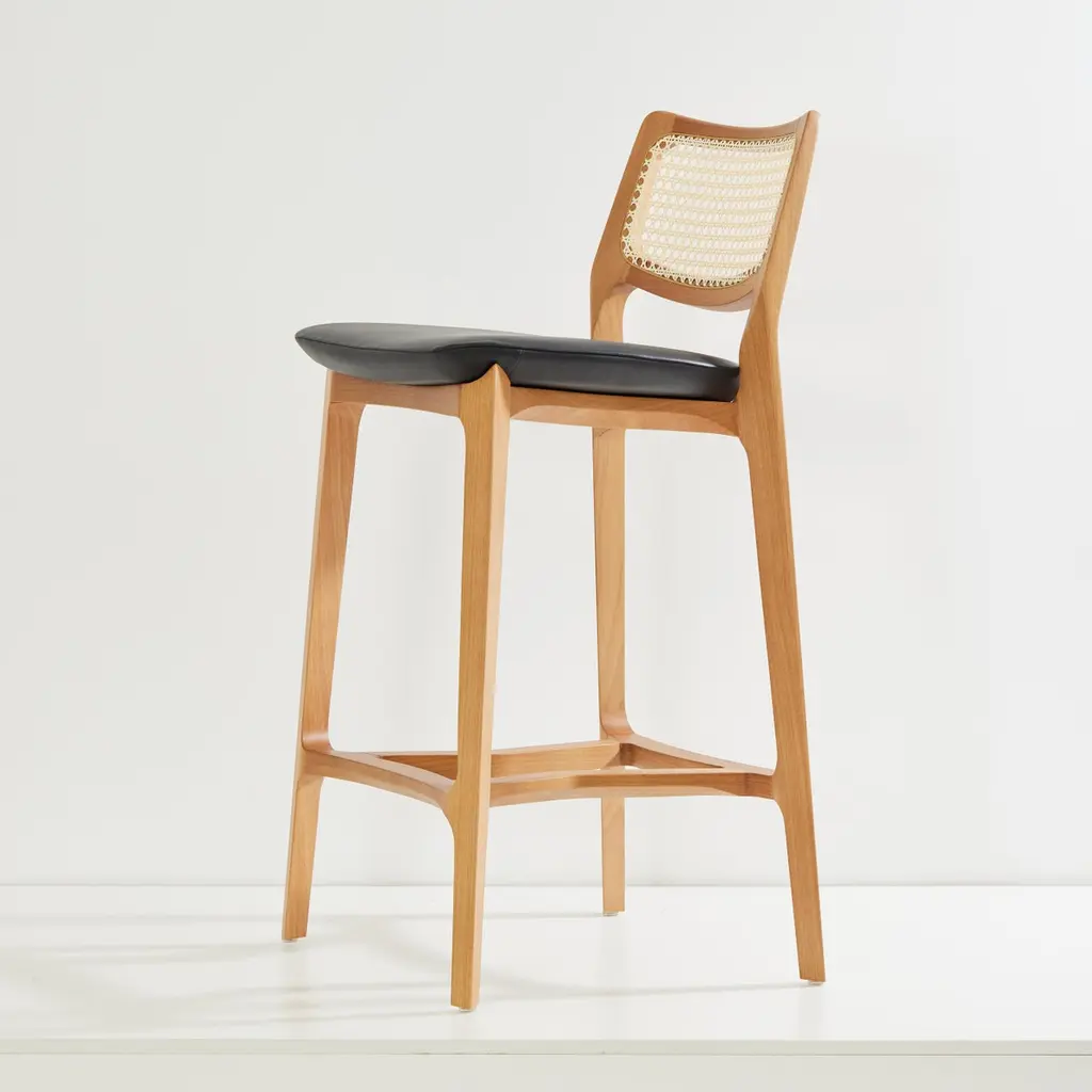 Aurora Stool, Light Honey Solid Wood, Natural Caning Back, Black Natural Leather