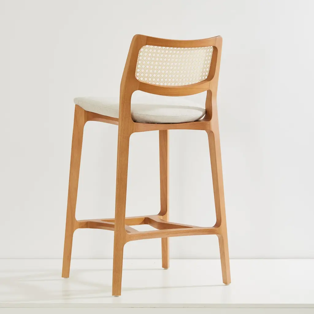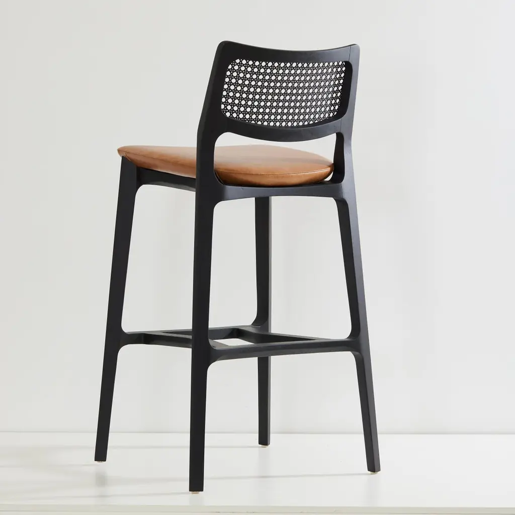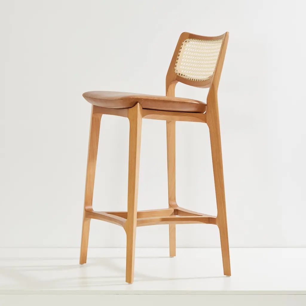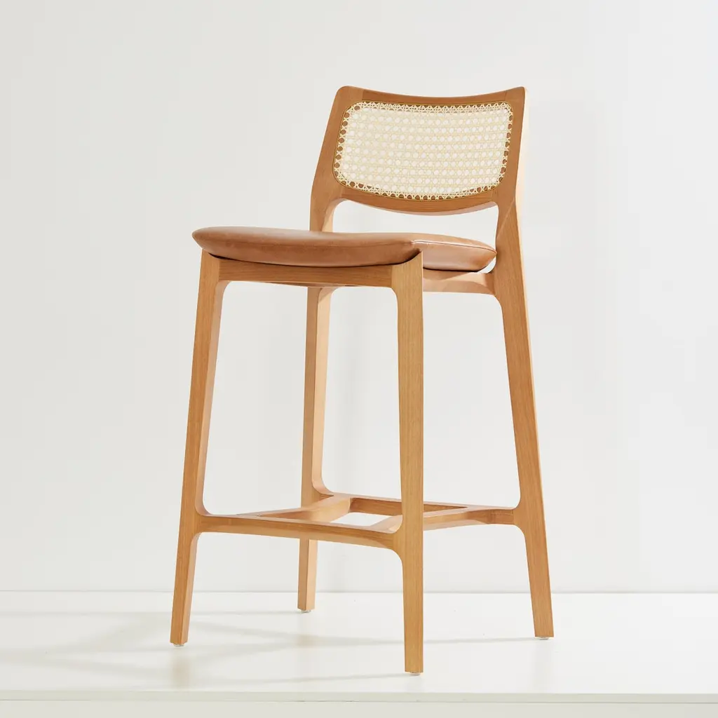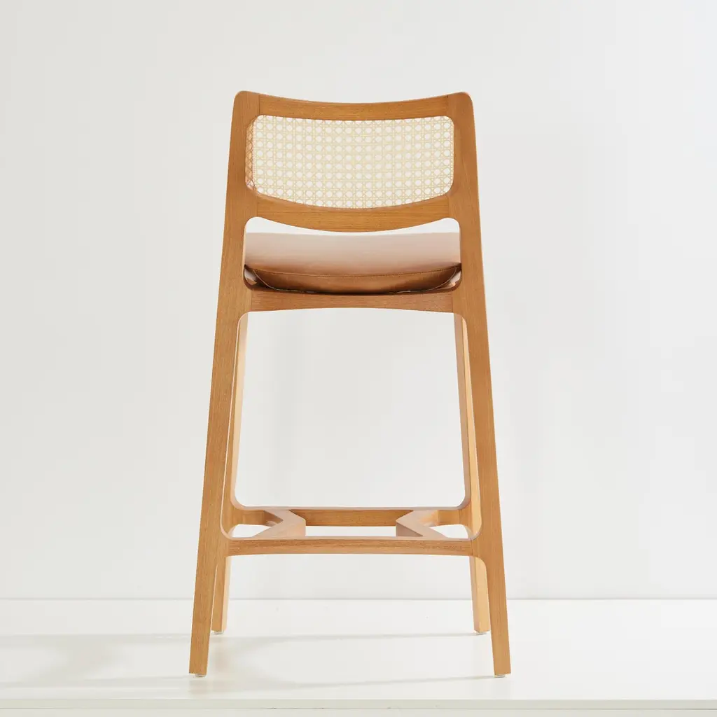 Aurora Stool, Light Honey Solid Wood, Natural Caning Back, Camel Leather Seating