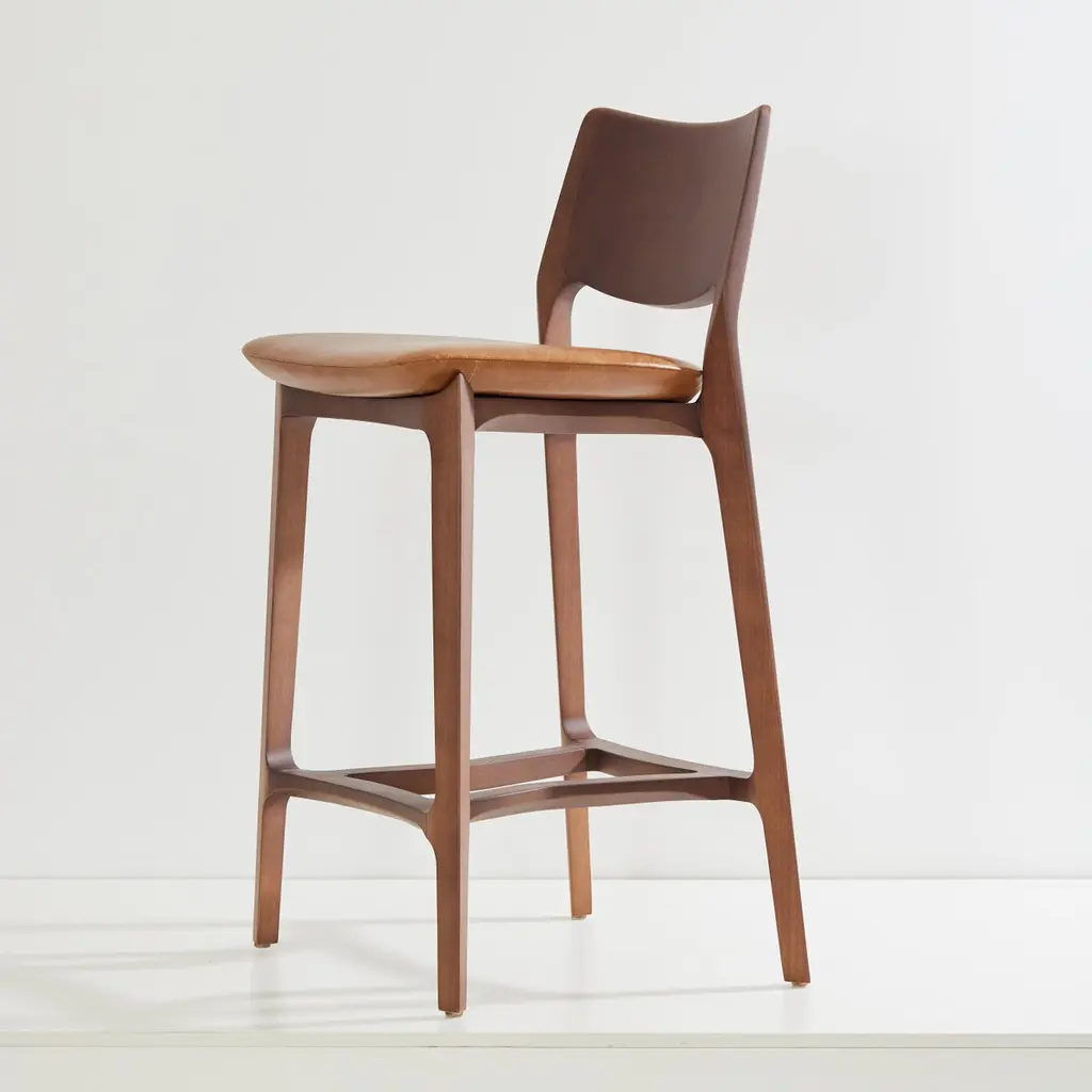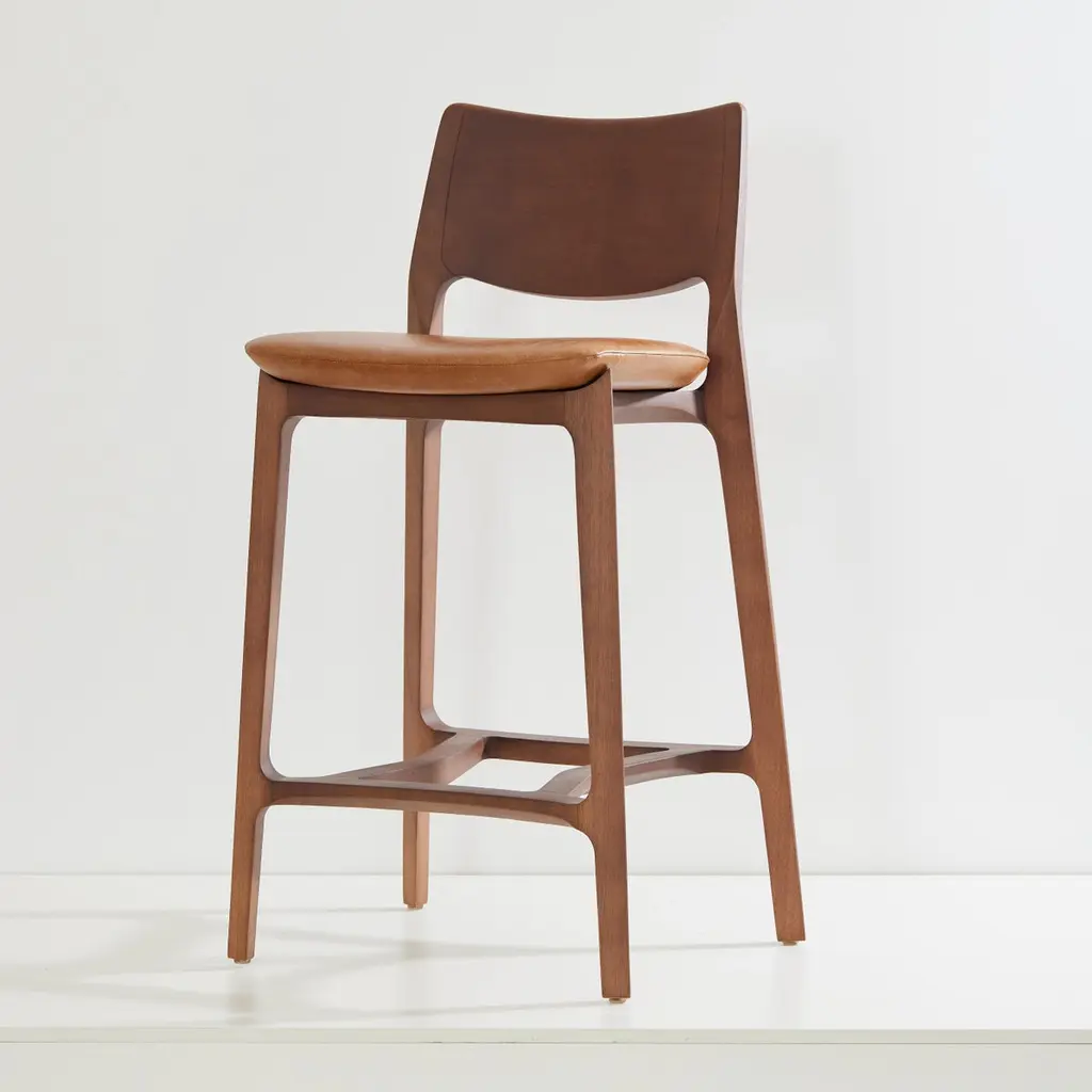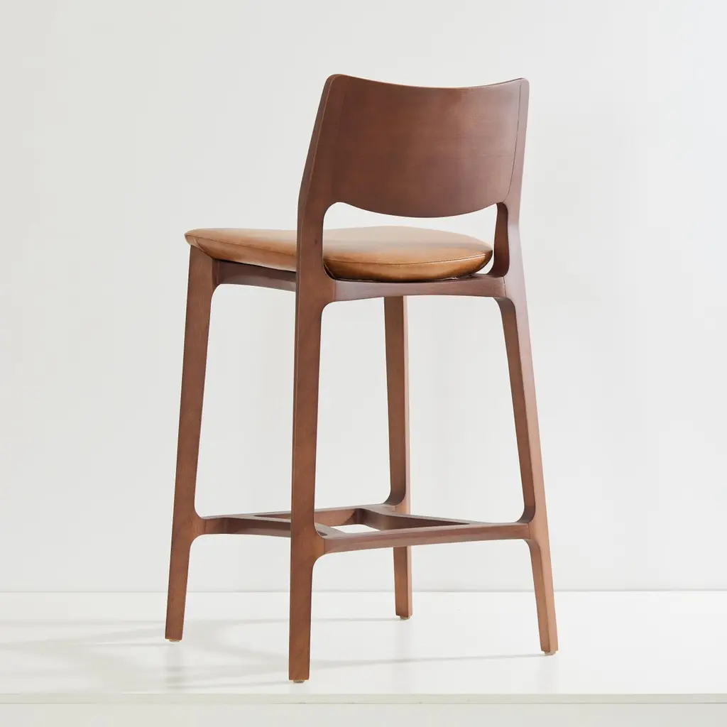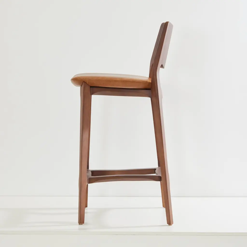 Aurora Stool, Walnut Solid Wood Finish, Solid Back, Camel Leather Seating