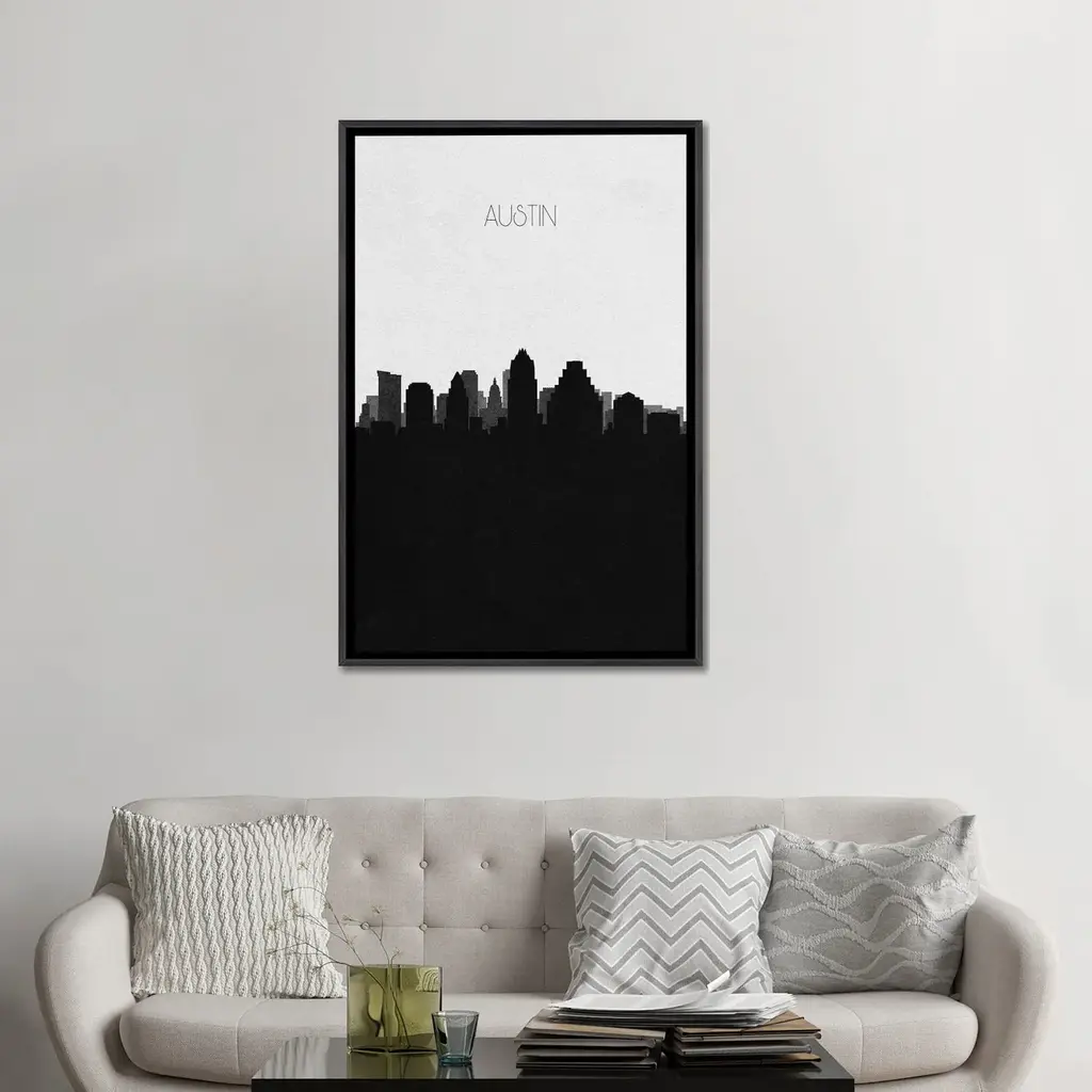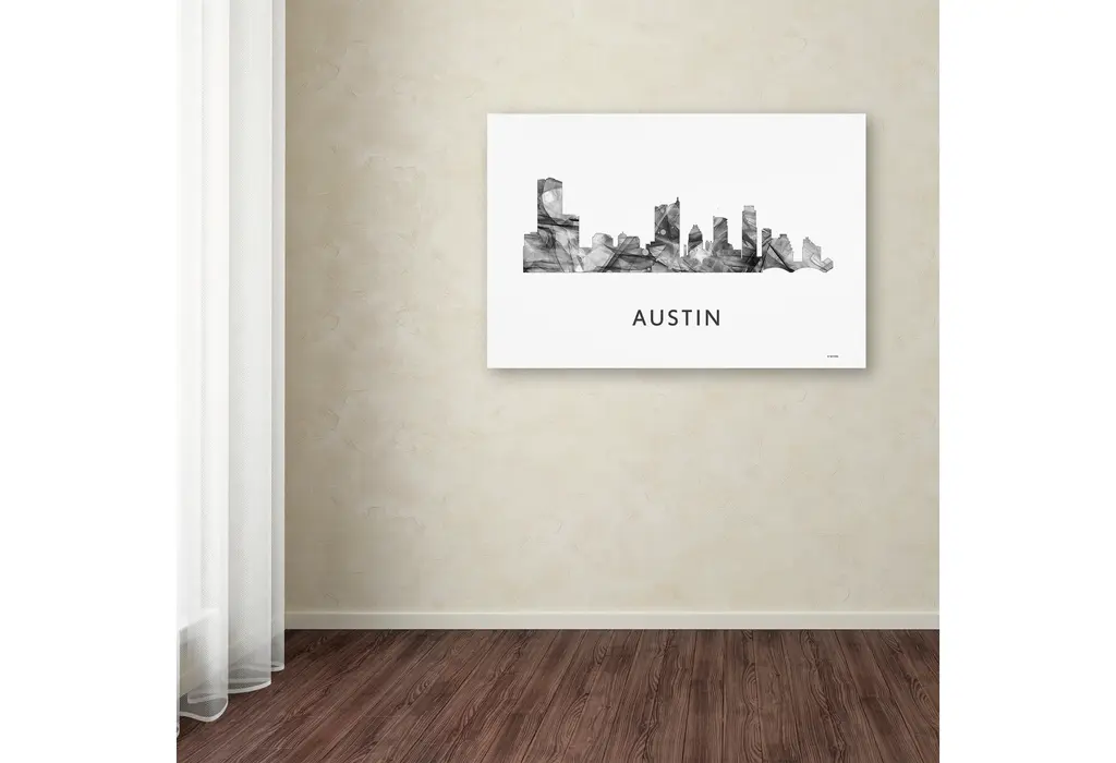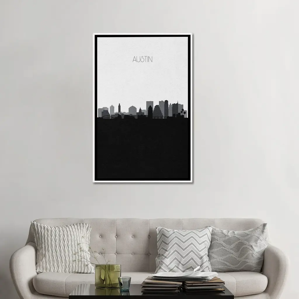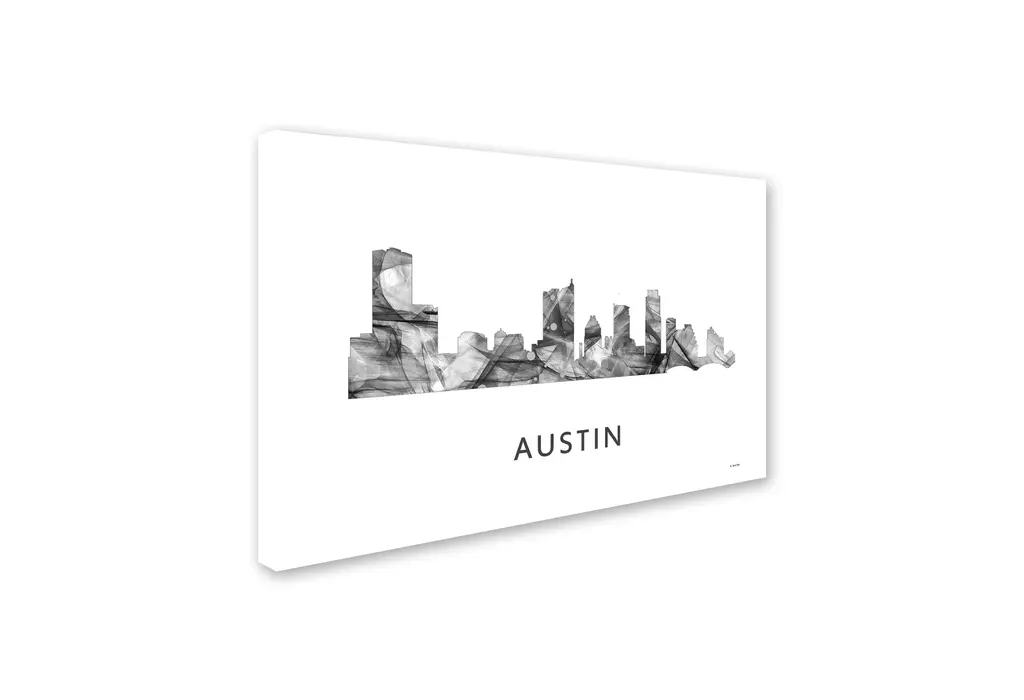 Artist: Marlene WatsonSubject: LandscapesStyle: ContemporaryProduct Type: Gallery-Wrapped Canvas ArtMade in USAThis ready to hang, gallery-wrapped art piece features a black and white designed silhouette of the Austin, Texas skyline.Born in Scotland and now residing in Hong Kong, Marlene Watson has been painting her way through life. She paints things she notices in everyday life and brings out her positive energy through her work. Marlene has gallery showings and has also illustrated a children's book. She cares for 12 cats and works toward animal conservation and rescues with her art.Giclee (jee-clay) is an advanced printmaking process for creating high quality fine art reproductions. The attainable excellence that Giclee printmaking affords makes the reproduction virtually indistinguishable from the original piece. The result is wide acceptance of Giclee by galleries, museums, and private collectors. Gallery wrap is a method of stretching an artist's canvas so that the canvas wraps around the sides and is secured a hidden, wooden frame. This method of stretching and preparing a canvas allows for a frameless presentation of the finished painting.