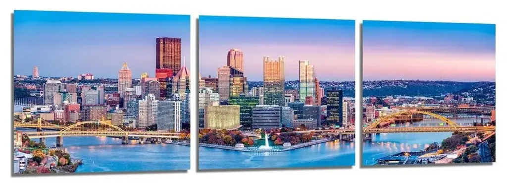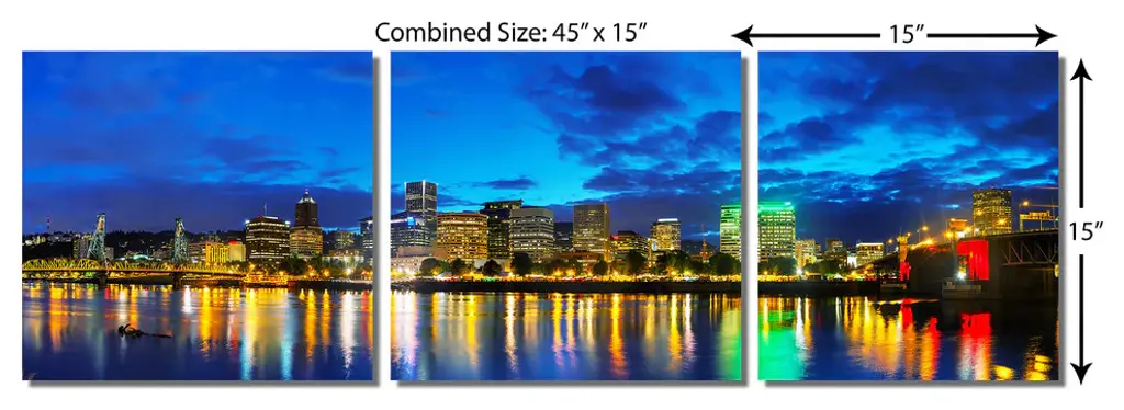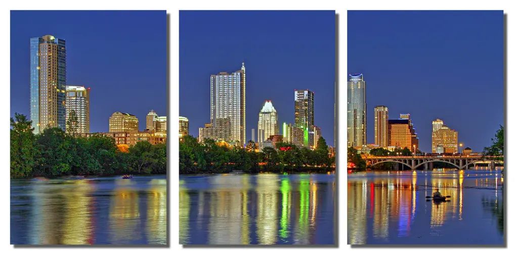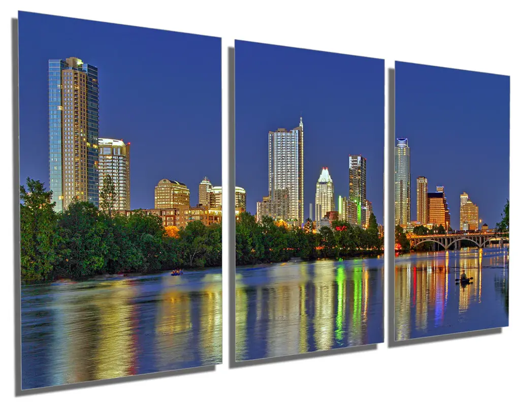 36"œ x 18"œ total size. Ready To Hang! (3 pieces - 12"œ x 18"œ each). 3 Panel Split (Triptych) Metal Print of Austin, Texas Skyline at dusk. Modern metal wall art for home or office wall decor & interior design. Printed on Luxurious, HD aluminum glossy metal panels. Multi panel art.. HD aluminum panels. Metal print wall art. Includes Shadow Wall Mount on the back.• Aluminum Metal Wall Art• Made in USA• Ready to hang - No assembly required• Shadow mount hardware on the back• 0.045"œ thick HD Aluminum Panels• Scratch resistant, glossy finish• Superb color clarity, luxurious prints• Epson printing process• For indoor or moisture rich environment use• Easy to clean. Gently wipe with microfiber cloth.