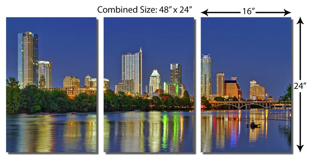 48"œ x 24"œ total size. Ready To Hang! (3 pieces - 16"œ x 24"œ each). 3 Panel Split (Triptych) Metal Print of Austin, Texas Skyline at dusk. Modern metal wall art for home or office wall decor & interior design. Printed on Luxurious, HD aluminum glossy metal panels. Multi panel art.. HD aluminum panels. Metal print wall art. Includes Shadow Wall Mount on the back.• Aluminum Metal Wall Art• Made in USA• Ready to hang - No assembly required• Shadow mount hardware on the back• 0.045"œ thick HD Aluminum Panels• Scratch resistant, glossy finish• Superb color clarity, luxurious prints• Epson printing process• For indoor or moisture rich environment use• Easy to clean. Gently wipe with microfiber cloth.
