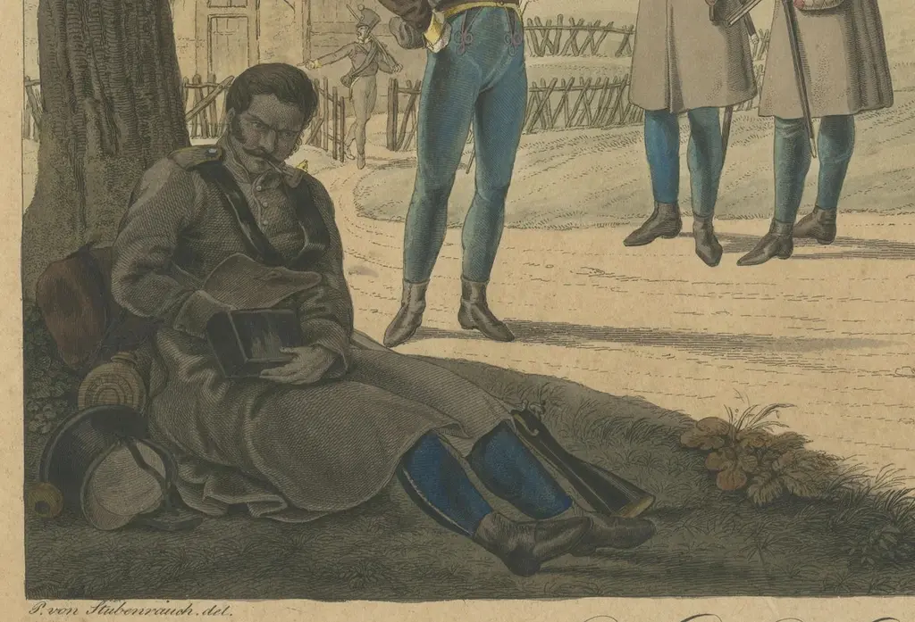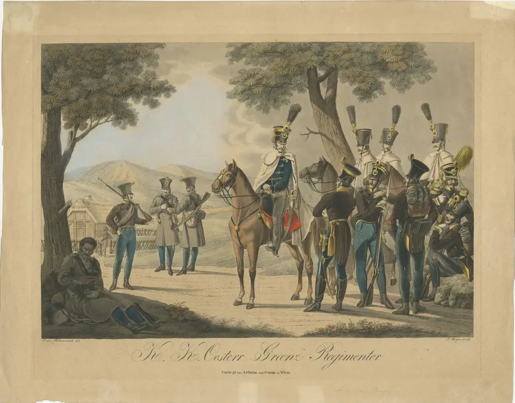 Austrian Grenz Regiment Soldiers in the Field, Early 19th CenturyDetailed description: This hand-colored lithograph, likely created in the early 1820s, features soldiers from the Austrian Grenz Regiment during a moment of rest in a rural landscape. The scene depicts a group of infantrymen, some mounted, with a variety of poses that convey a sense of camaraderie and relaxed discipline. The vibrant uniforms of the Grenzers, including the distinctive shakos and cavalry attire, are beautifully rendered in hand-applied color, highlighting the details and distinctions in military fashion of the period. The backdrop includes a tranquil landscape with cottages, adding depth and context to the setting.Details: Artist: Lorenz Reidinger del. Title: K.K. Österreich Grenz-Regimenter Publisher: Artaria & Comp., Vienna Technique: Hand-colored lithograph Sheet Size: Approximately 47 x 34 cm (18.5 x 13.4 inches) Condition: Good condition with bright, well-preserved colors. The margins exhibit minor age toning and a small tear along the bottom left edge, which does not affect the printed area. Overall, this print is in very good condition and retains its original vibrancy.Publisher: Artaria & Comp., a renowned Viennese publishing house, was active in the late 18th and early 19th centuries. They were known for their high-quality lithographs, maps, and art publications, contributing significantly to the visual and cultural documentation of the time. Their military-themed lithographs, like this one, are especially valued for their accurate depiction of the Austrian military uniforms and life during the Napoleonic Wars and its aftermath.This lithograph provides a vivid and engaging glimpse into the attire and lifestyle of the Grenz regiments, known for their vital role on the Austrian frontier, and is an excellent addition for collectors of military history and Napoleonic-era artwork.