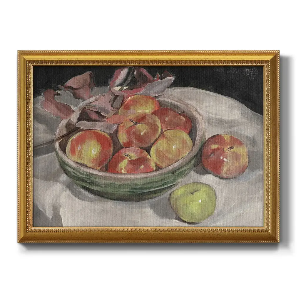 Autumn Apples I Premium Framed Canvas- Ready to Hang A Premium Framed Canvas created to last. Framed in distressed wood and available in an array of sizes and colors Featuring a beveled a solid wood stretcher bar, each piece comes ready to hand 3 SIZES AVAILABLE 16''X20'' - Overall Size 18'X27'' - Overall Size 24''x36'' - Overall Size Each piece is made to order. Each piece comes with hanging hardware. Made in the USA Ready to Hang Giclee Paper Print Acrylic Glass Beveled Matt Board