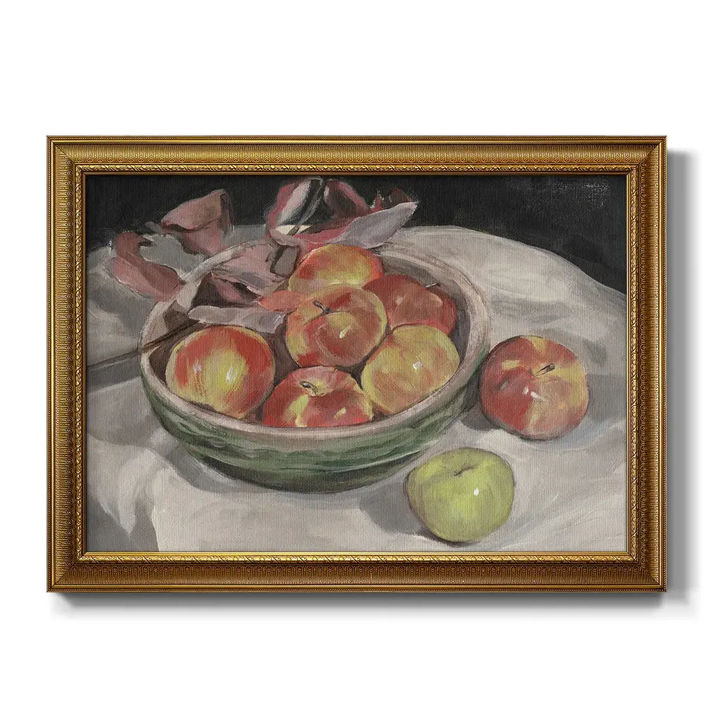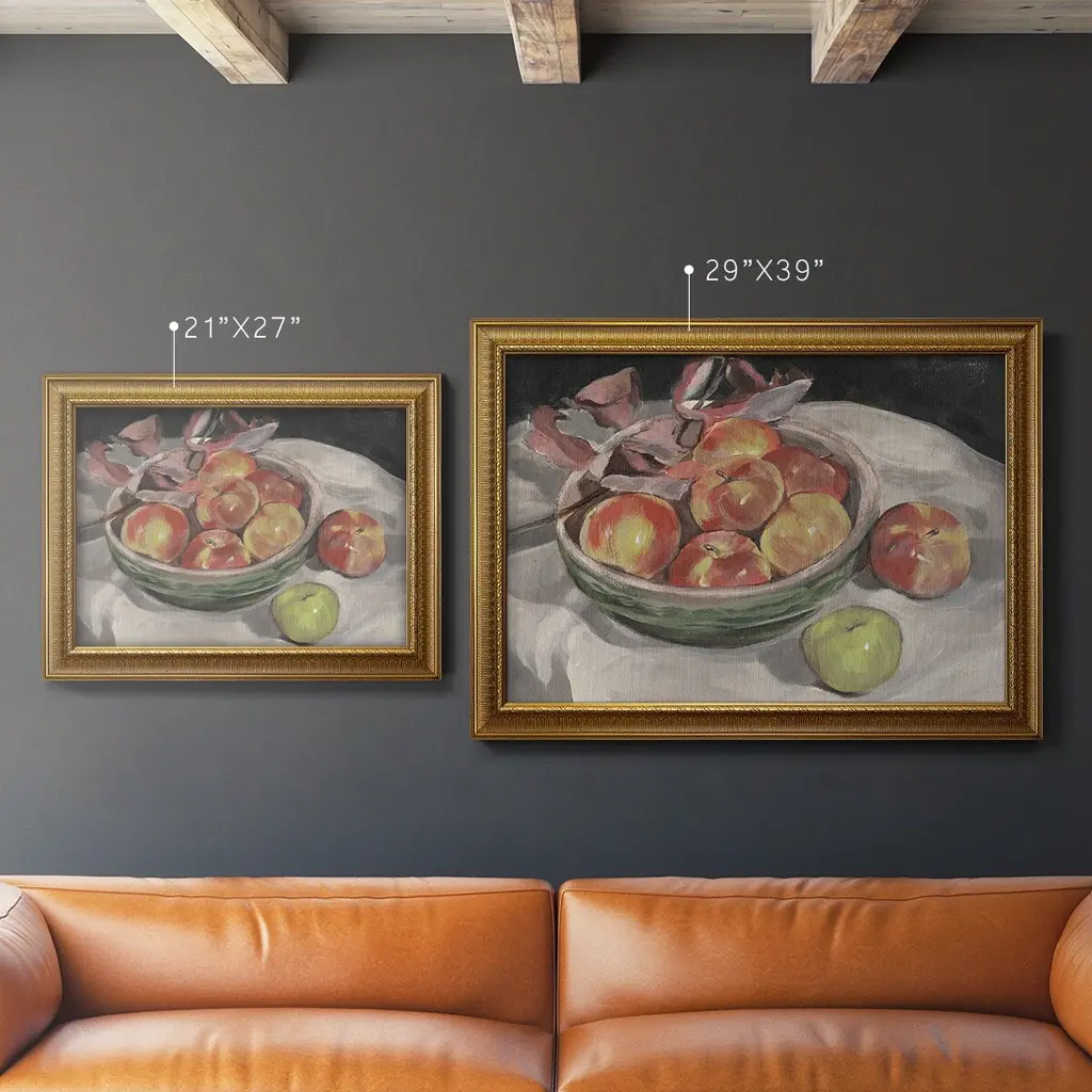 Autumn Apples I Premium Framed Canvas- Ready to Hang A Premium Framed Canvas created to last. Framed in distressed wood and available in an array of sizes and colors Featuring a beveled a solid wood stretcher bar, each piece comes ready to hand 3 SIZES AVAILABLE 16''X20'' - Overall Size 18'X27'' - Overall Size 24''x36'' - Overall Size Each piece is made to order. Each piece comes with hanging hardware. Made in the USA Ready to Hang Giclee Paper Print Acrylic Glass Beveled Matt Board