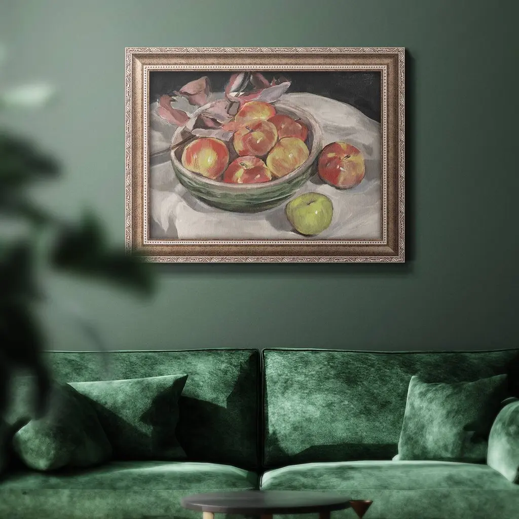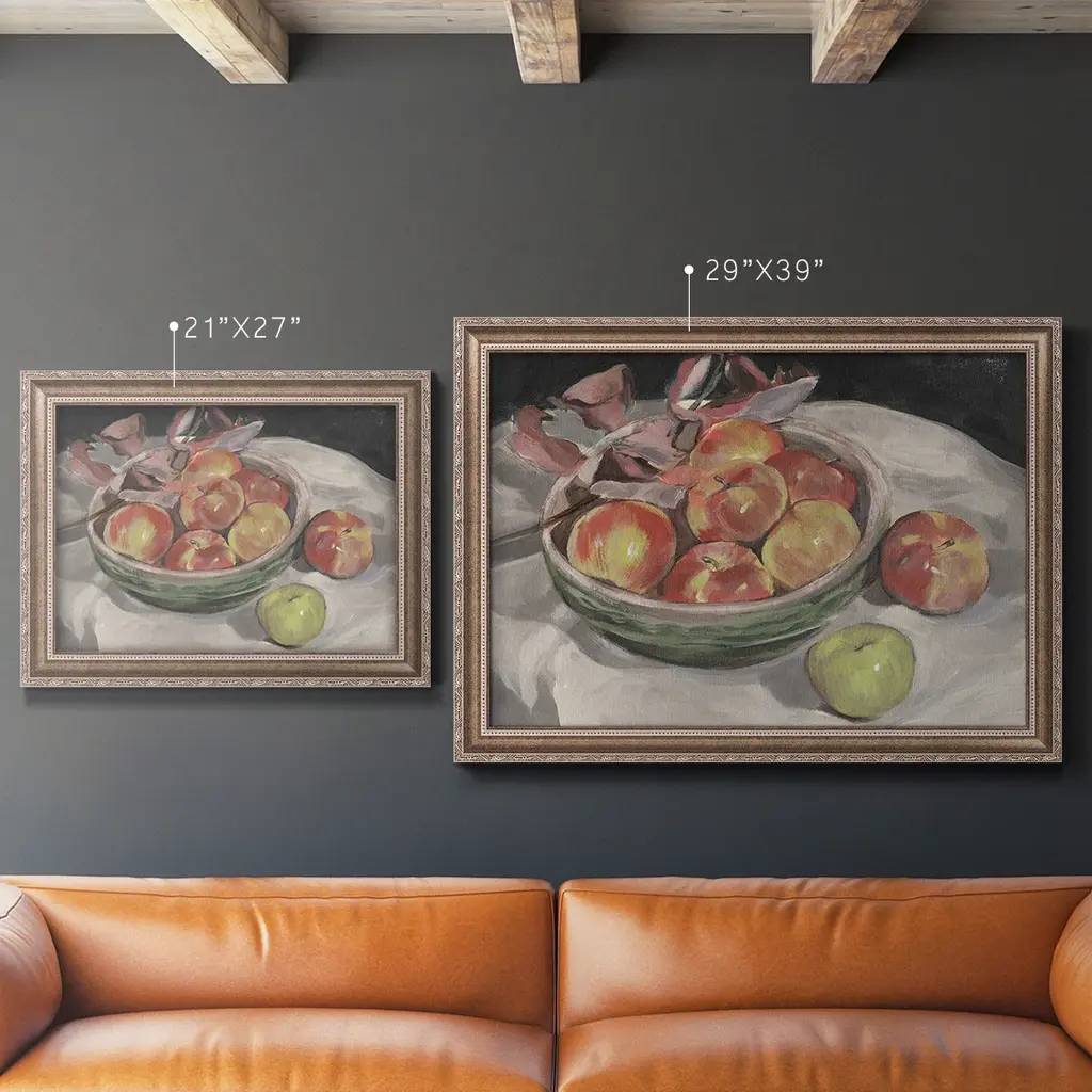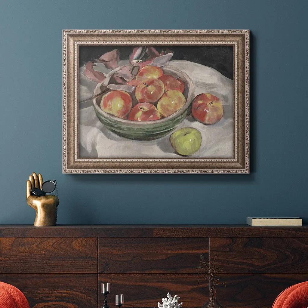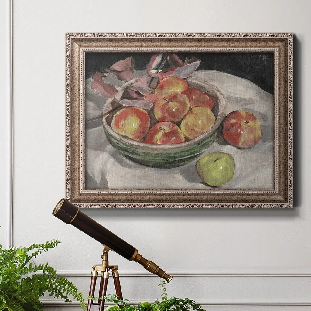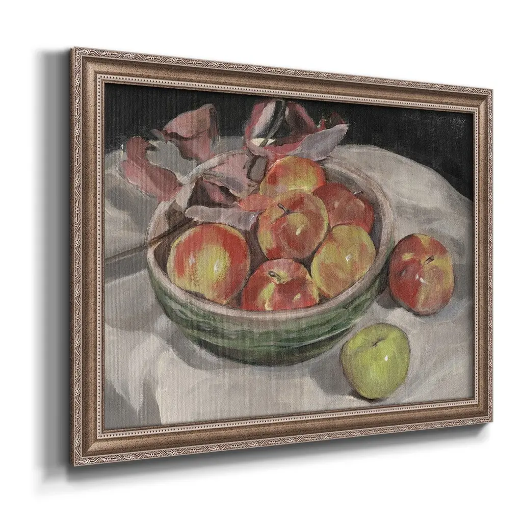 Autumn Apples I Premium Framed Canvas- Ready to Hang A Premium Framed Canvas created to last. Framed in distressed wood and available in an array of sizes and colors Featuring a beveled a solid wood stretcher bar, each piece comes ready to hand 3 SIZES AVAILABLE 16''X20'' - Overall Size 18'X27'' - Overall Size 24''x36'' - Overall Size Each piece is made to order. Each piece comes with hanging hardware. Made in the USA Ready to Hang Giclee Paper Print Acrylic Glass Beveled Matt Board