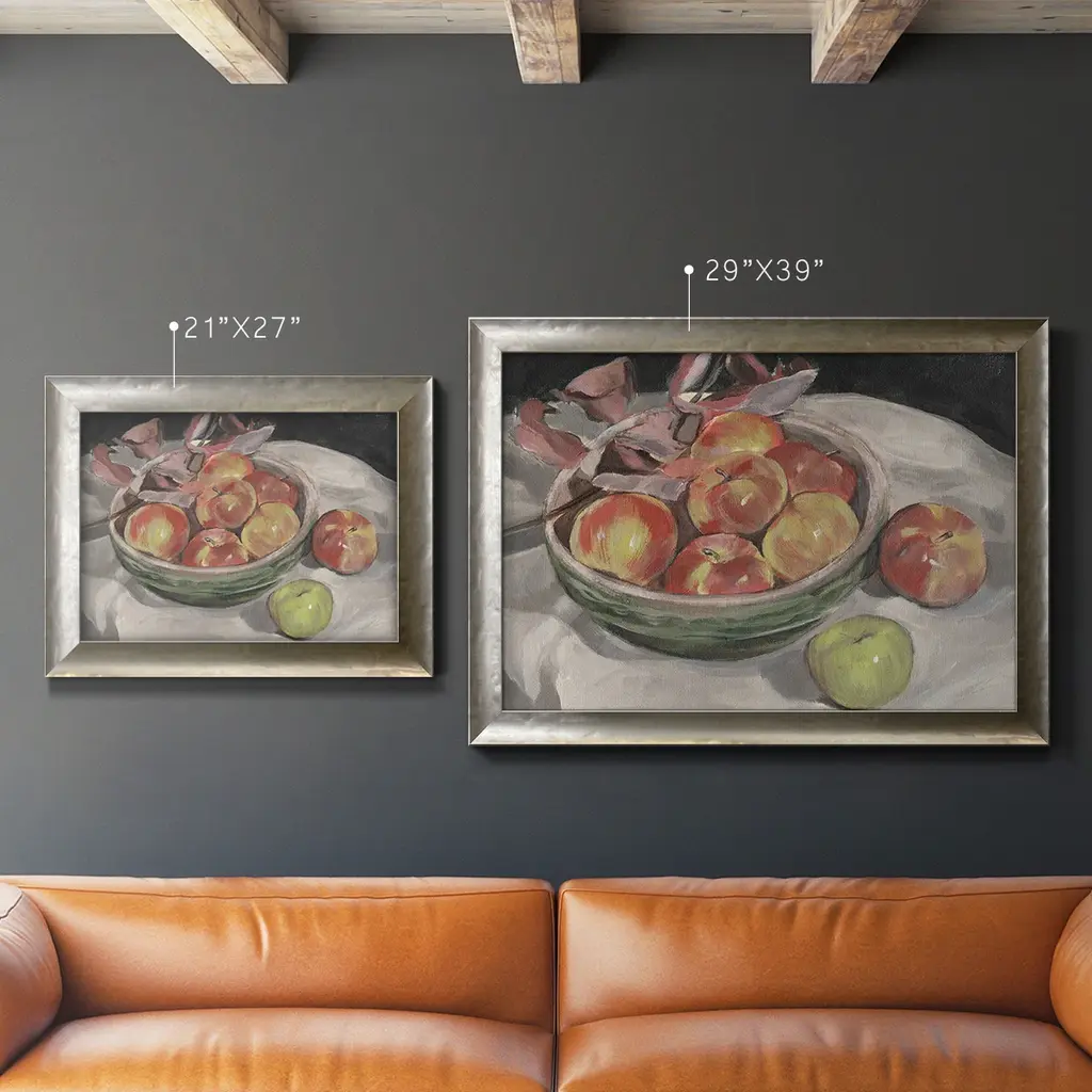 Autumn Apples I Premium Framed Canvas- Ready to Hang A Premium Framed Canvas created to last. Framed in distressed wood and available in an array of sizes and colors Featuring a beveled a solid wood stretcher bar, each piece comes ready to hand 3 SIZES AVAILABLE 16''X20'' - Overall Size 18'X27'' - Overall Size 24''x36'' - Overall Size Each piece is made to order. Each piece comes with hanging hardware. Made in the USA Ready to Hang Giclee Paper Print Acrylic Glass Beveled Matt Board