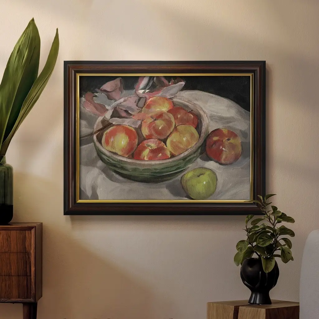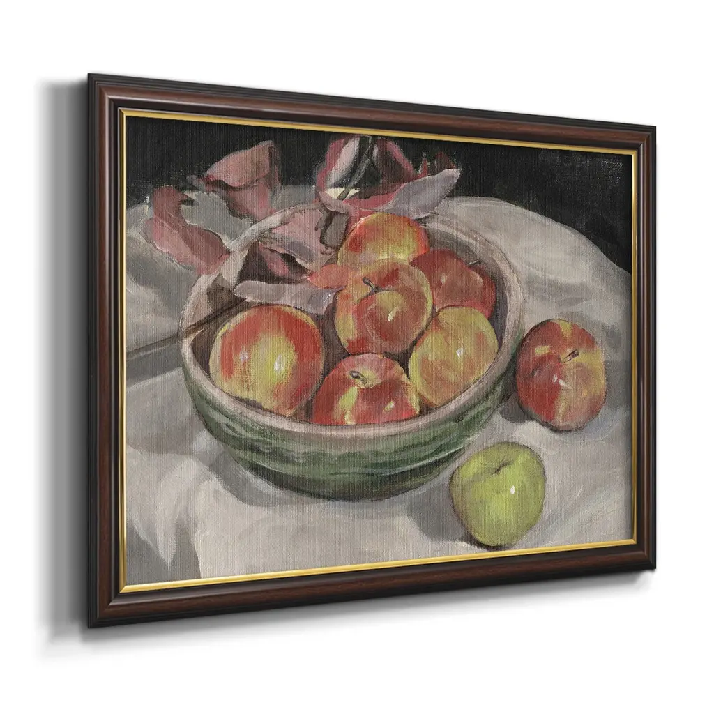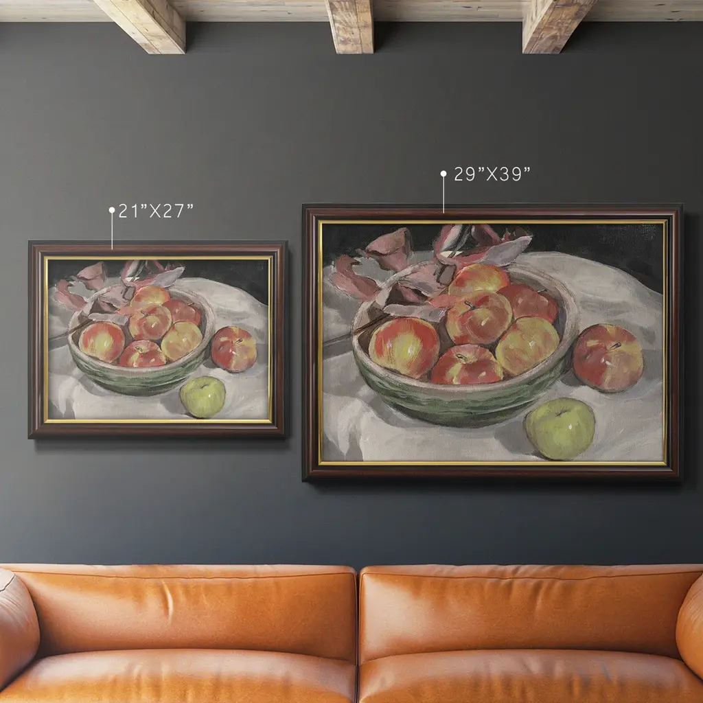 Autumn Apples I Premium Framed Canvas- Ready to Hang A Premium Framed Canvas created to last. Framed in distressed wood and available in an array of sizes and colors Featuring a beveled a solid wood stretcher bar, each piece comes ready to hand 3 SIZES AVAILABLE 16''X20'' - Overall Size 18'X27'' - Overall Size 24''x36'' - Overall Size Each piece is made to order. Each piece comes with hanging hardware. Made in the USA Ready to Hang Giclee Paper Print Acrylic Glass Beveled Matt Board
