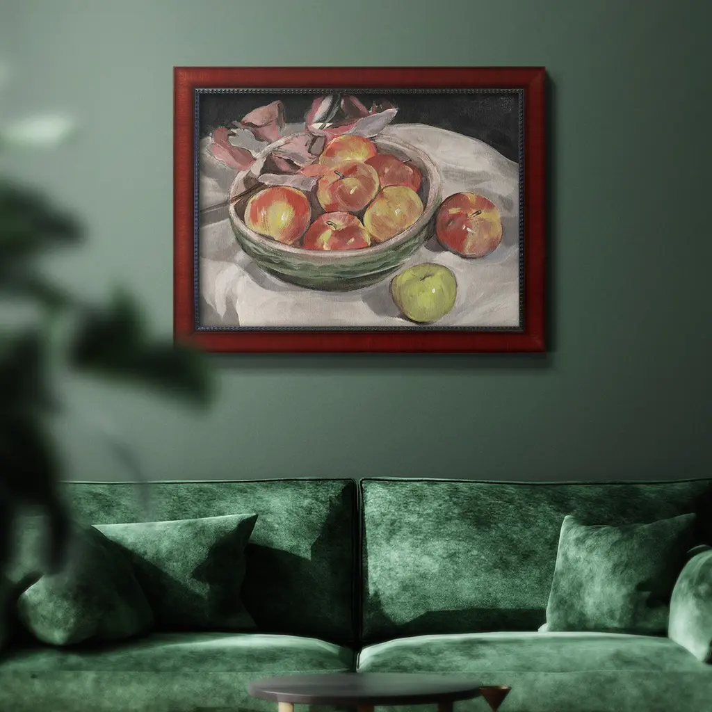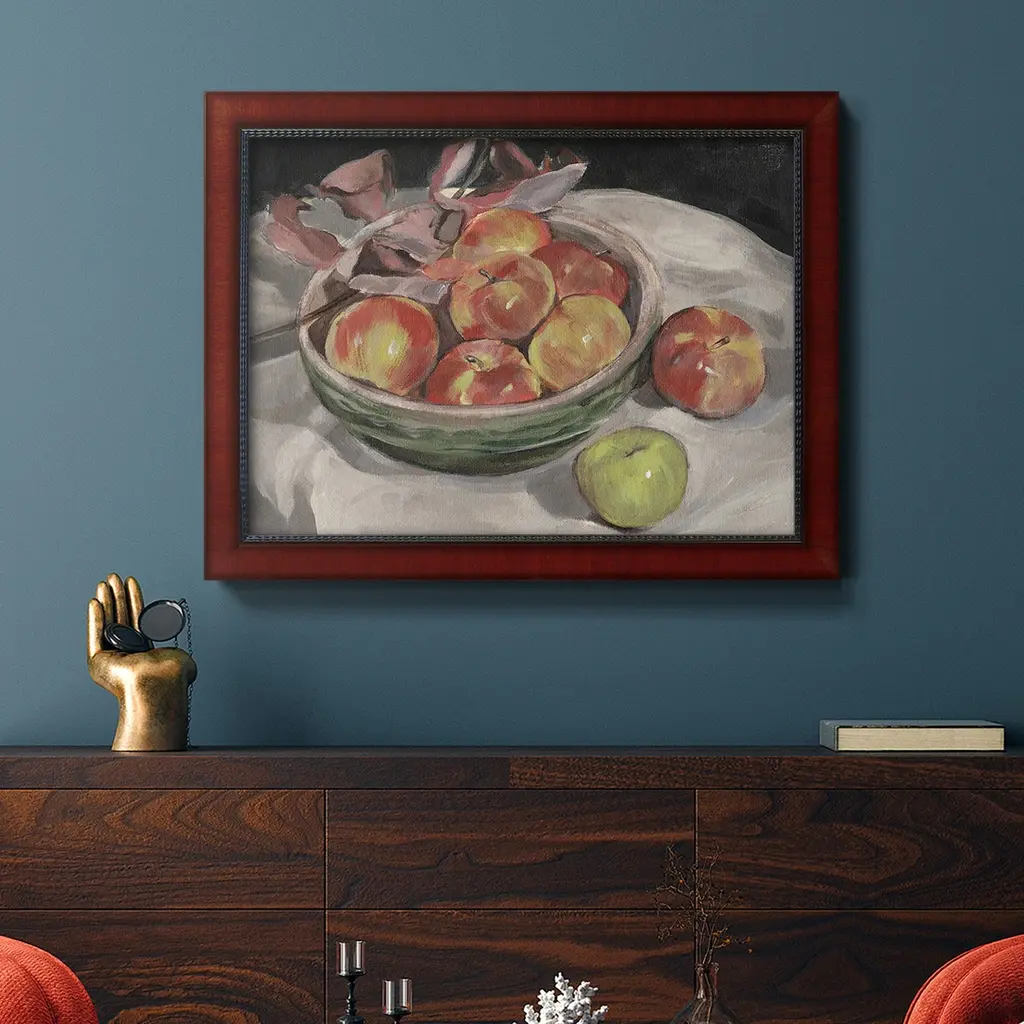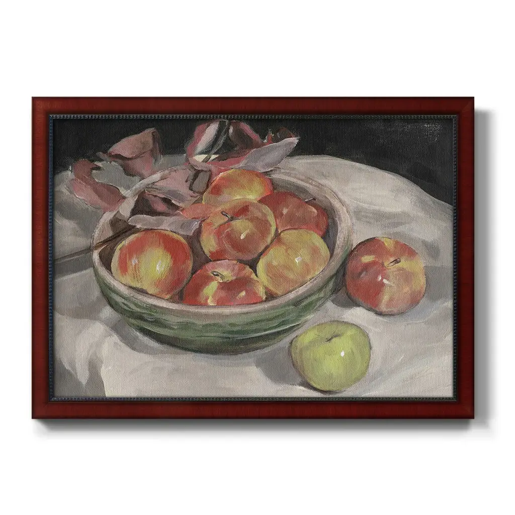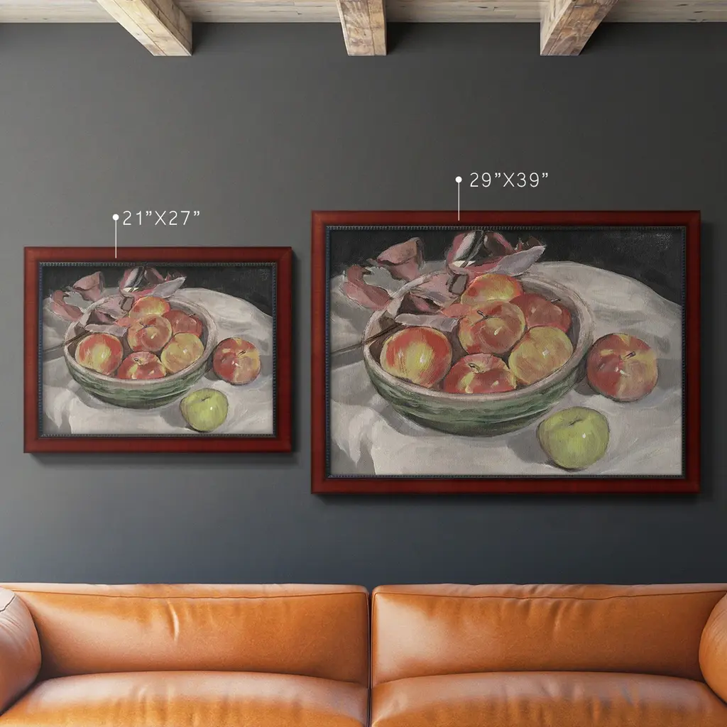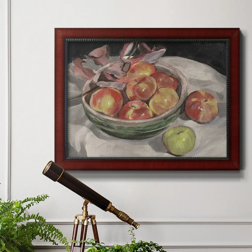Autumn Apples I Premium Framed Canvas- Ready to Hang A Premium Framed Canvas created to last. Framed in distressed wood and available in an array of sizes and colors Featuring a beveled a solid wood stretcher bar, each piece comes ready to hand 3 SIZES AVAILABLE 16''X20'' - Overall Size 18'X27'' - Overall Size 24''x36'' - Overall Size Each piece is made to order. Each piece comes with hanging hardware. Made in the USA Ready to Hang Giclee Paper Print Acrylic Glass Beveled Matt Board