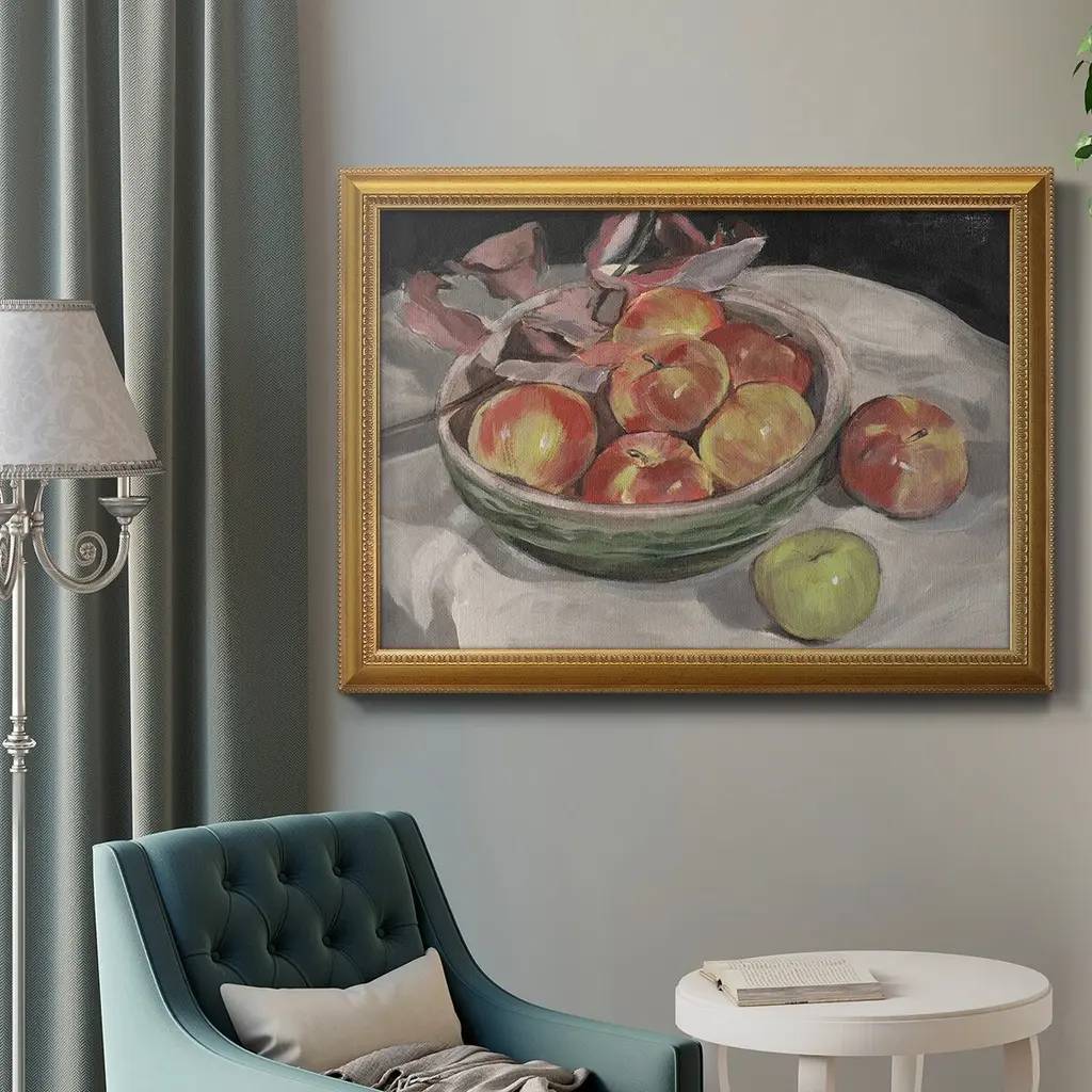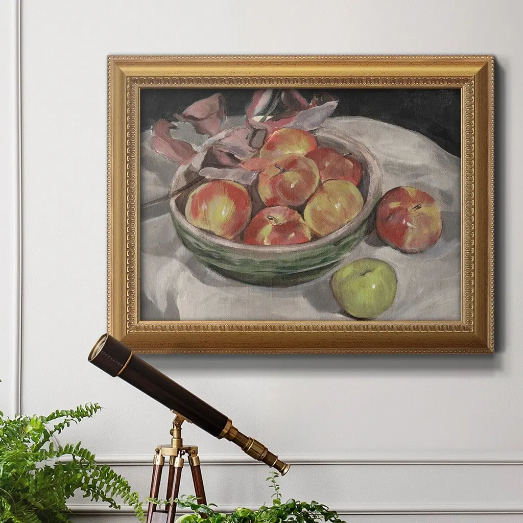 Autumn Apples I Premium Framed Canvas- Ready to Hang A Premium Framed Canvas created to last. Framed in distressed wood and available in an array of sizes and colors Featuring a beveled a solid wood stretcher bar, each piece comes ready to hand 3 SIZES AVAILABLE 16''X20'' - Overall Size 18'X27'' - Overall Size 24''x36'' - Overall Size Each piece is made to order. Each piece comes with hanging hardware. Made in the USA Ready to Hang Giclee Paper Print Acrylic Glass Beveled Matt Board