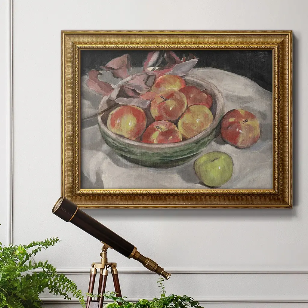 Autumn Apples I Premium Framed Canvas- Ready to Hang A Premium Framed Canvas created to last. Framed in distressed wood and available in an array of sizes and colors Featuring a beveled a solid wood stretcher bar, each piece comes ready to hand 3 SIZES AVAILABLE 16''X20'' - Overall Size 18'X27'' - Overall Size 24''x36'' - Overall Size Each piece is made to order. Each piece comes with hanging hardware. Made in the USA Ready to Hang Giclee Paper Print Acrylic Glass Beveled Matt Board