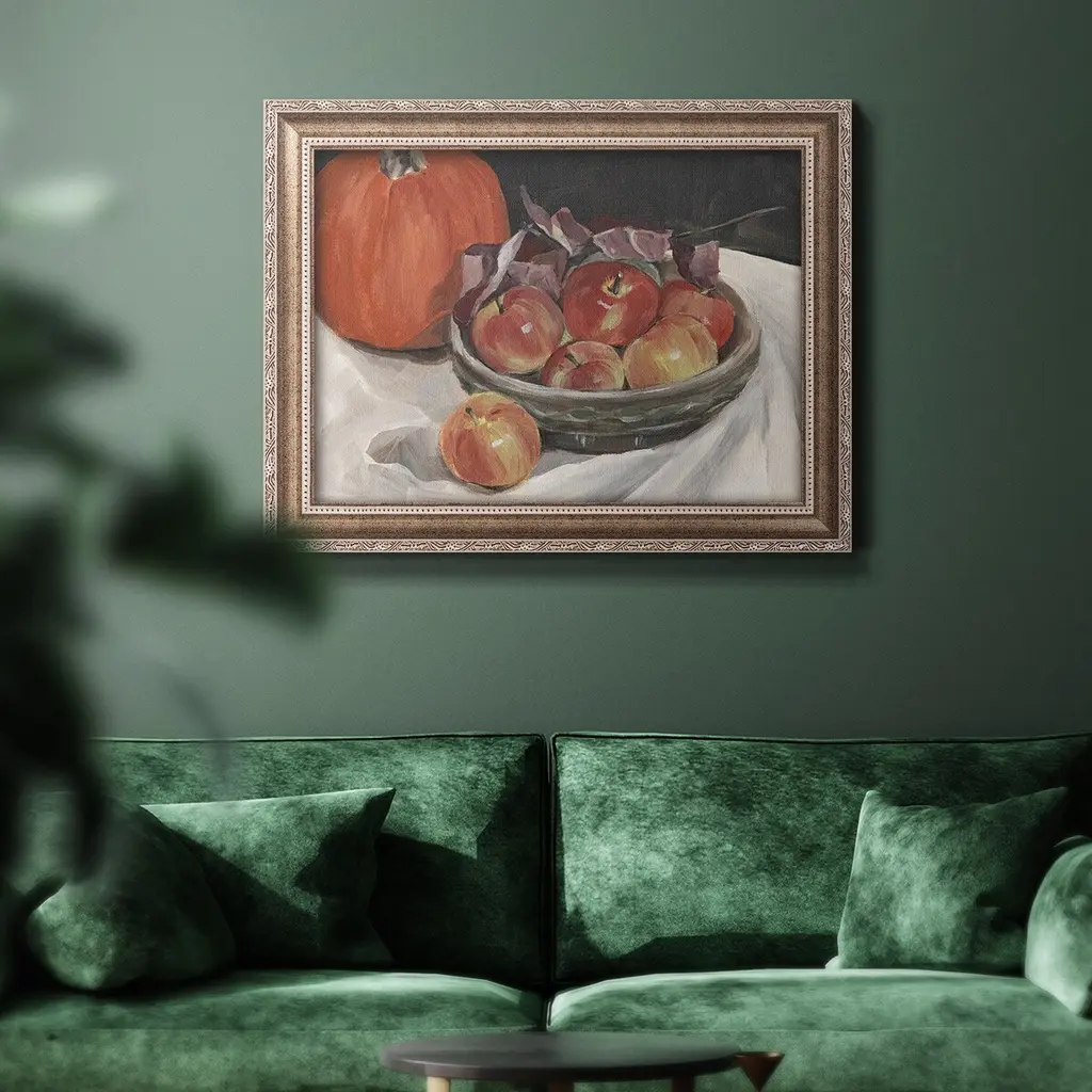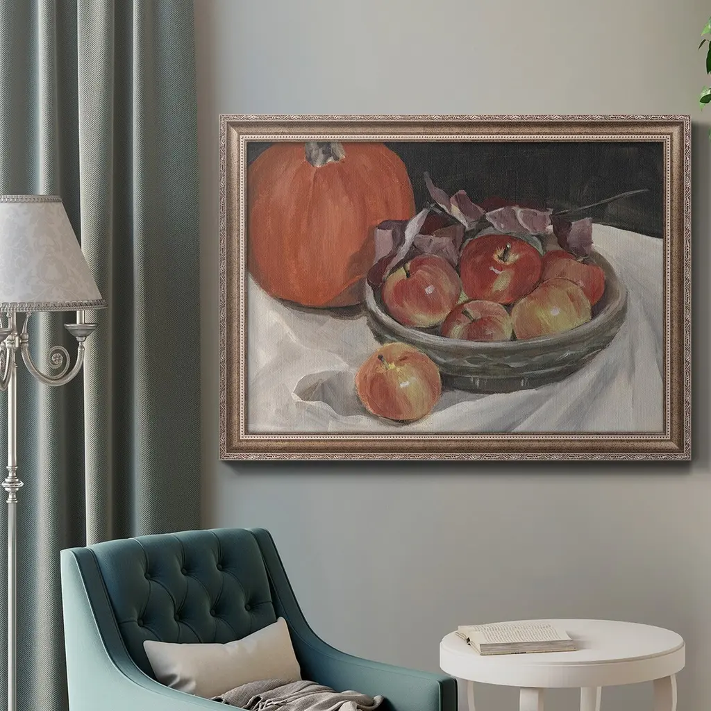 Autumn Apples II Premium Framed Canvas- Ready to Hang A Premium Framed Canvas created to last. Framed in distressed wood and available in an array of sizes and colors Featuring a beveled a solid wood stretcher bar, each piece comes ready to hand 3 SIZES AVAILABLE 16''X20'' - Overall Size 18'X27'' - Overall Size 24''x36'' - Overall Size Each piece is made to order. Each piece comes with hanging hardware. Made in the USA Ready to Hang Giclee Paper Print Acrylic Glass Beveled Matt Board
