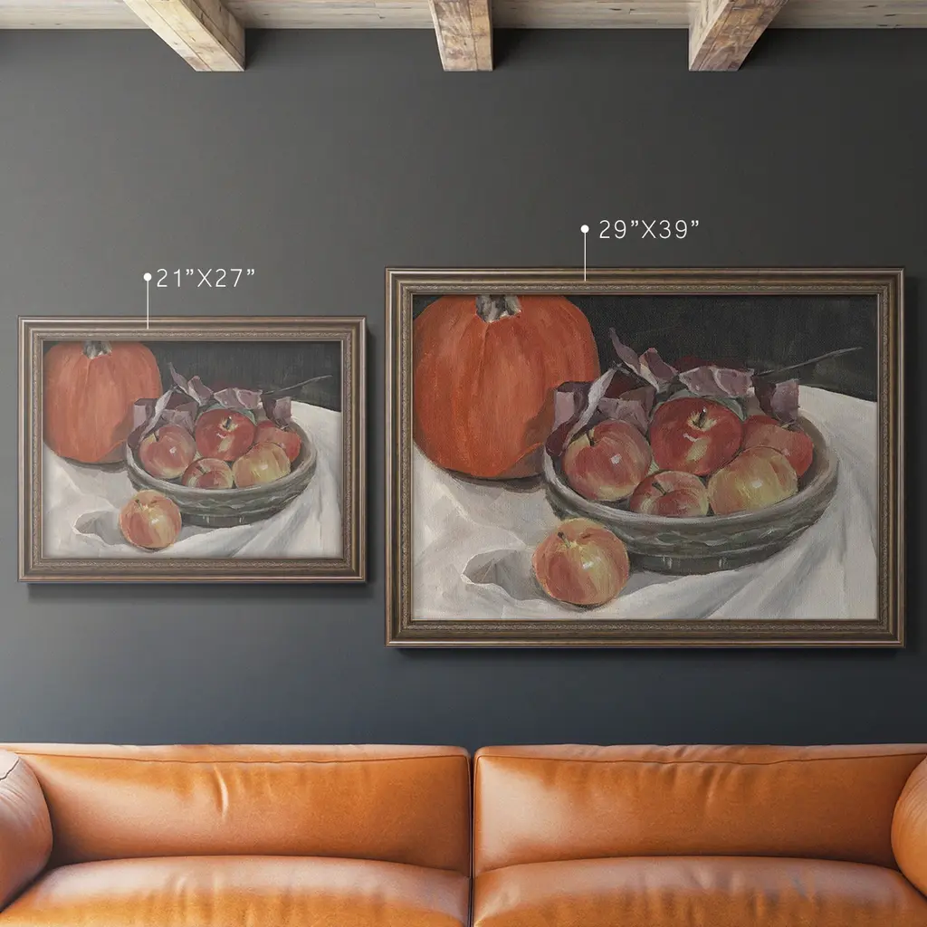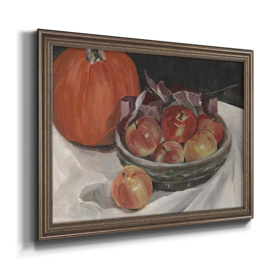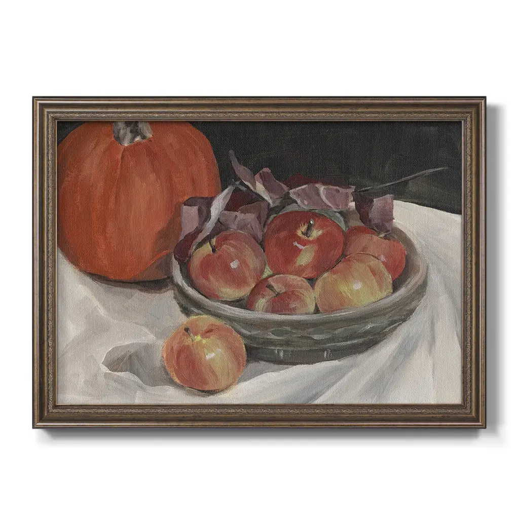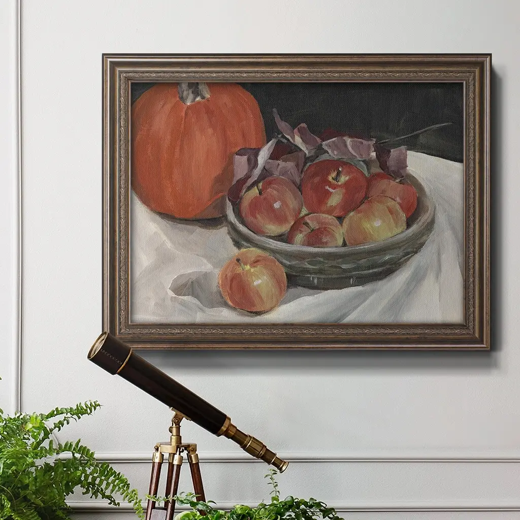 Autumn Apples II Premium Framed Canvas- Ready to Hang A Premium Framed Canvas created to last. Framed in distressed wood and available in an array of sizes and colors Featuring a beveled a solid wood stretcher bar, each piece comes ready to hand 3 SIZES AVAILABLE 16''X20'' - Overall Size 18'X27'' - Overall Size 24''x36'' - Overall Size Each piece is made to order. Each piece comes with hanging hardware. Made in the USA Ready to Hang Giclee Paper Print Acrylic Glass Beveled Matt Board