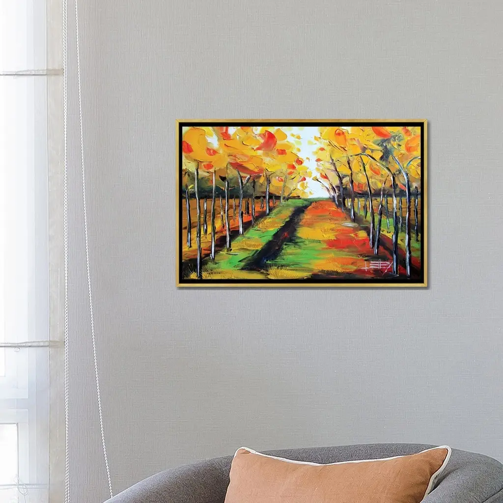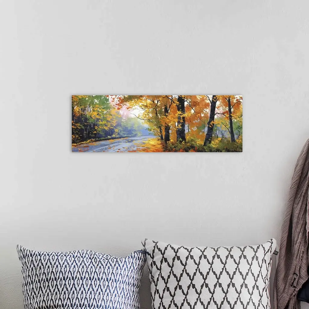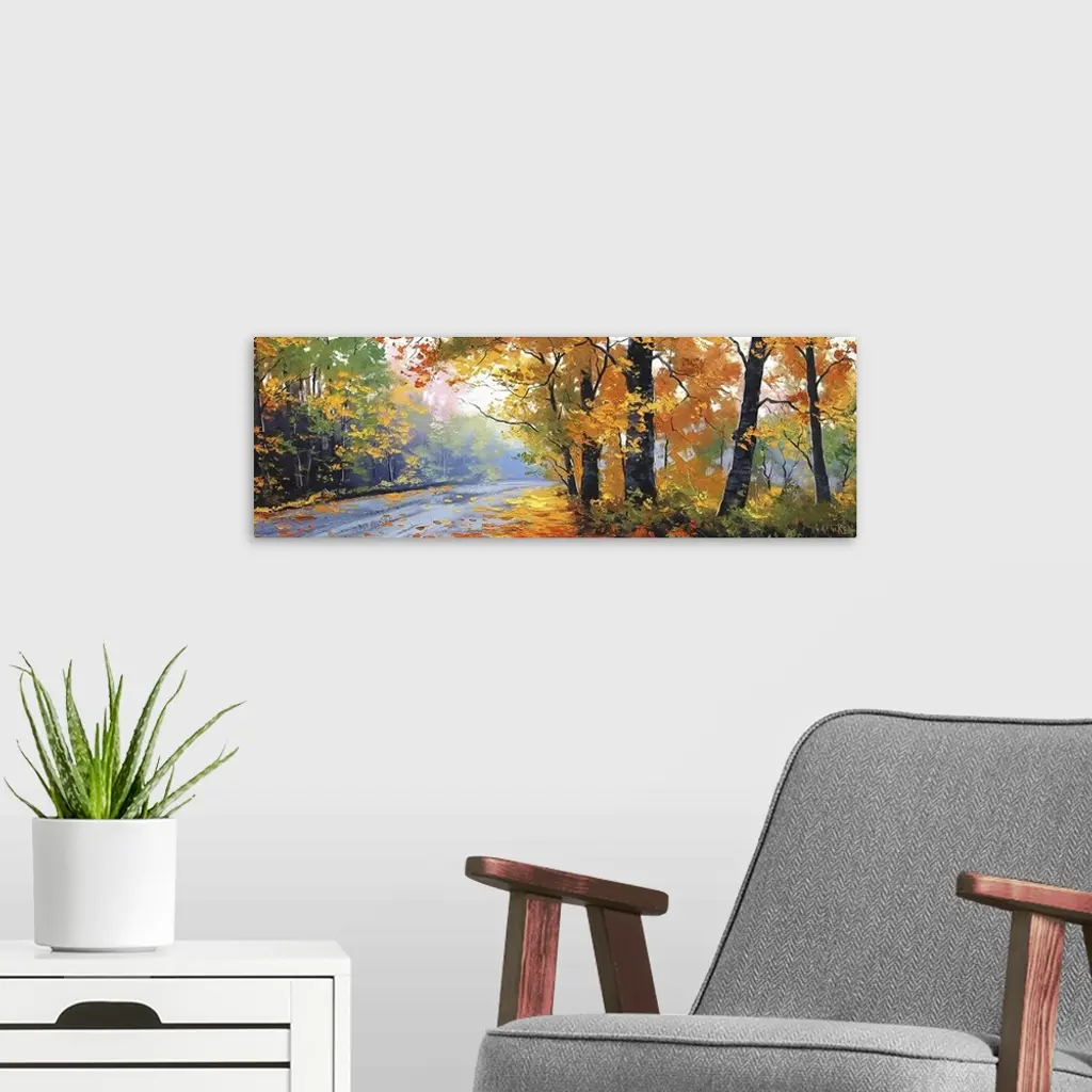 Contemporary painting of an idyllic countryside road cutting through autumn foliage.
