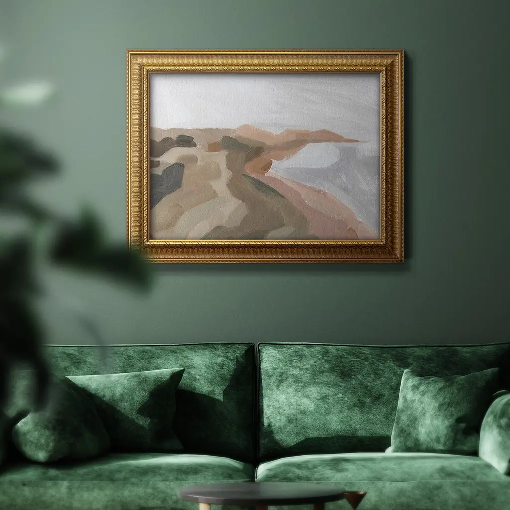 Autumn Coastline I Premium Framed Canvas- Ready to Hang A Premium Framed Canvas created to last. Framed in distressed wood and available in an array of sizes and colors Featuring a beveled a solid wood stretcher bar, each piece comes ready to hand 3 SIZES AVAILABLE 16''X20'' - Overall Size 18'X27'' - Overall Size 24''x36'' - Overall Size Each piece is made to order. Each piece comes with hanging hardware. Made in the USA Ready to Hang Giclee Paper Print Acrylic Glass Beveled Matt Board