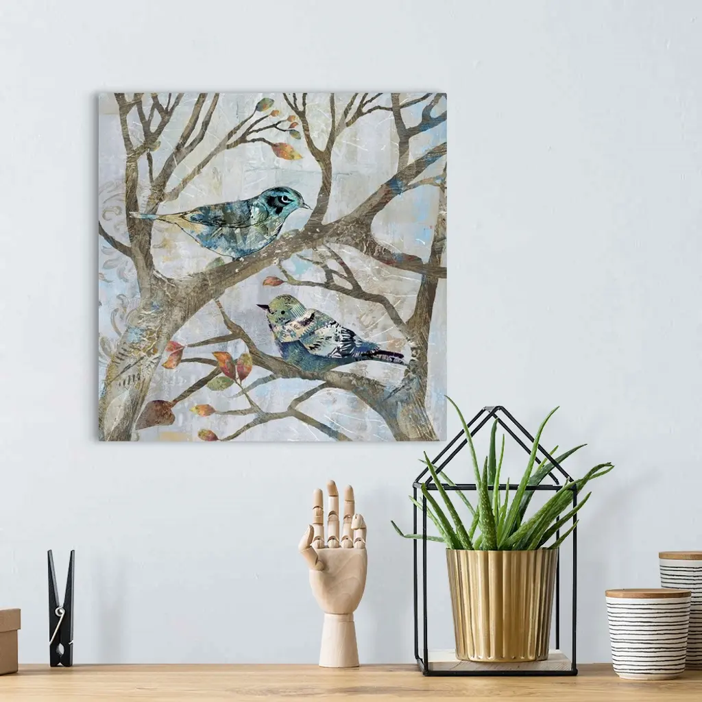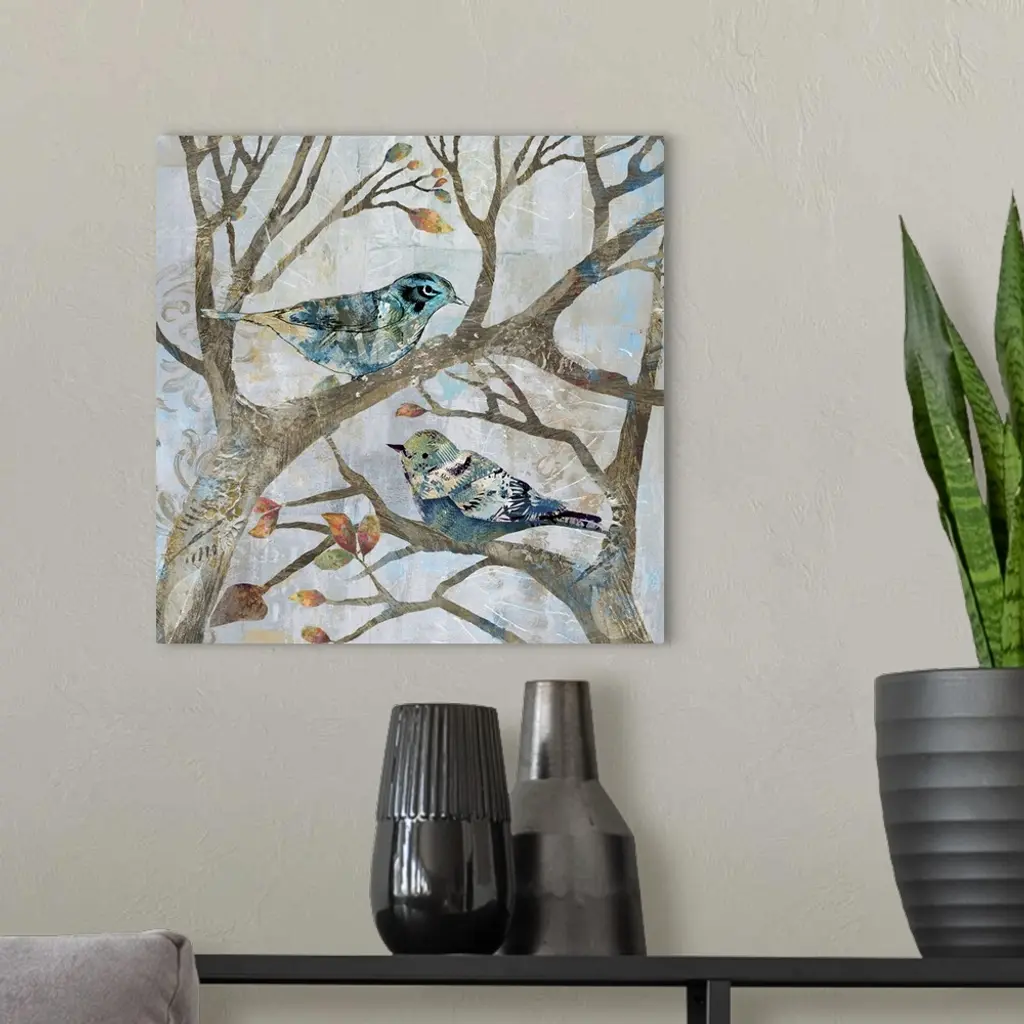 A mixed media painting of two birds perched on tree limbs with hints of printed text and gold accents.