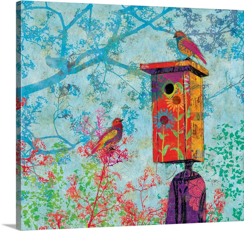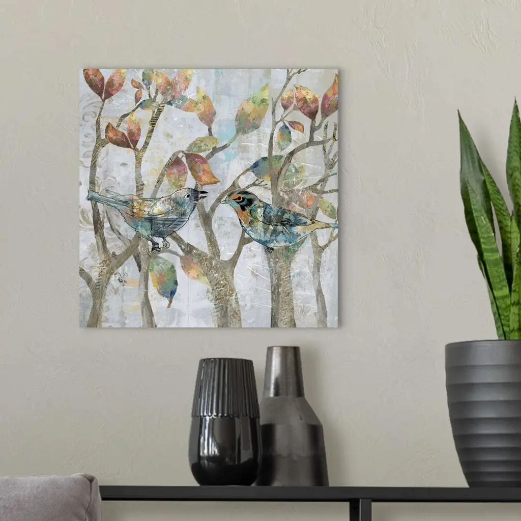 A mixed media painting of two birds perched on tree limbs with hints of gold accents.