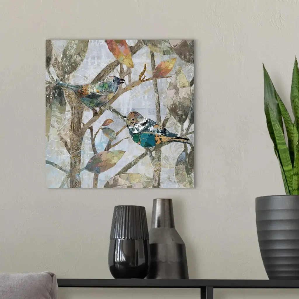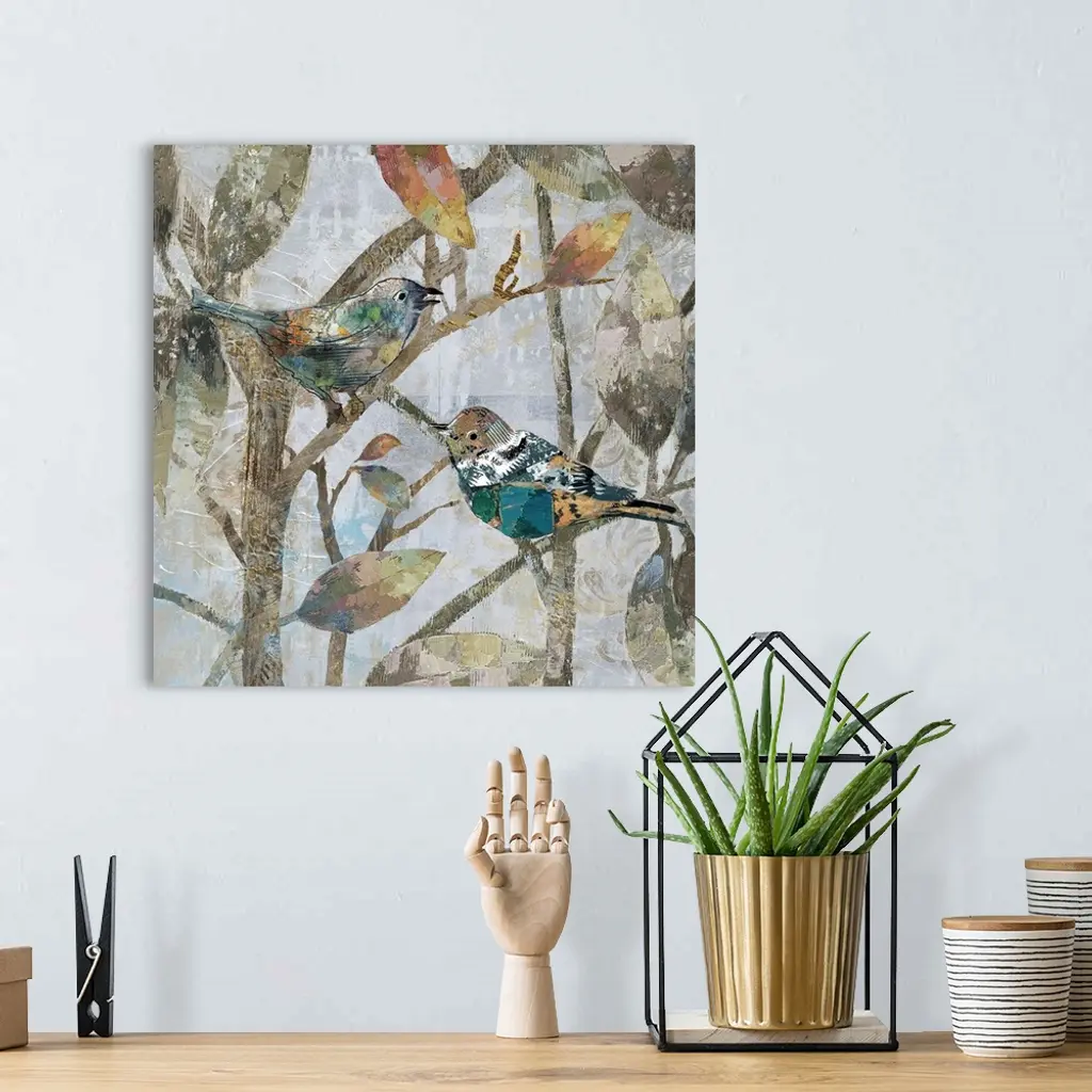 A mixed media painting of two birds perched on tree limbs with hints of printed text and gold accents.