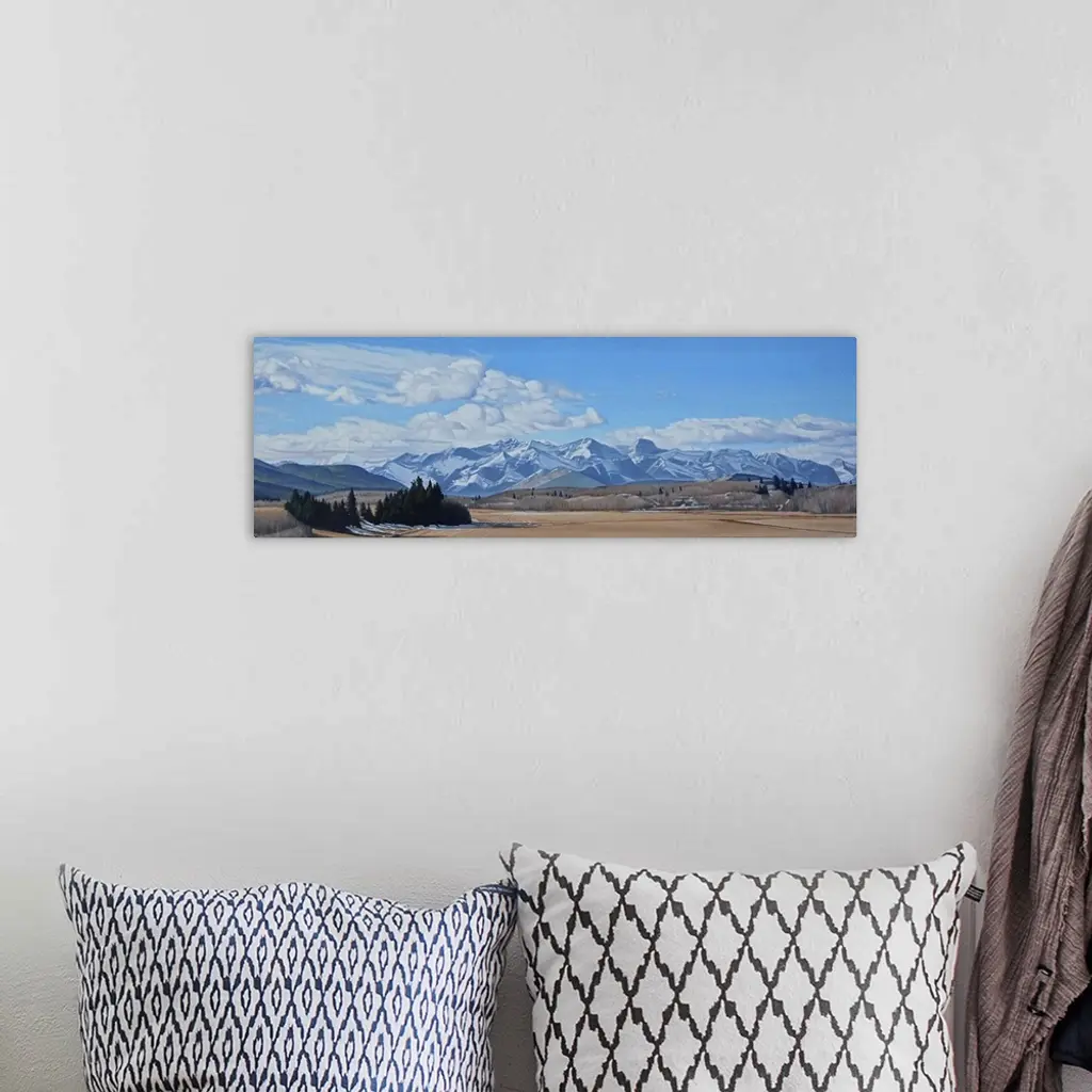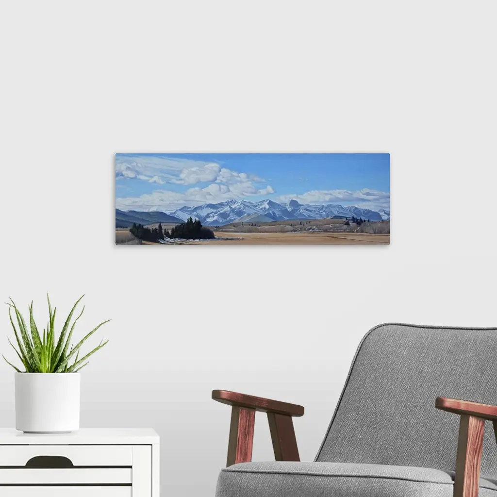 Contemporary painting of an idyllic mountainous landscape in autumn.
