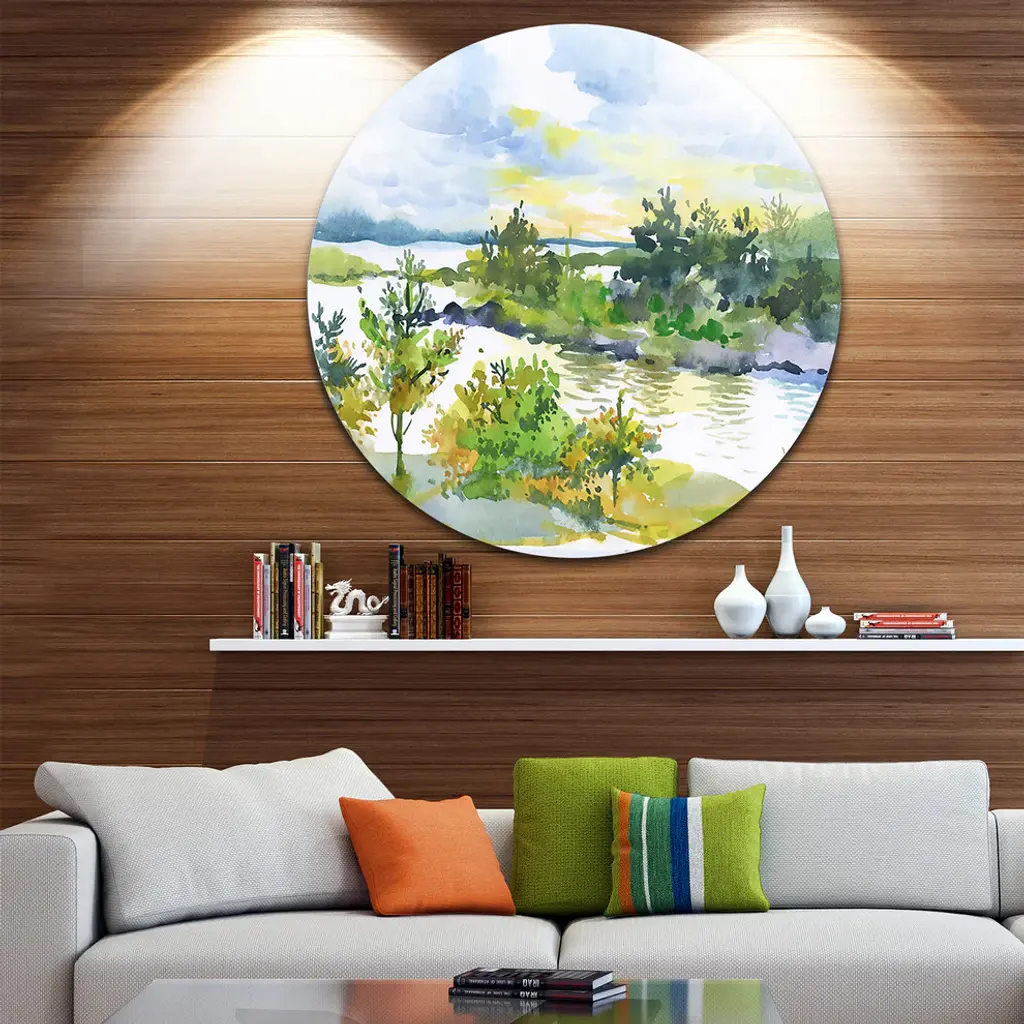 Bring Contemporary Abstraction to your home with this large Circle Metal wall art. This Autumn Forest and Lake Watercolor Metal Artwork makes it the focal point of any room or office. - White Gloss Coating ensures colors are extra vibrant with light reflection.- Aluminum grade Sheet Metal with 1 inch mounting frame on the back giving the illusion that the artwork is floating on the wall..- Mounting Brackets are included along with instructions.- High Quality Digital images are created directly into a glossy aluminum panel producing a stunning and captivating print into the glossy finish of the metal.- Water, Fire and Scratch resistant HD Aluminum panels.- Looks better than any photo paper and guaranteed to last at least 20 years- Easy to clean with a microfiber cloth. Colors are far superior to regular Canvas Art. - Easy to Hang