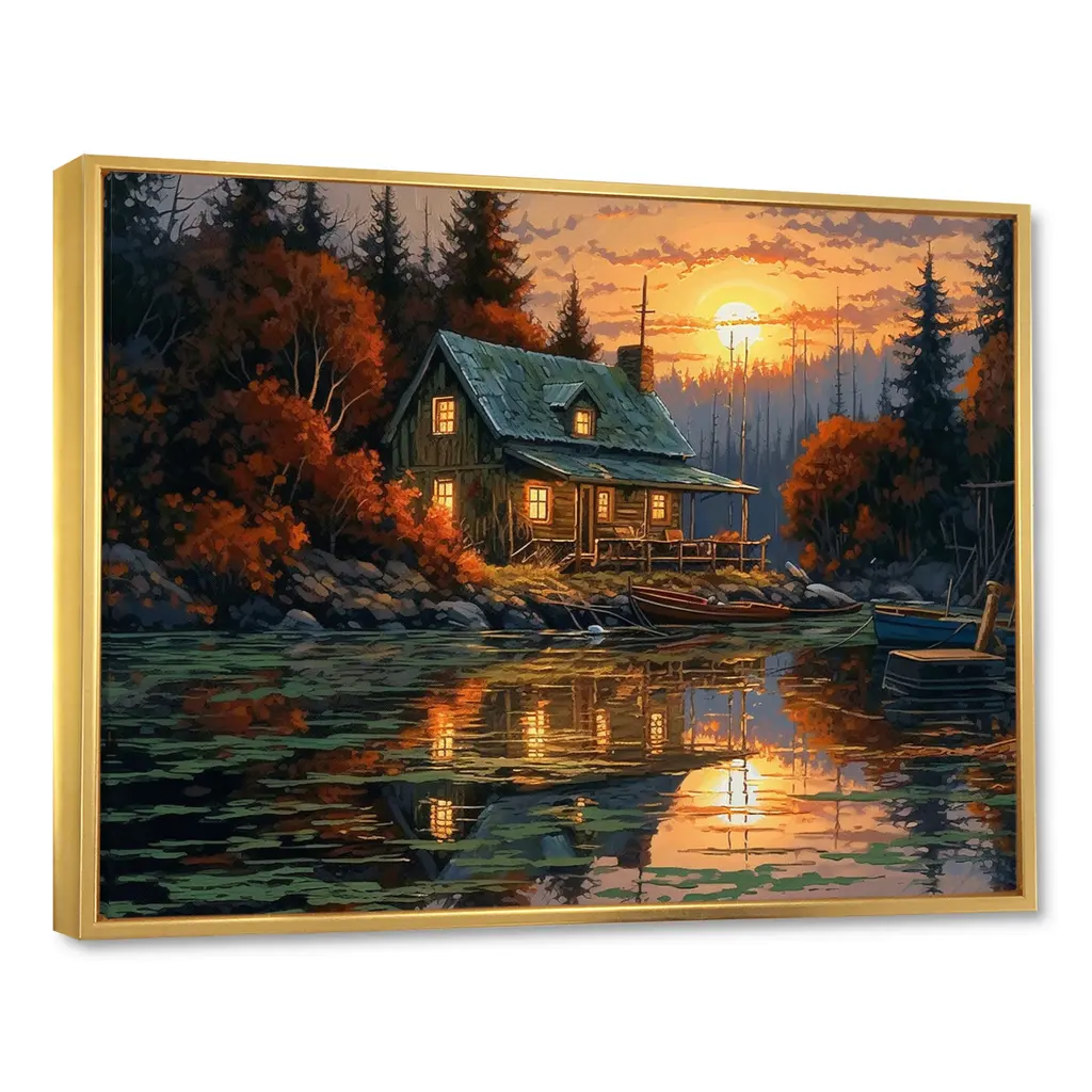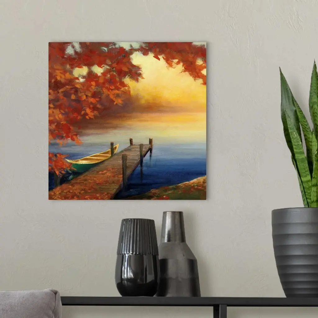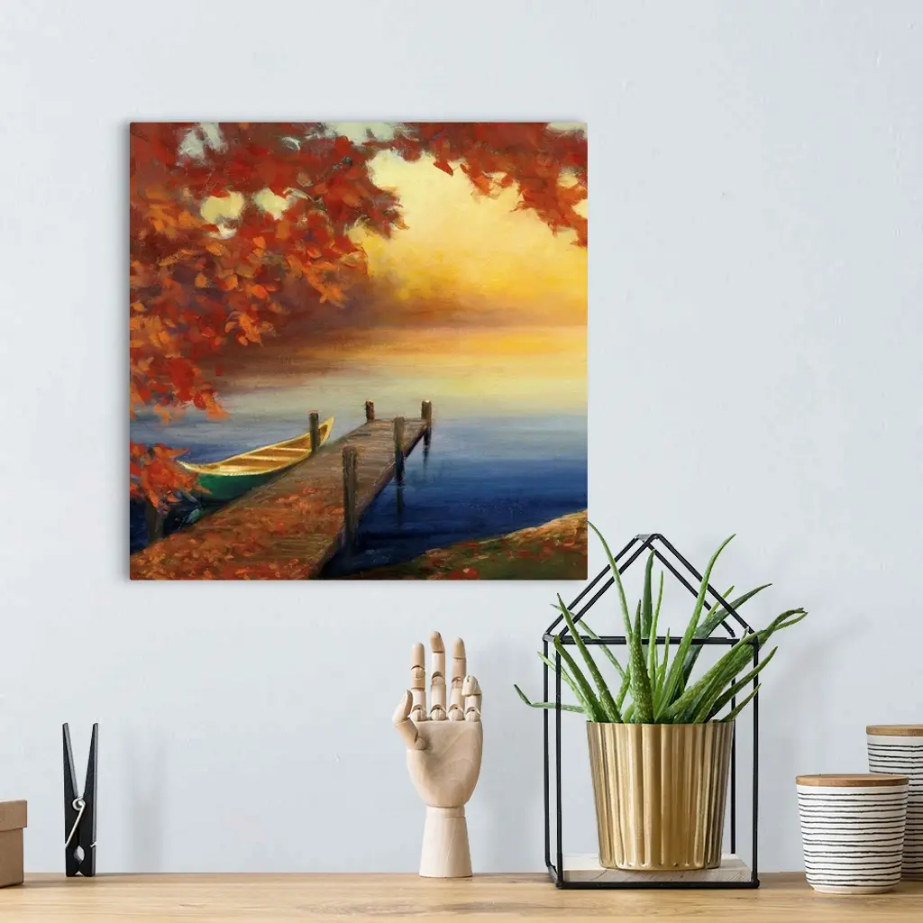 Contemporary artwork of a small pier with a boat in a lake with fall leaves.