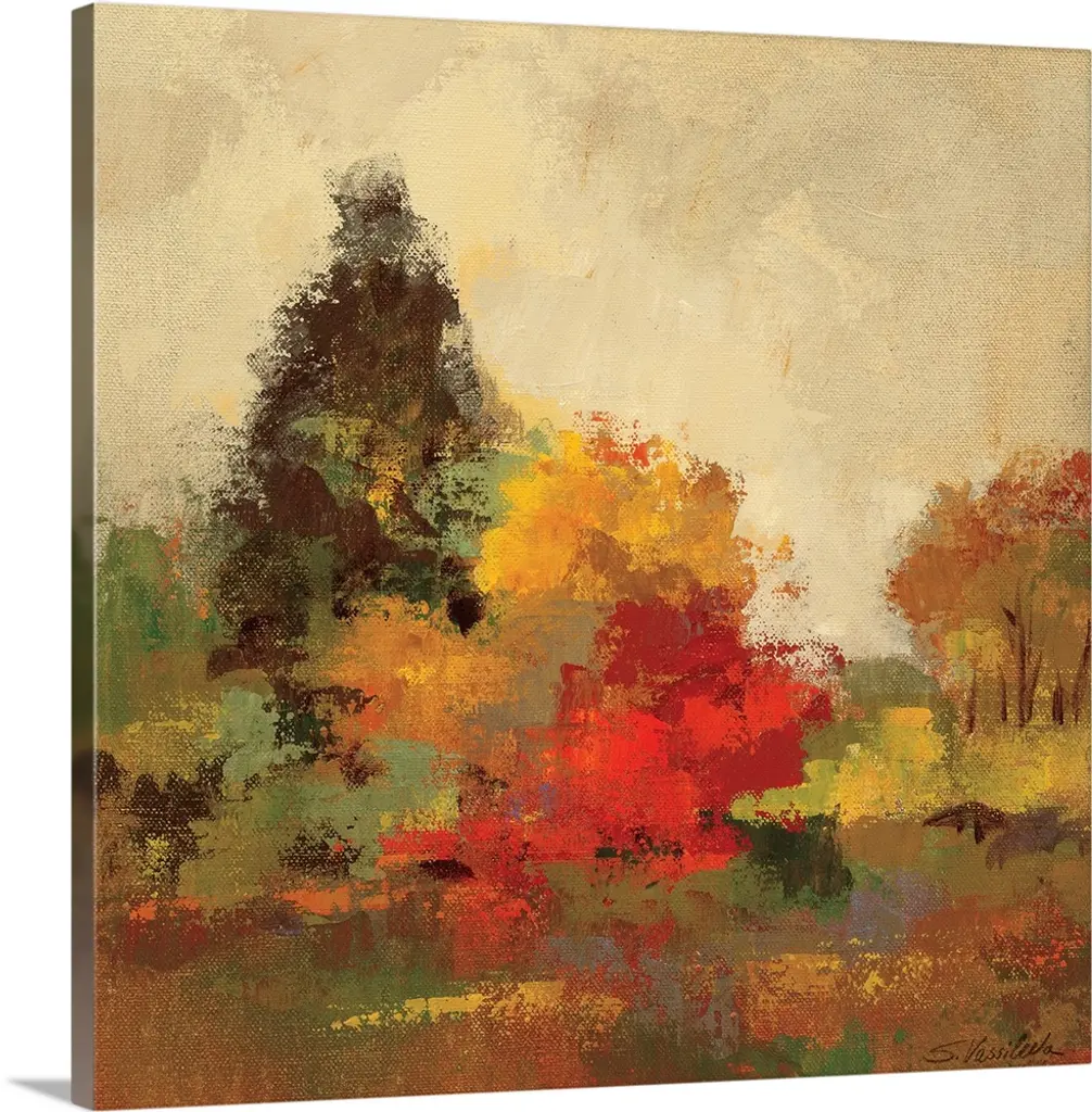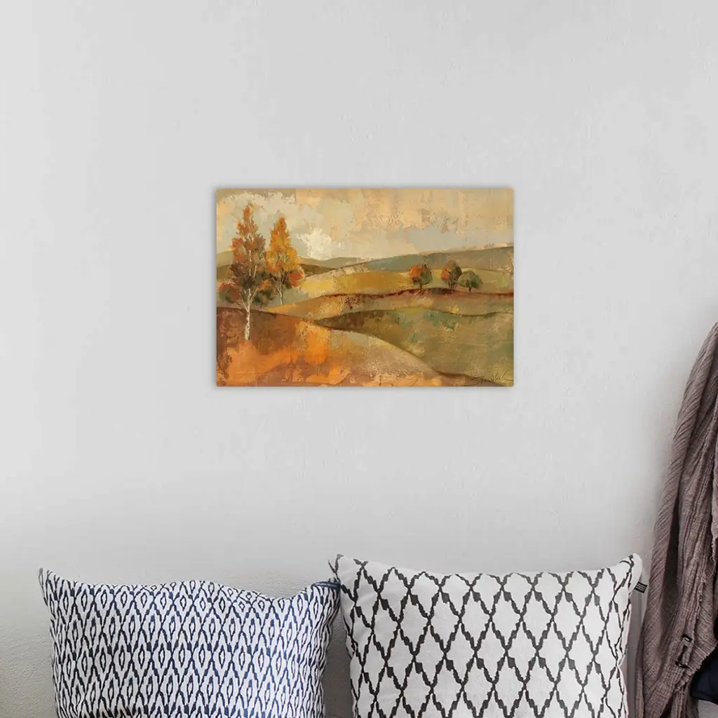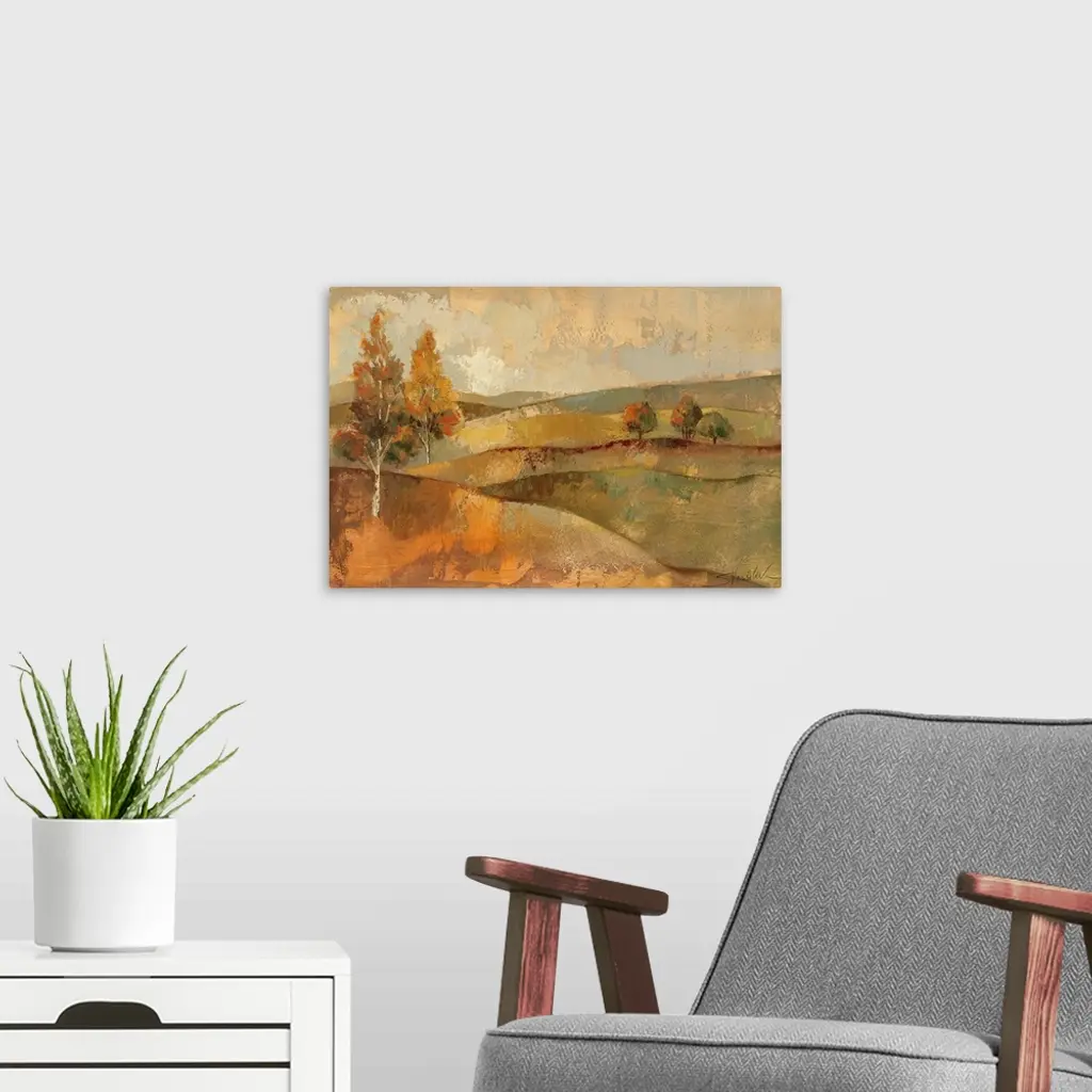 Painting of rolling hills dotted with occassional trees. Rough texture throughout.