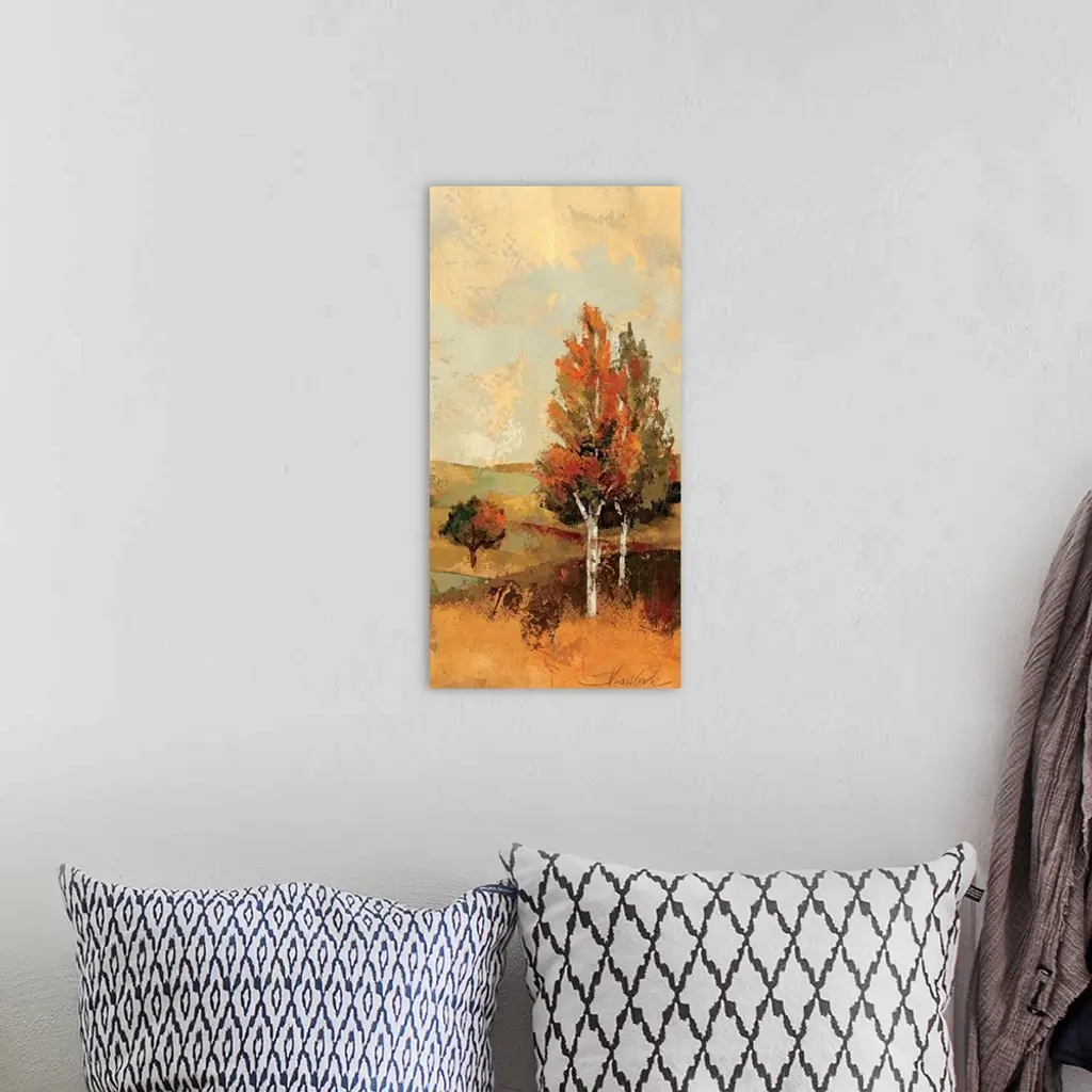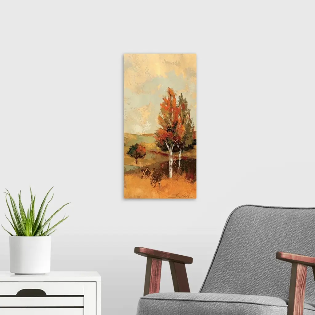 Portrait, large wall painting of a fall scene of rolling hills and several trees with autumn colored leaves, against a partly cloudy sky. Painted with sponge like texture, with rough edges.