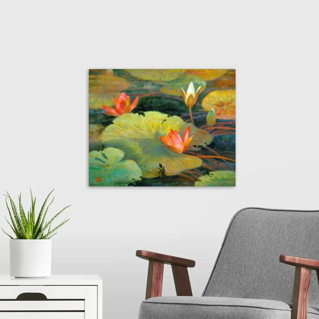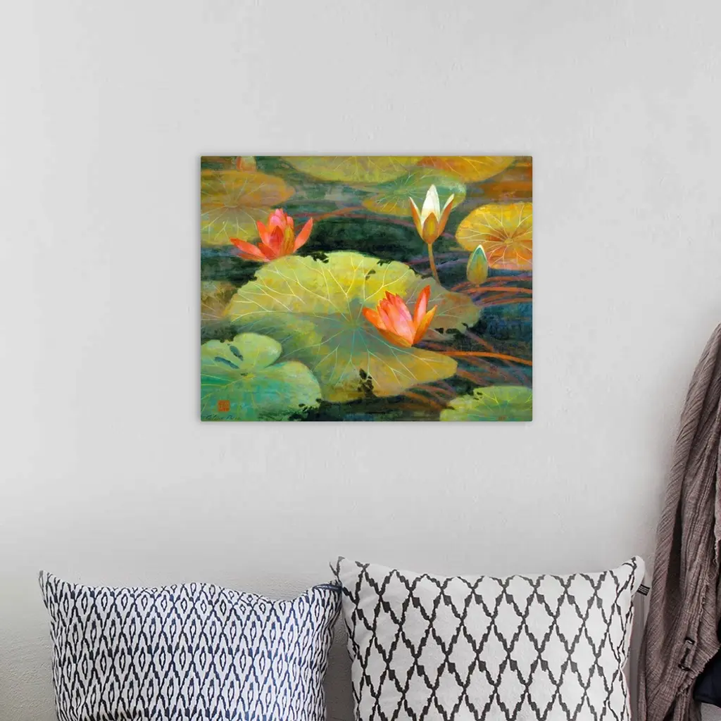 This is a horizontal, contemporary painting full of detail of lily pads and lotus blossoms floating in a murky pond.