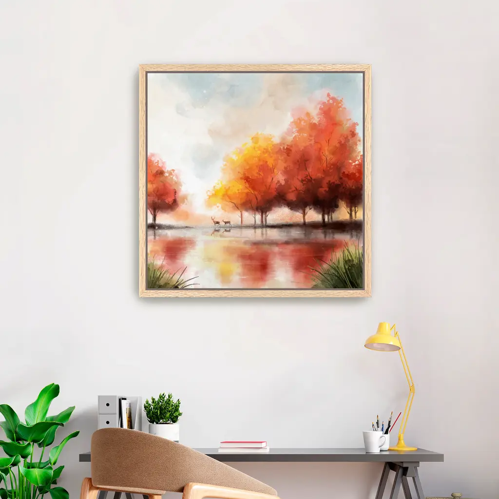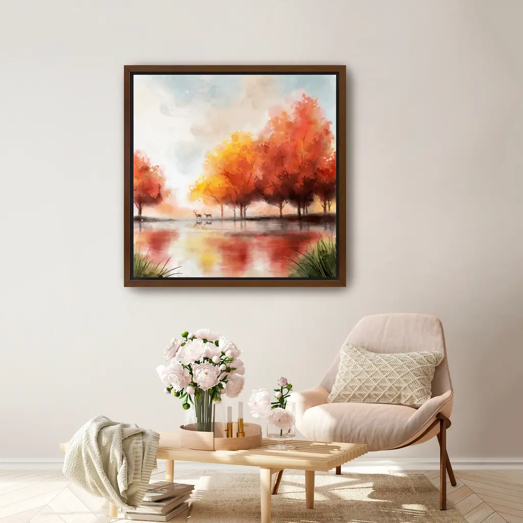 Autumn Lake And Deers Canvas Giclee - Framed / Dark Walnut / 40x40