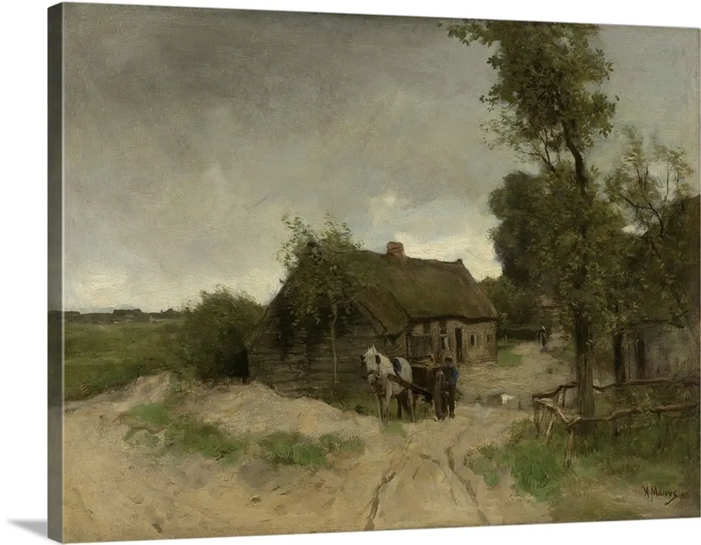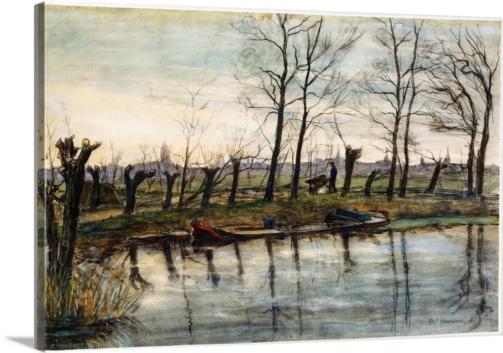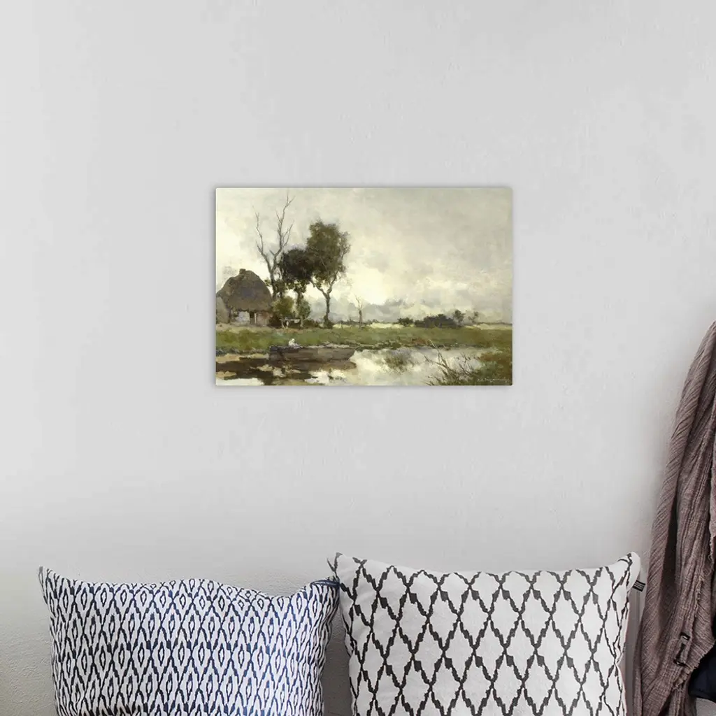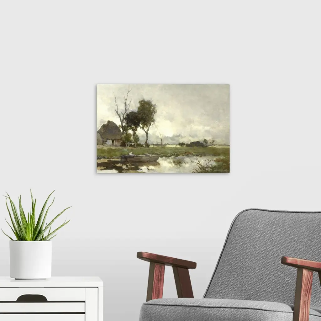 Autumn Landscape, by Johan Hendrik Weissenbruch, c. 1875-1903, Dutch painting, oil on canvas. Polder landscape of drained river delta lands with a small farm under trees.