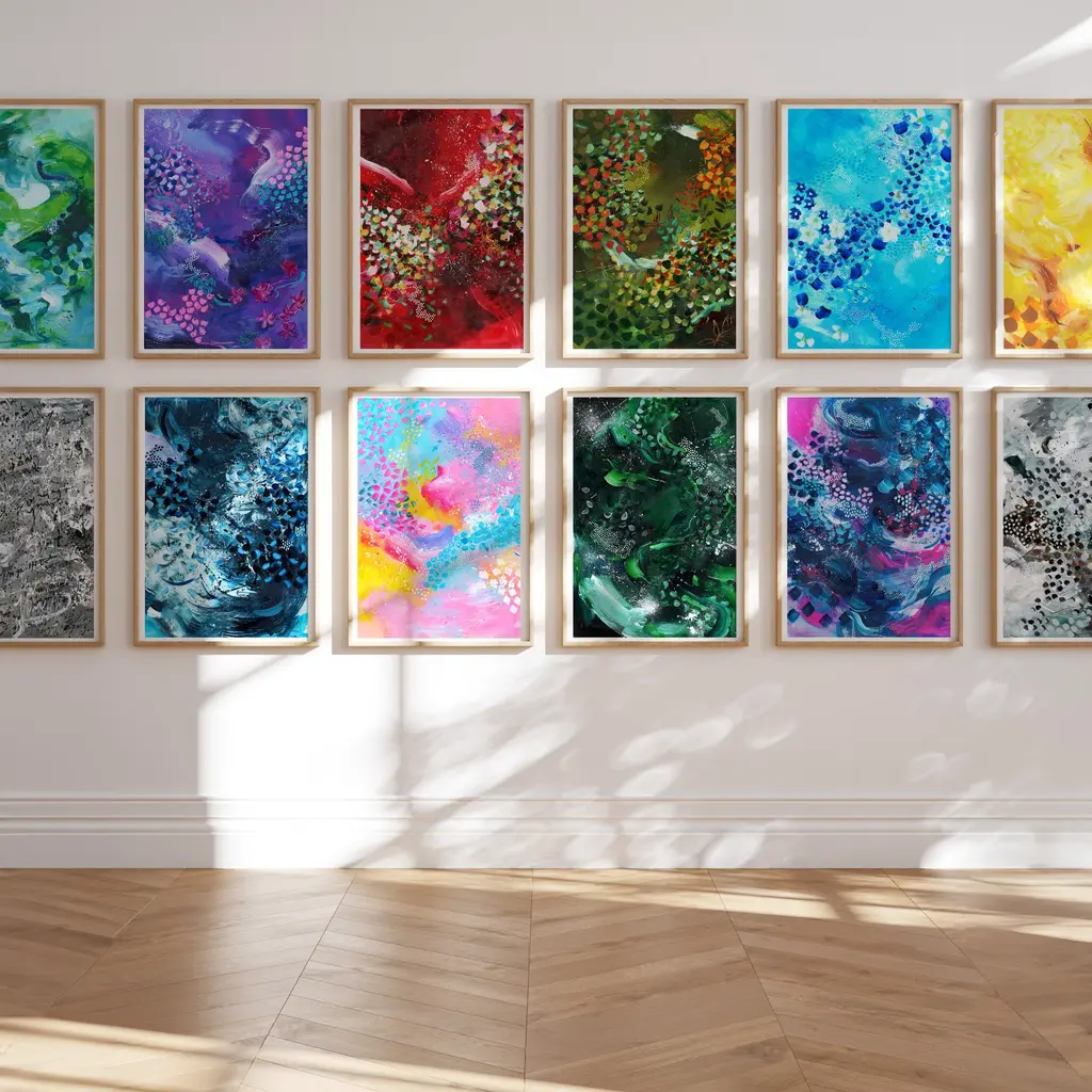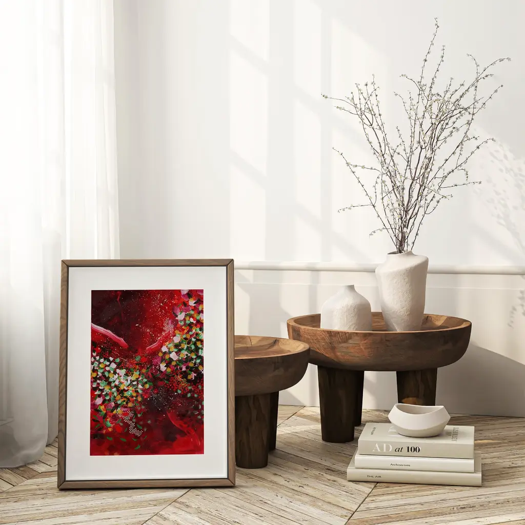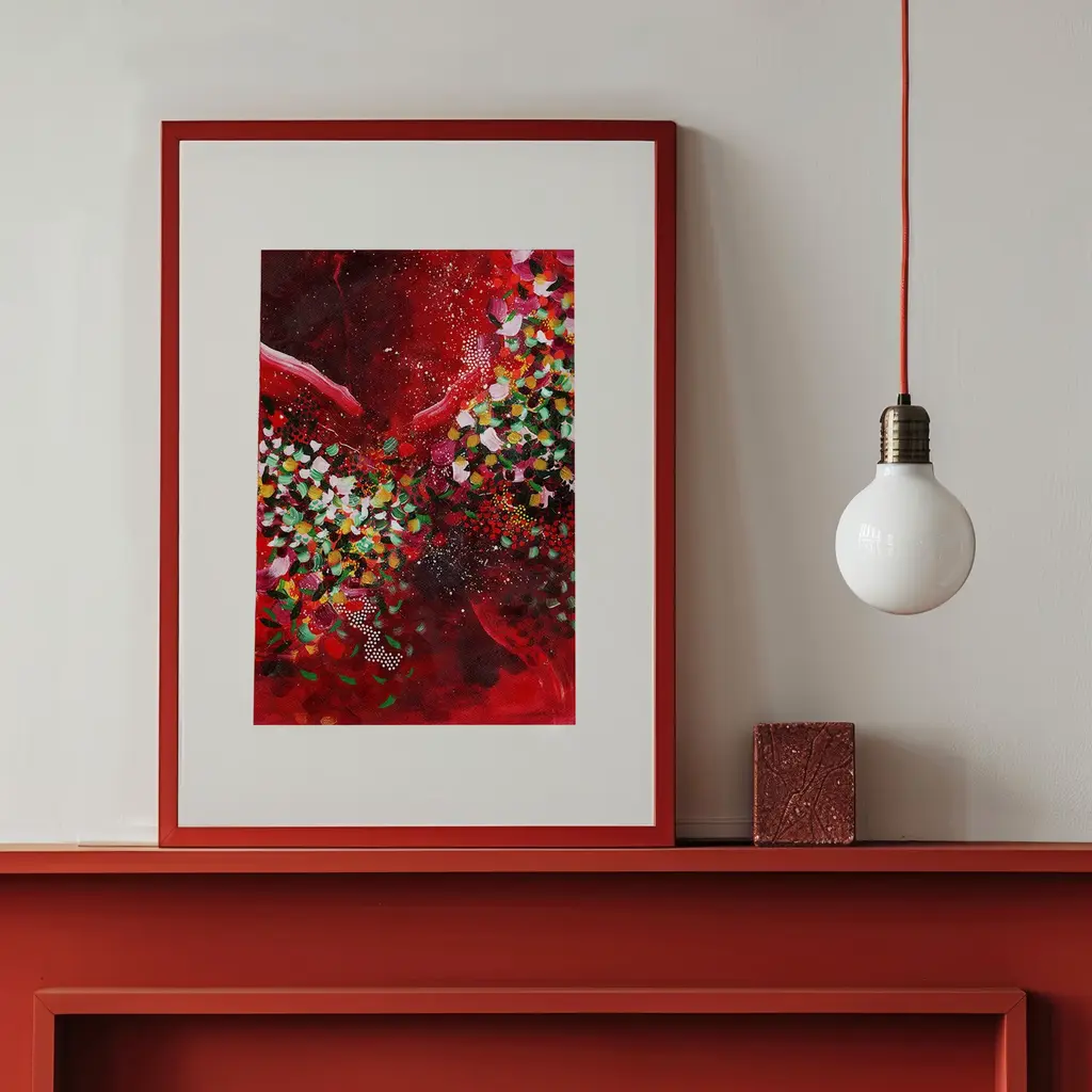 Influenced by 'All Too Well', this print has a dramatic sense of tumult and intensity with fiery reds and maroons. A visual representation of love, heartbreak, and its turbulent highs and lows. Flecks of white against the vivid maroons capture the lyric 'you and I fell like an early spring snow' whilst 'autumn leaves falling down like pieces into place' inspired the brushstrokes that capture falling autumnal leaves.Printed on heavyweight 316gsm cotton rag textured paper using archival-quality inks, this limited edition A4 giclée print will maintain its beautiful vibrancy for many years to come. Each print has a white border so it can easily fit into a standard size frame. Print is sold unframed.