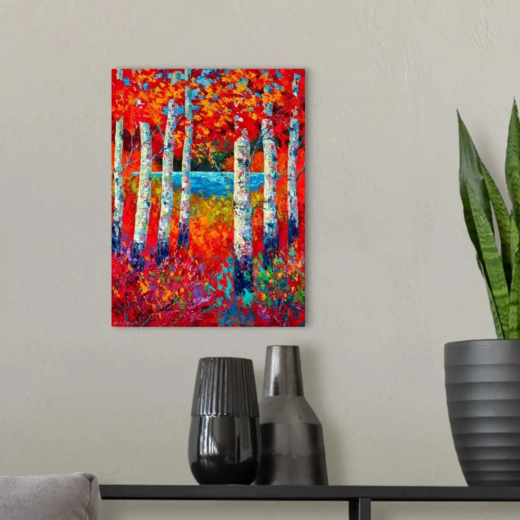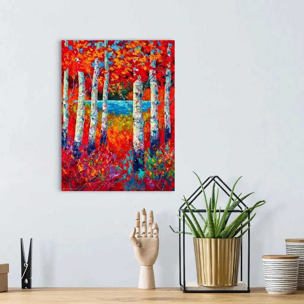 This vertical painting depicts fall colors surrounding birch trees with a small river in the background.