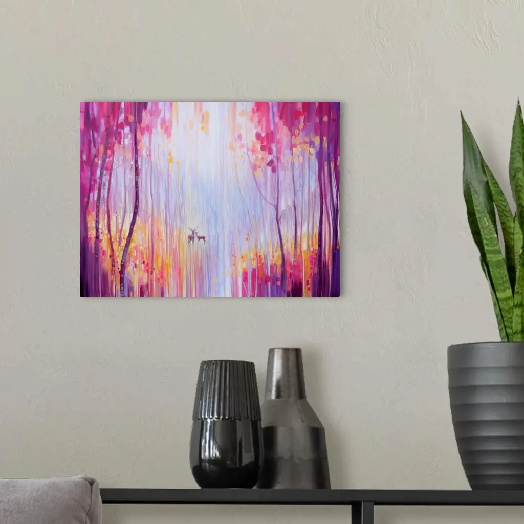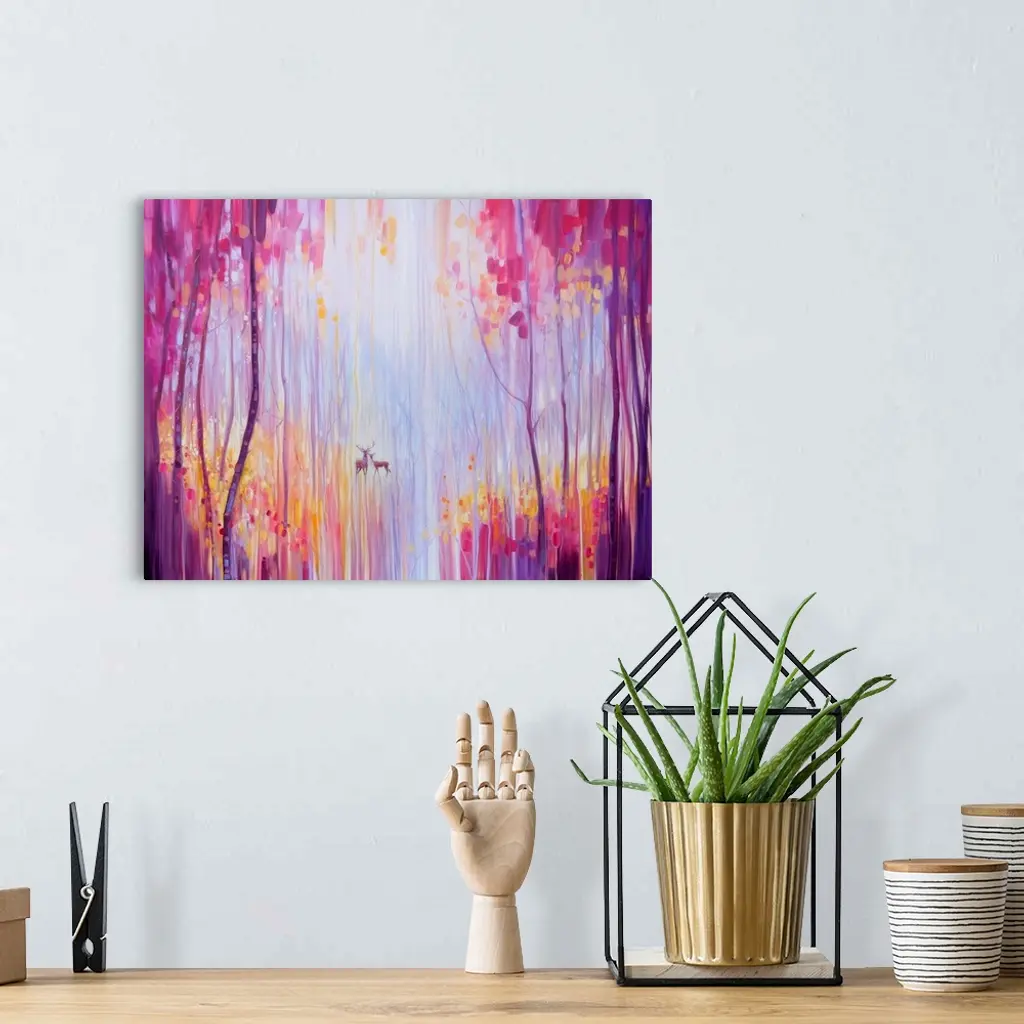 Watercolor painting of deer, deep within a colorful, dream-like forest.