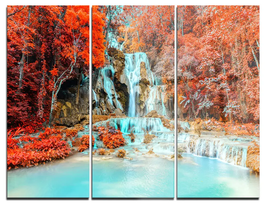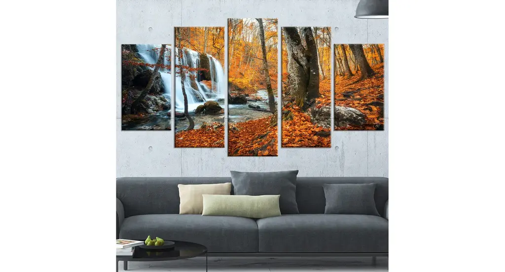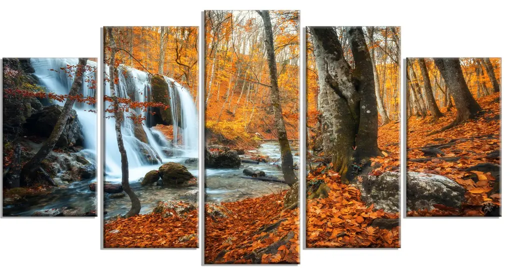 "Autumn Mountain Waterfall Close View" Landscape Photo Art, 5 Panels, 60"x32"