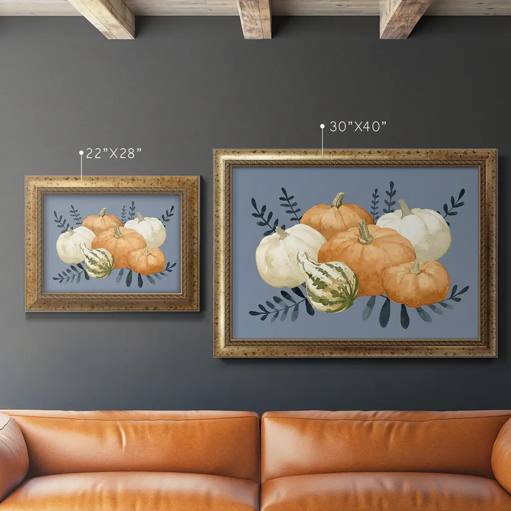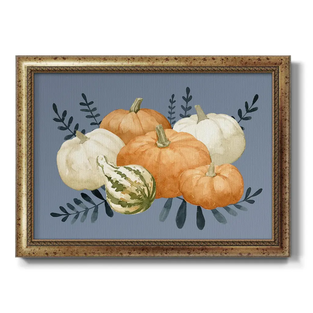 Autumn Orange & Blues I Premium Framed Canvas- Ready to Hang A Premium Framed Canvas created to last. Framed in distressed wood and available in an array of sizes and colors Featuring a beveled a solid wood stretcher bar, each piece comes ready to hand 3 SIZES AVAILABLE 16''X20'' - Overall Size 18'X27'' - Overall Size 24''x36'' - Overall Size Each piece is made to order. Each piece comes with hanging hardware. Made in the USA Ready to Hang Giclee Paper Print Acrylic Glass Beveled Matt Board