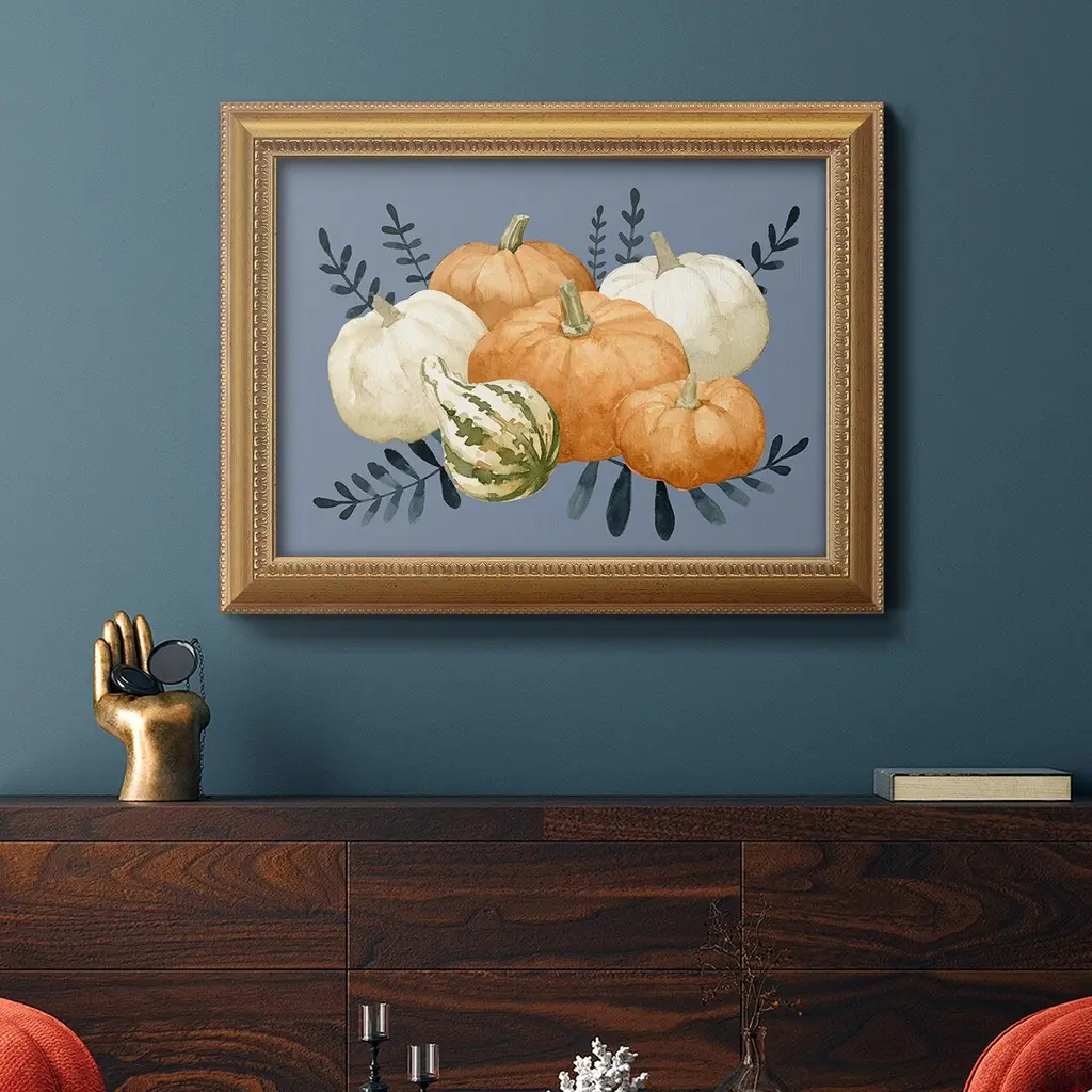 Autumn Orange & Blues I Premium Framed Canvas- Ready to Hang A Premium Framed Canvas created to last. Framed in distressed wood and available in an array of sizes and colors Featuring a beveled a solid wood stretcher bar, each piece comes ready to hand 3 SIZES AVAILABLE 16''X20'' - Overall Size 18'X27'' - Overall Size 24''x36'' - Overall Size Each piece is made to order. Each piece comes with hanging hardware. Made in the USA Ready to Hang Giclee Paper Print Acrylic Glass Beveled Matt Board