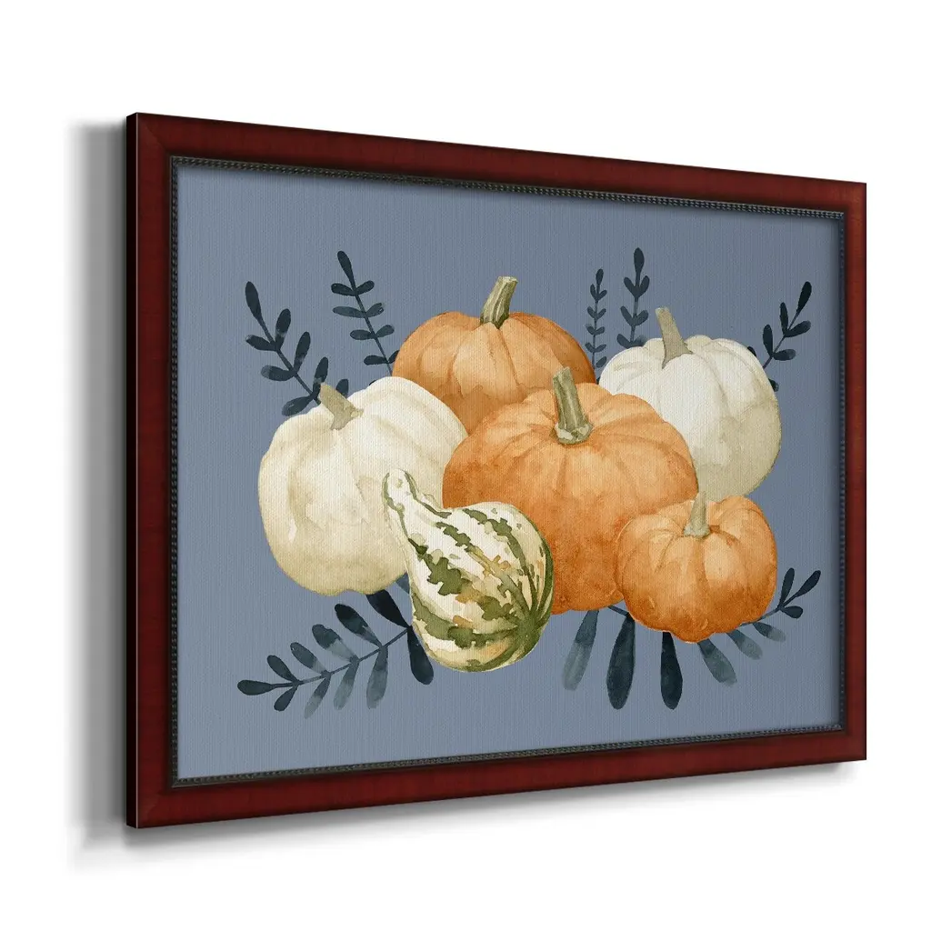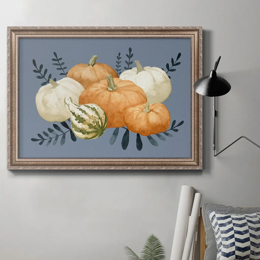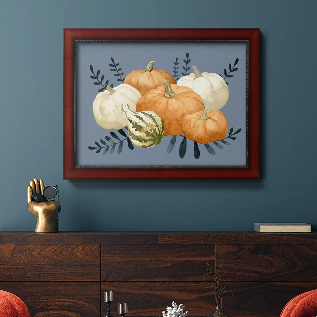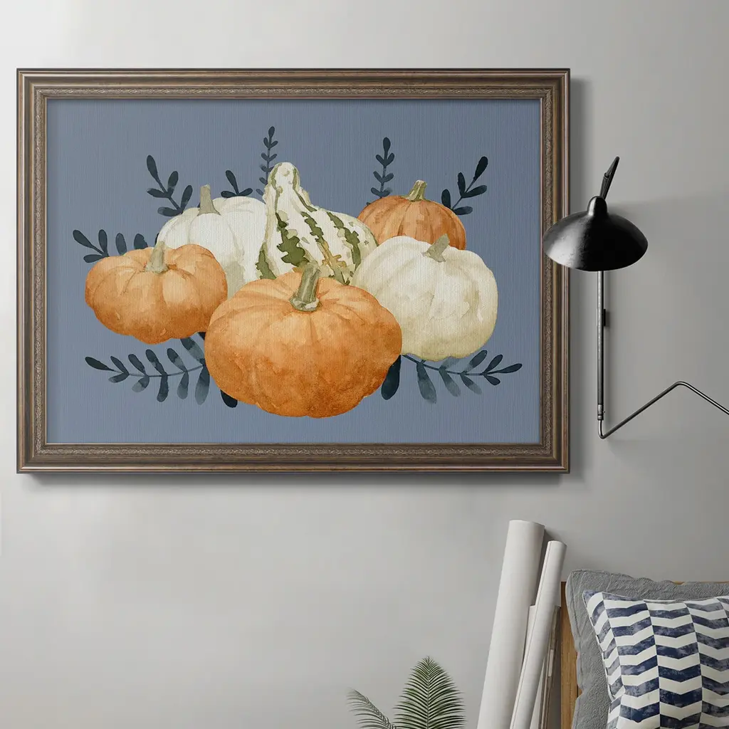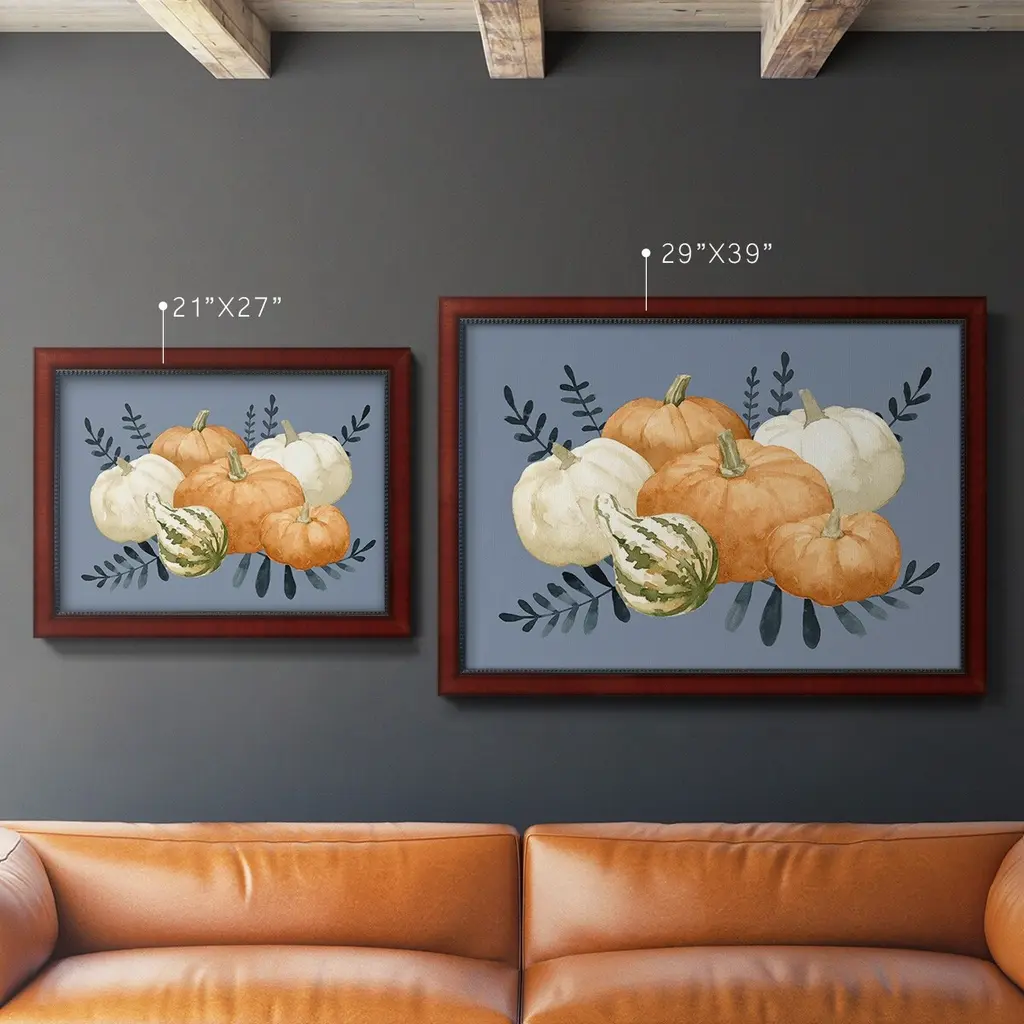 Autumn Orange & Blues I Premium Framed Canvas- Ready to Hang A Premium Framed Canvas created to last. Framed in distressed wood and available in an array of sizes and colors Featuring a beveled a solid wood stretcher bar, each piece comes ready to hand 3 SIZES AVAILABLE 16''X20'' - Overall Size 18'X27'' - Overall Size 24''x36'' - Overall Size Each piece is made to order. Each piece comes with hanging hardware. Made in the USA Ready to Hang Giclee Paper Print Acrylic Glass Beveled Matt Board