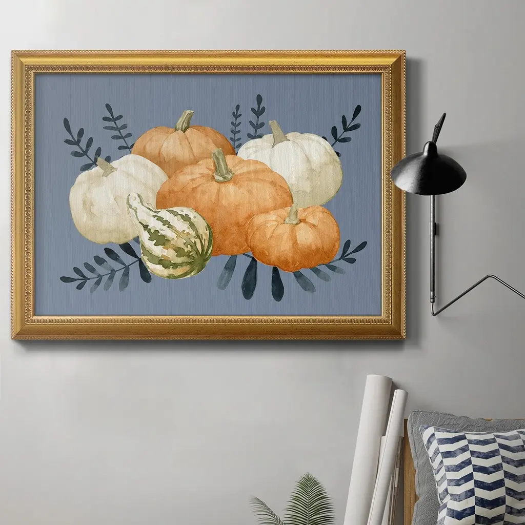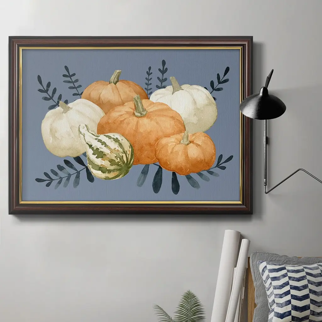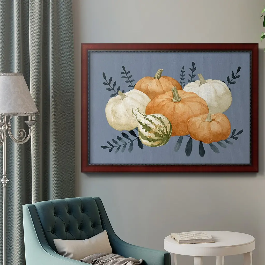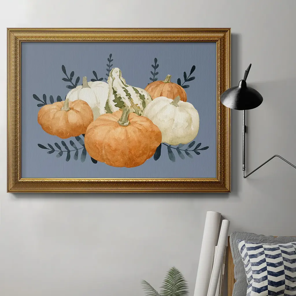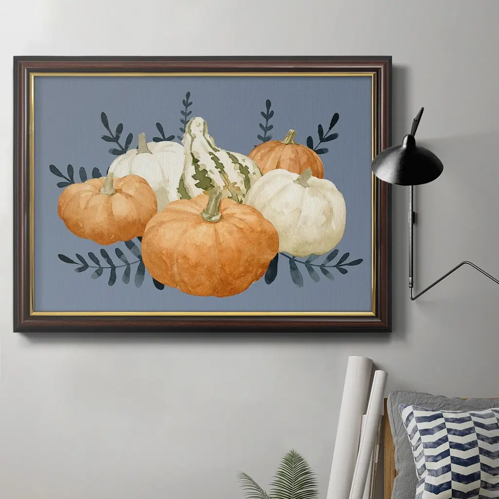 Autumn Orange & Blues I Premium Framed Canvas- Ready to Hang A Premium Framed Canvas created to last. Framed in distressed wood and available in an array of sizes and colors Featuring a beveled a solid wood stretcher bar, each piece comes ready to hand 3 SIZES AVAILABLE 16''X20'' - Overall Size 18'X27'' - Overall Size 24''x36'' - Overall Size Each piece is made to order. Each piece comes with hanging hardware. Made in the USA Ready to Hang Giclee Paper Print Acrylic Glass Beveled Matt Board