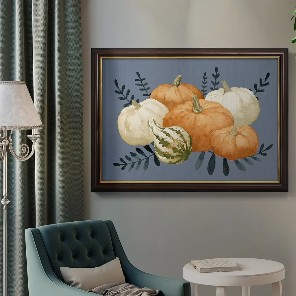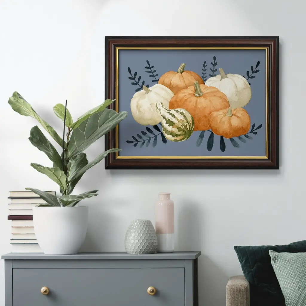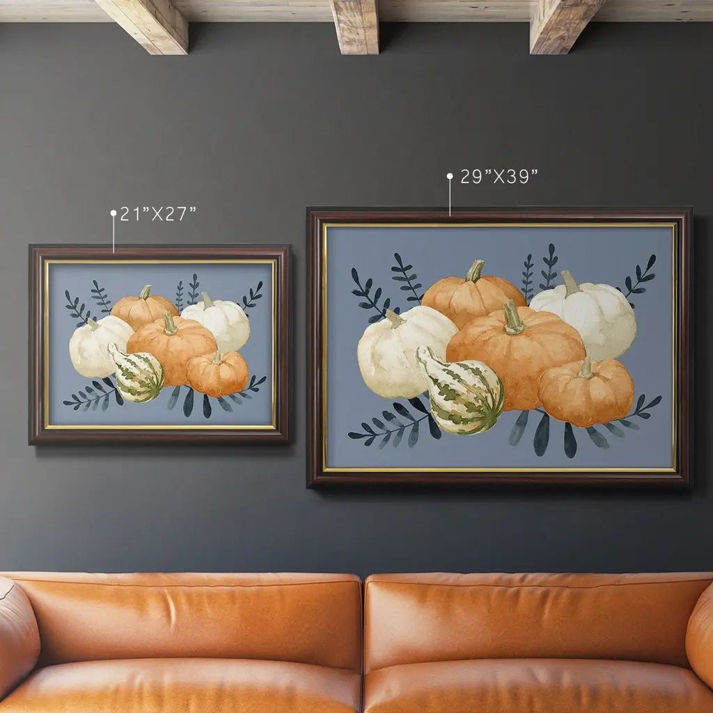 Autumn Orange & Blues I Premium Framed Canvas- Ready to Hang A Premium Framed Canvas created to last. Framed in distressed wood and available in an array of sizes and colors Featuring a beveled a solid wood stretcher bar, each piece comes ready to hand 3 SIZES AVAILABLE 16''X20'' - Overall Size 18'X27'' - Overall Size 24''x36'' - Overall Size Each piece is made to order. Each piece comes with hanging hardware. Made in the USA Ready to Hang Giclee Paper Print Acrylic Glass Beveled Matt Board