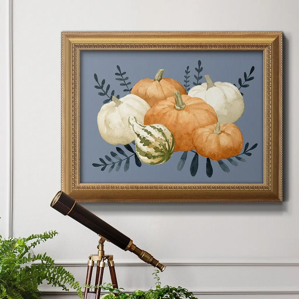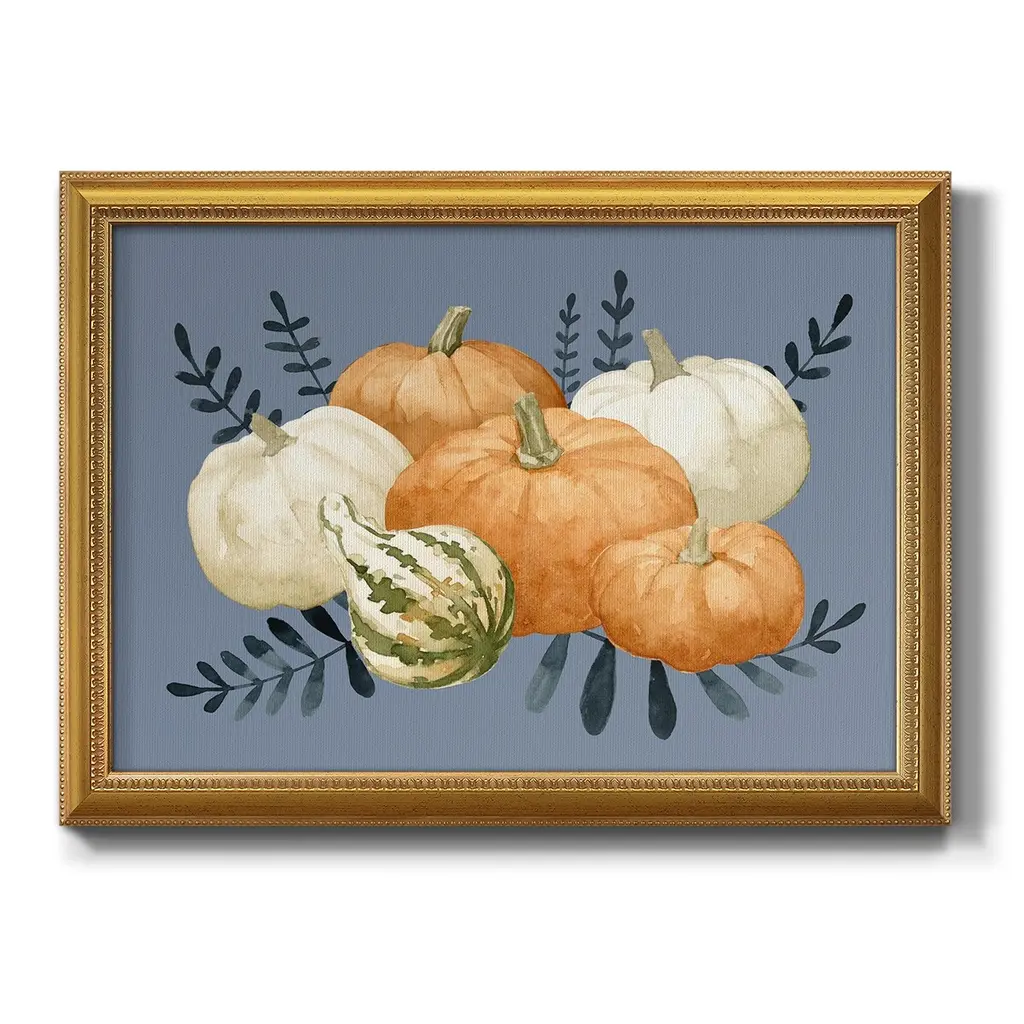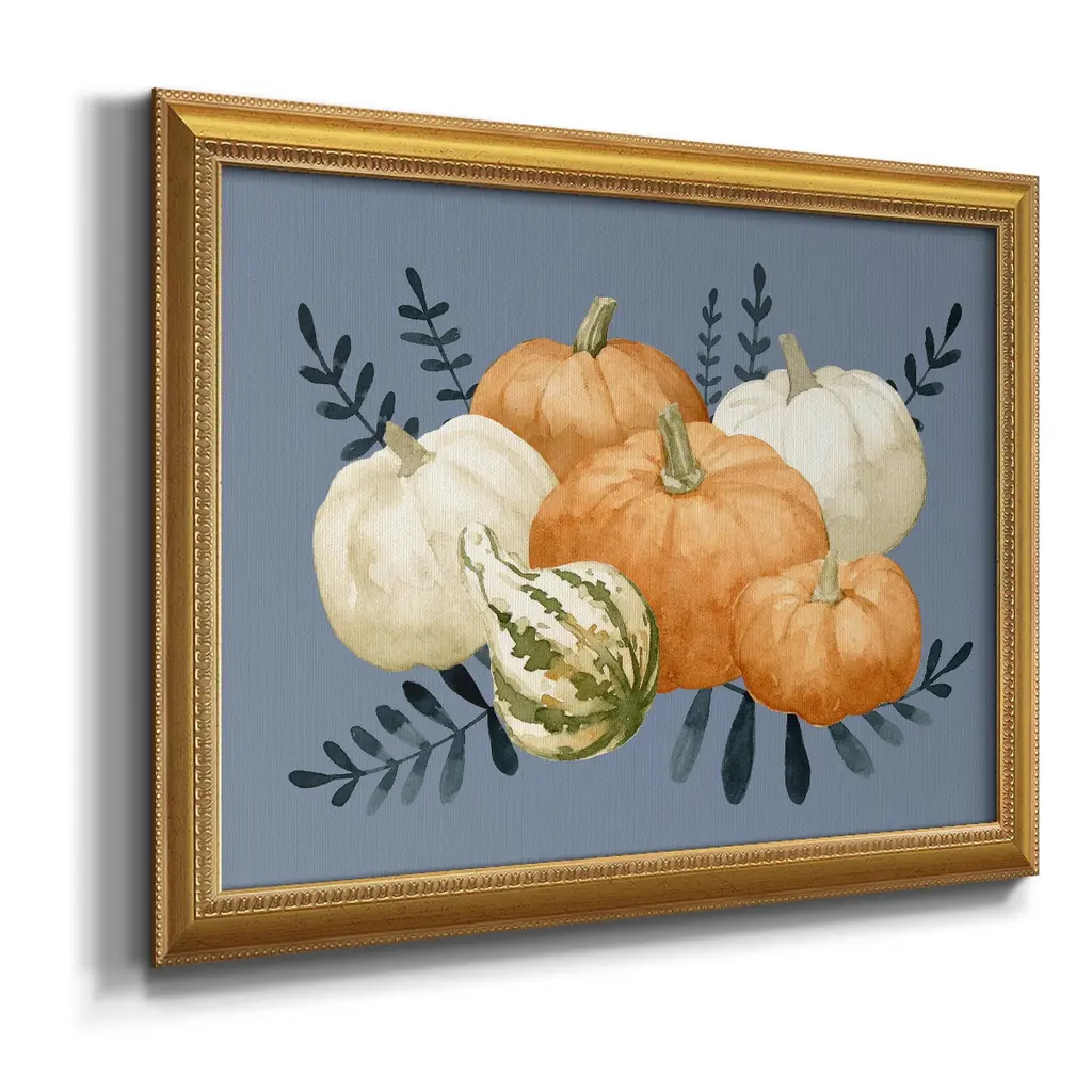 Autumn Orange & Blues I Premium Framed Canvas- Ready to Hang A Premium Framed Canvas created to last. Framed in distressed wood and available in an array of sizes and colors Featuring a beveled a solid wood stretcher bar, each piece comes ready to hand 3 SIZES AVAILABLE 16''X20'' - Overall Size 18'X27'' - Overall Size 24''x36'' - Overall Size Each piece is made to order. Each piece comes with hanging hardware. Made in the USA Ready to Hang Giclee Paper Print Acrylic Glass Beveled Matt Board