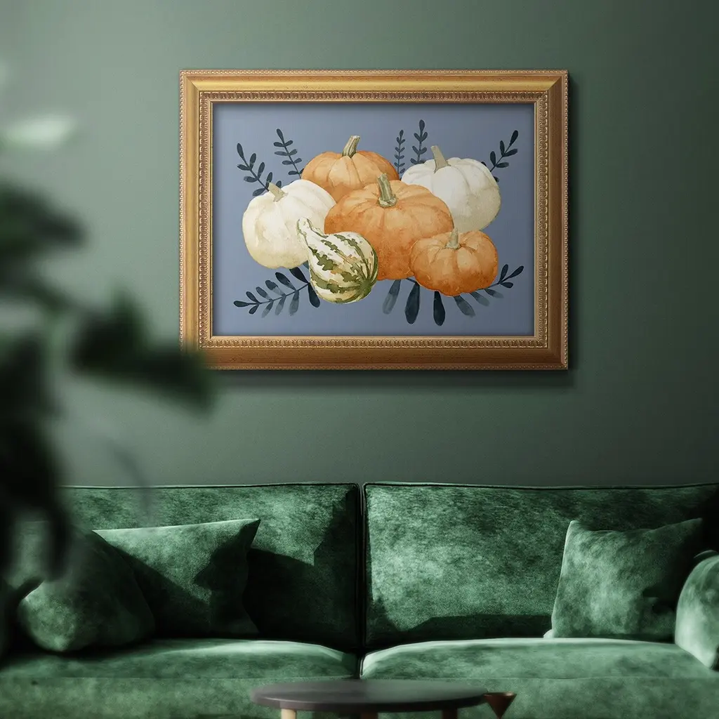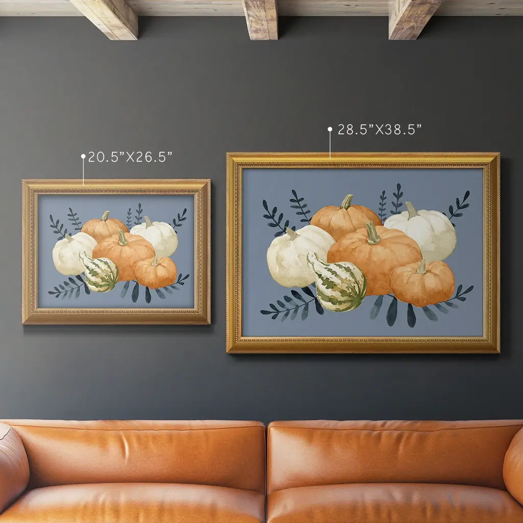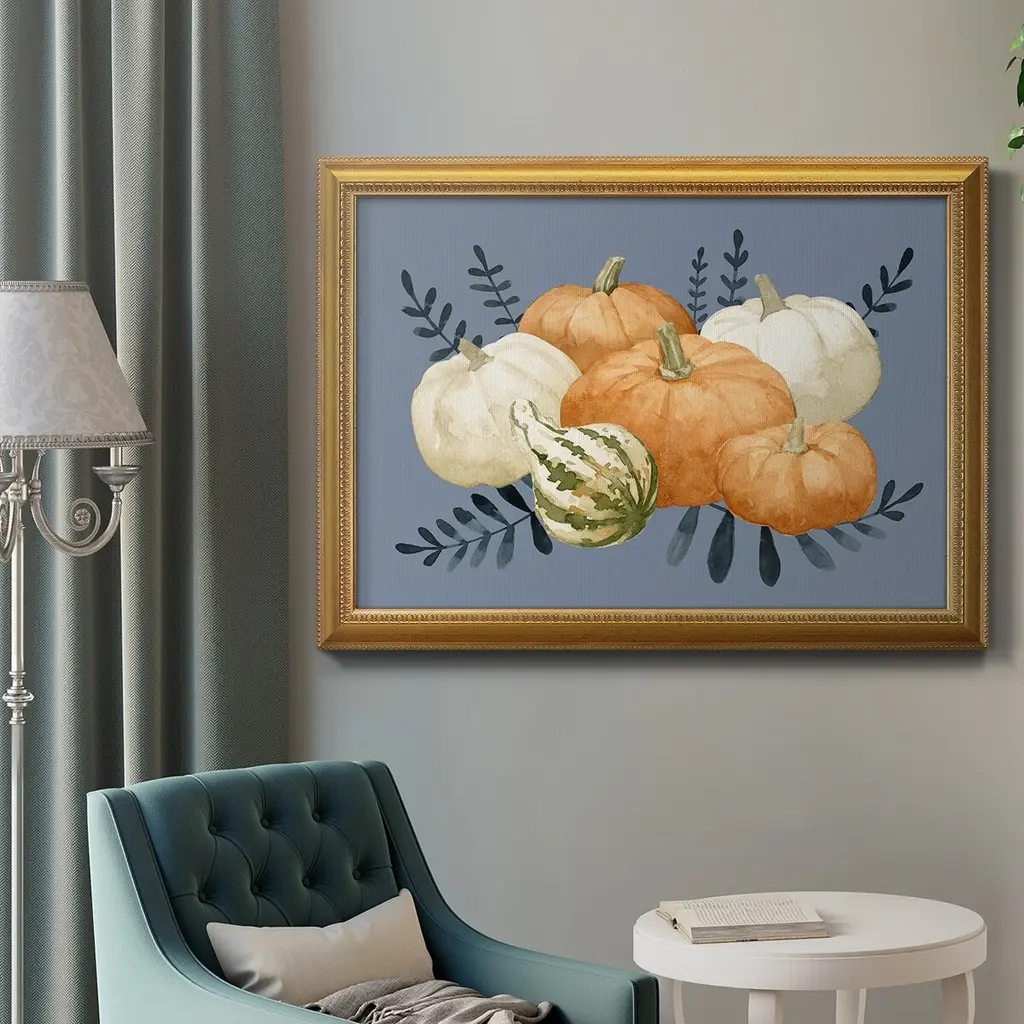 Autumn Orange & Blues I Premium Framed Canvas- Ready to Hang A Premium Framed Canvas created to last. Framed in distressed wood and available in an array of sizes and colors Featuring a beveled a solid wood stretcher bar, each piece comes ready to hand 3 SIZES AVAILABLE 16''X20'' - Overall Size 18'X27'' - Overall Size 24''x36'' - Overall Size Each piece is made to order. Each piece comes with hanging hardware. Made in the USA Ready to Hang Giclee Paper Print Acrylic Glass Beveled Matt Board