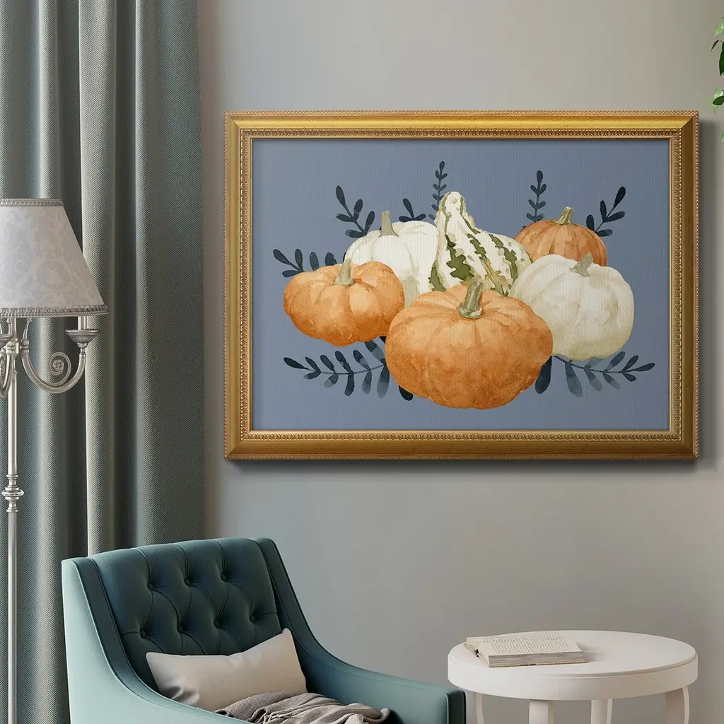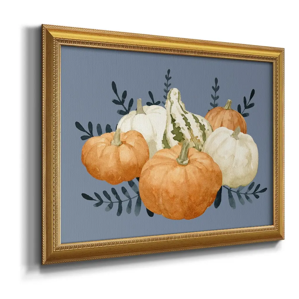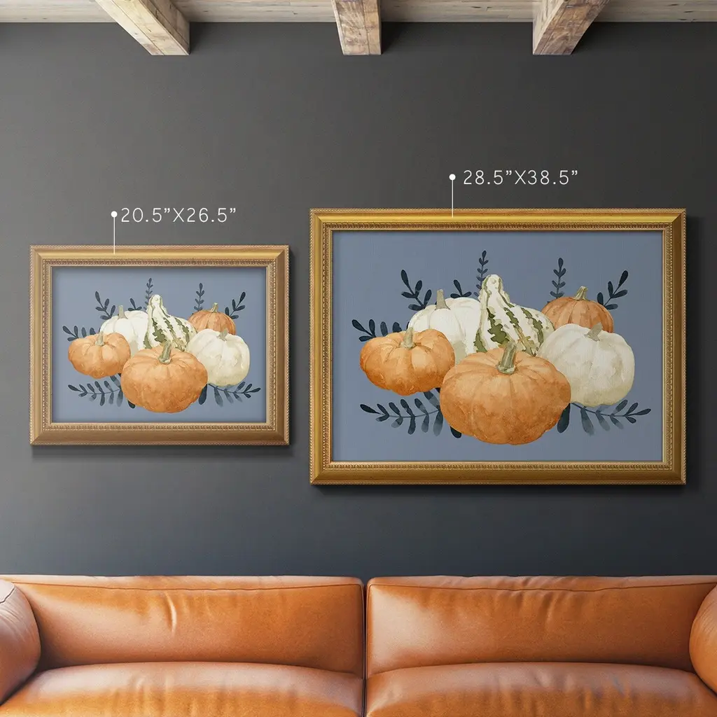 Autumn Orange & Blues II Premium Framed Canvas- Ready to Hang A Premium Framed Canvas created to last. Framed in distressed wood and available in an array of sizes and colors Featuring a beveled a solid wood stretcher bar, each piece comes ready to hand 3 SIZES AVAILABLE 16''X20'' - Overall Size 18'X27'' - Overall Size 24''x36'' - Overall Size Each piece is made to order. Each piece comes with hanging hardware. Made in the USA Ready to Hang Giclee Paper Print Acrylic Glass Beveled Matt Board