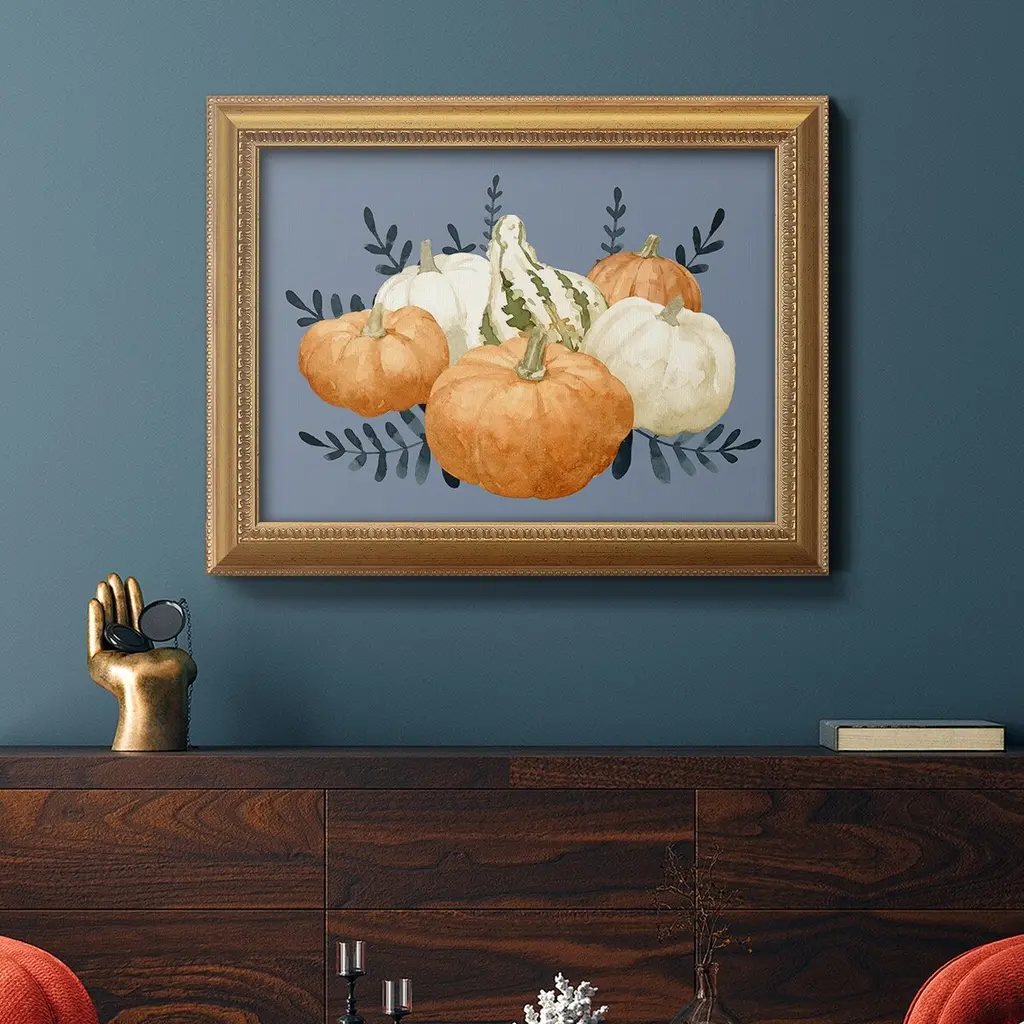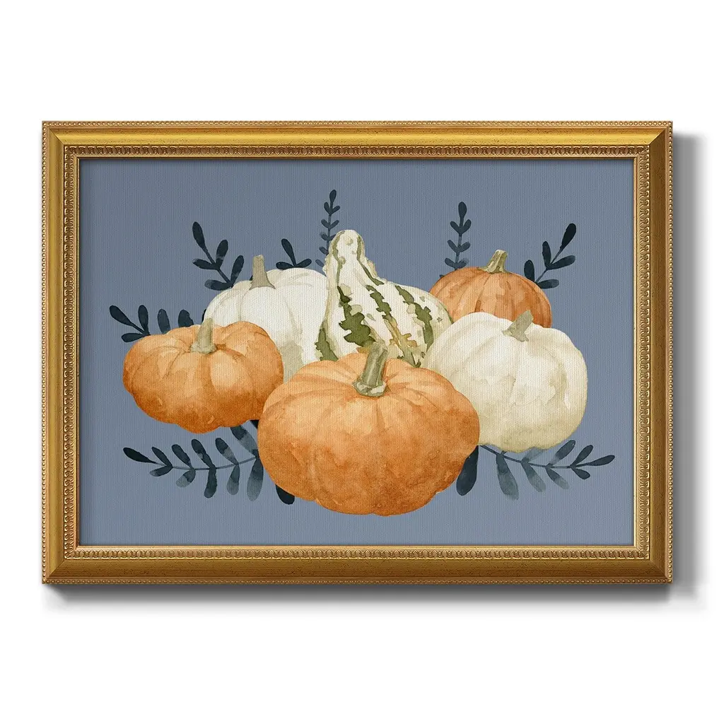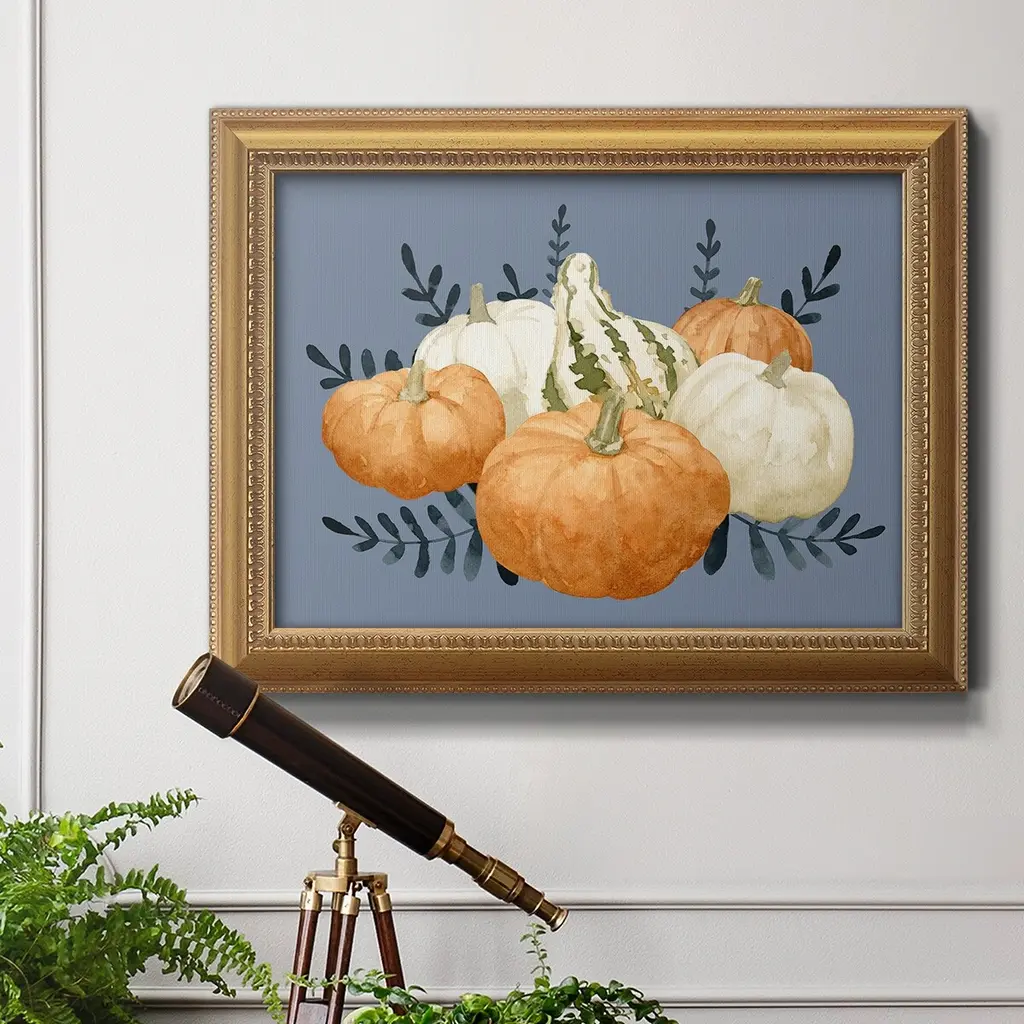 Autumn Orange & Blues II Premium Framed Canvas- Ready to Hang A Premium Framed Canvas created to last. Framed in distressed wood and available in an array of sizes and colors Featuring a beveled a solid wood stretcher bar, each piece comes ready to hand 3 SIZES AVAILABLE 16''X20'' - Overall Size 18'X27'' - Overall Size 24''x36'' - Overall Size Each piece is made to order. Each piece comes with hanging hardware. Made in the USA Ready to Hang Giclee Paper Print Acrylic Glass Beveled Matt Board